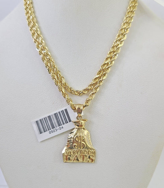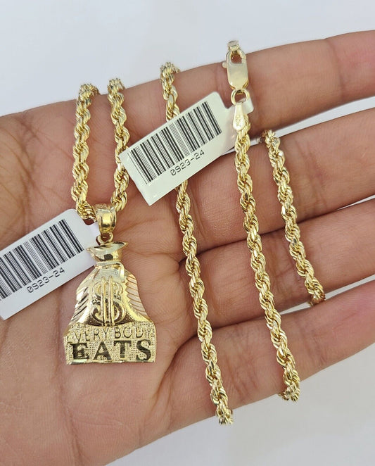 10kt Yellow Gold Rope Chain Everybody Eats Charm Pendant 18-28 Inch Necklace 3mm