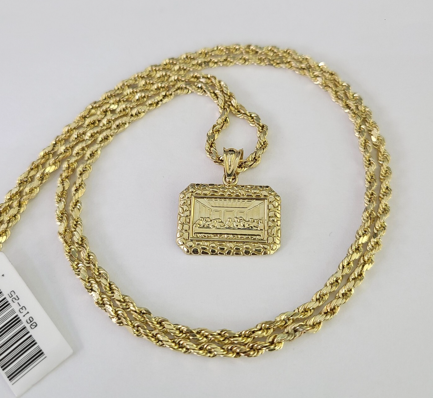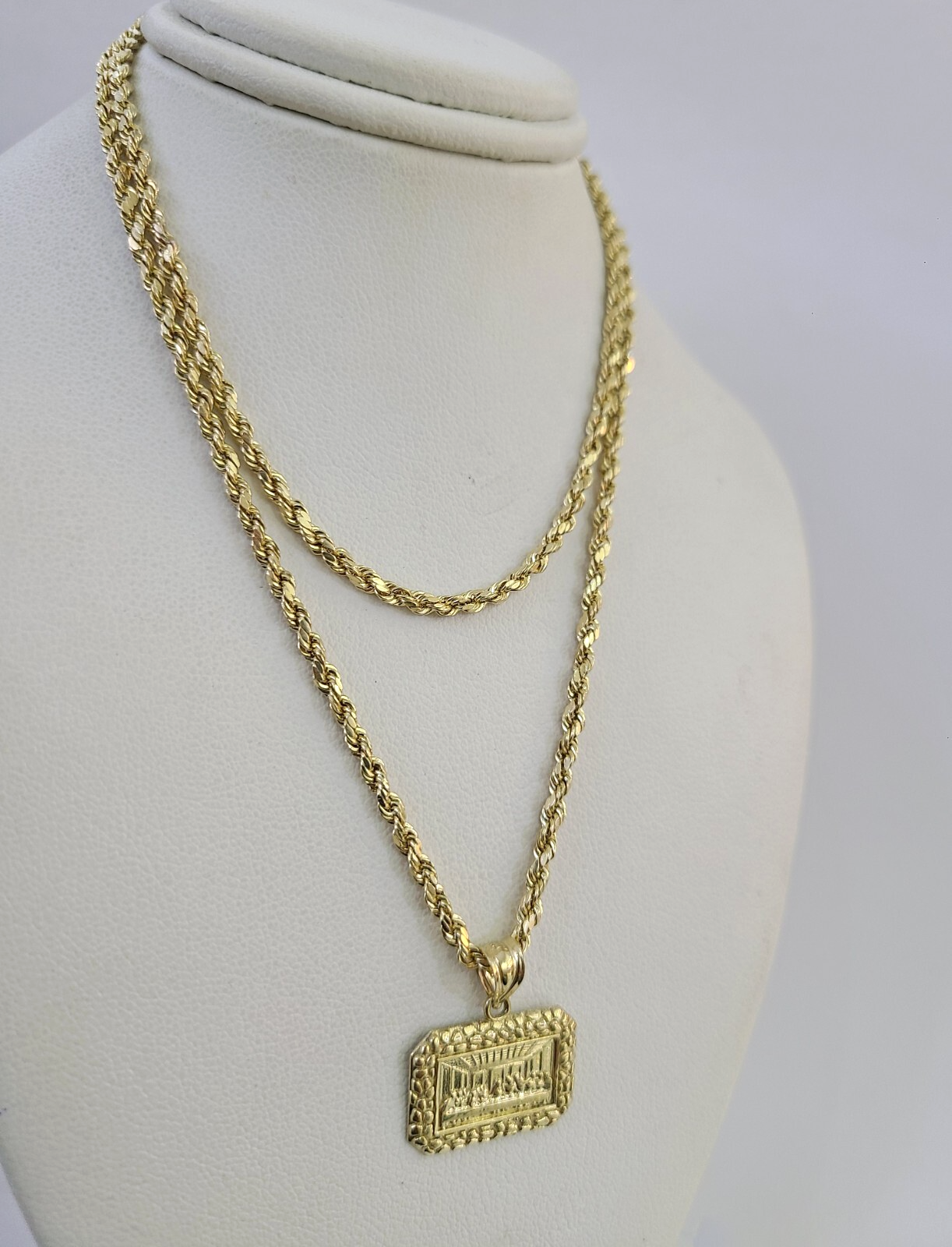 Genuine 10k Yellow Gold Rope Chain 2.5mm With Last Supper diamond cuts design. The Various length of the Chain are 18"-28". The pendants are unique in design and considered durable too. If you are not happy with the way it looks or feels, we do offer 30 - Days FREE Return shipping. Contact us for more information.