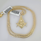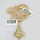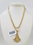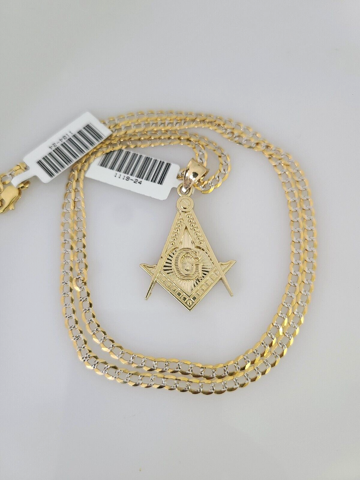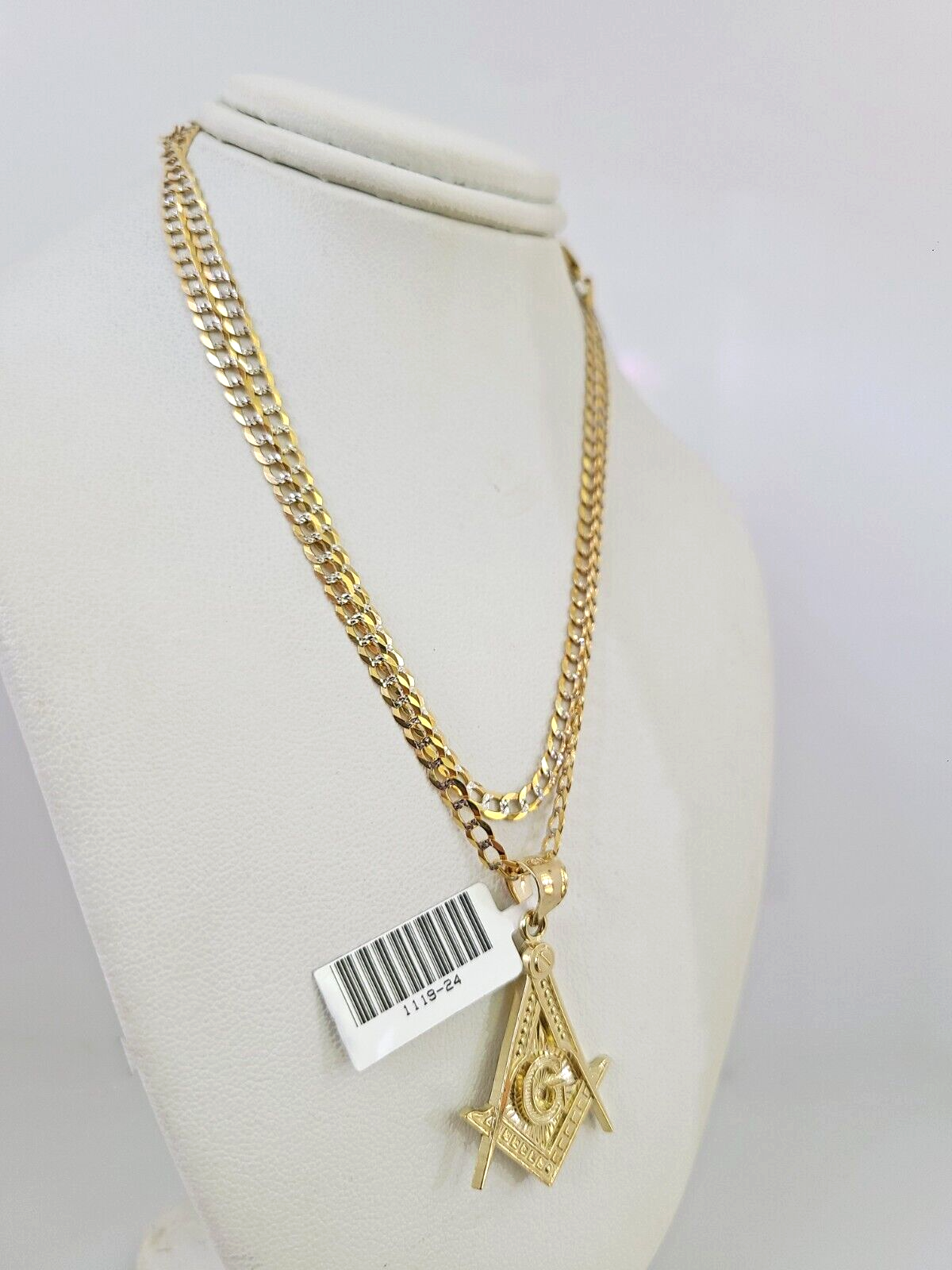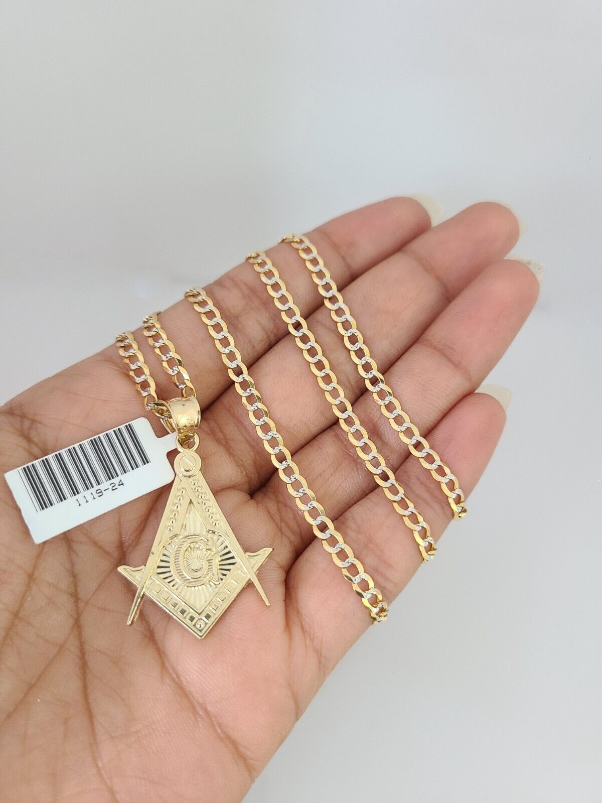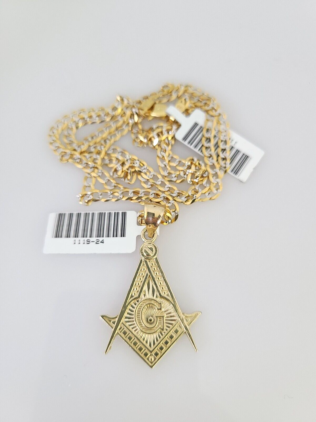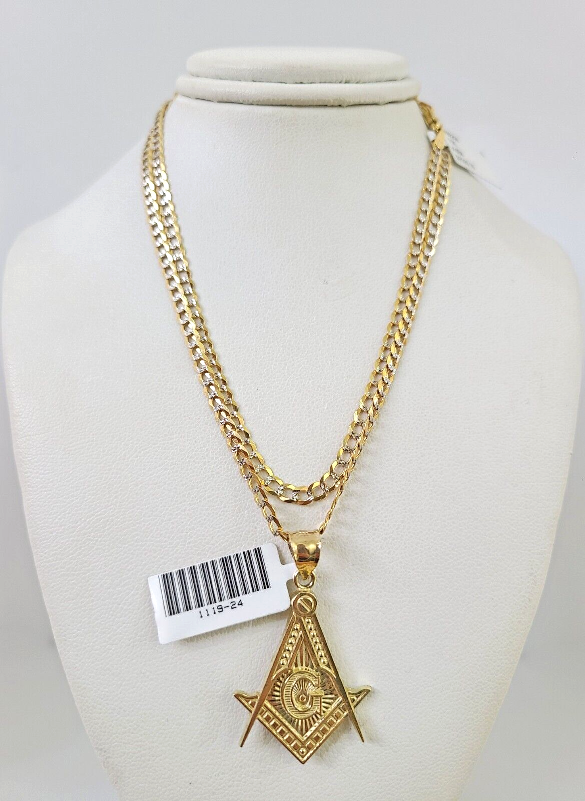 10k Gold Solid Cuban Curb Chain Masonic Pendant Set 3mm 18"-26" Charm Necklace