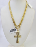 REAL 10k Palm Chain Ankh Cross Pendant 3mm Necklace Set 18"-26"