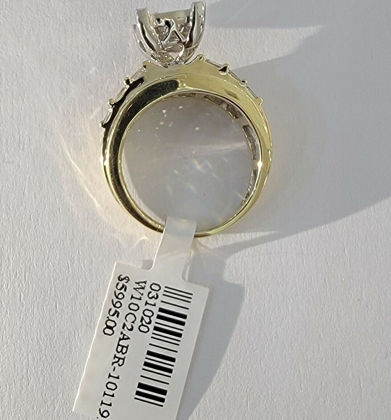 Real 14 K Yellow Gold / white gold and Real 2 CT Solitaire Diamond Halo Engagement Ring for Ladies. It has Princess cut, Baguette and Round, Very Good Quality Diamonds VS2-SI1. The Ring has Solitaire diamond as a main stone that are round cut diamonds runs through and gives a halo style to the ring. The Diamonds are Good Cut. The shape of the diamond Ring is Round, Traditional and Classic & Timeless.. It flaunts Extra ordinary Bridal design ring. It comes with standard size 7, and the ring is sizable. Sizing the ring will cost you extra $29.99 on your demand.