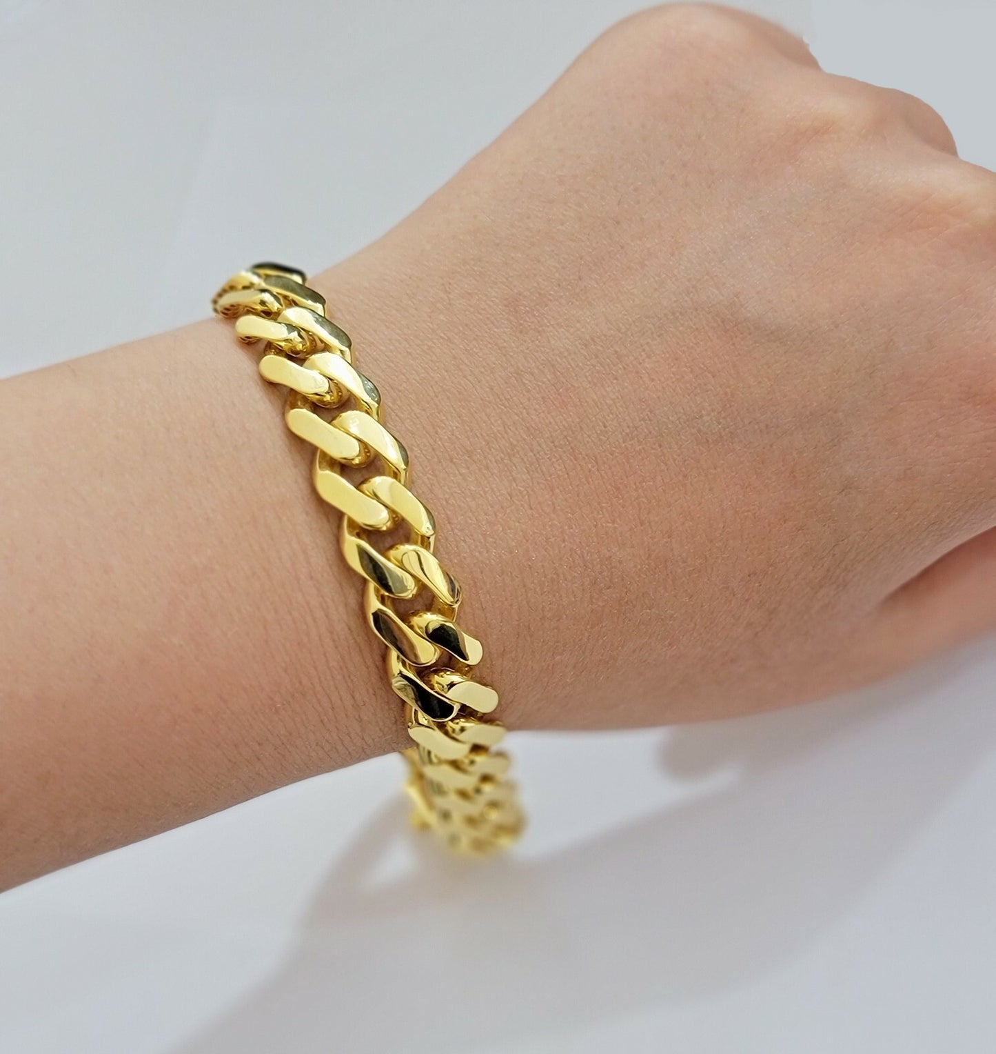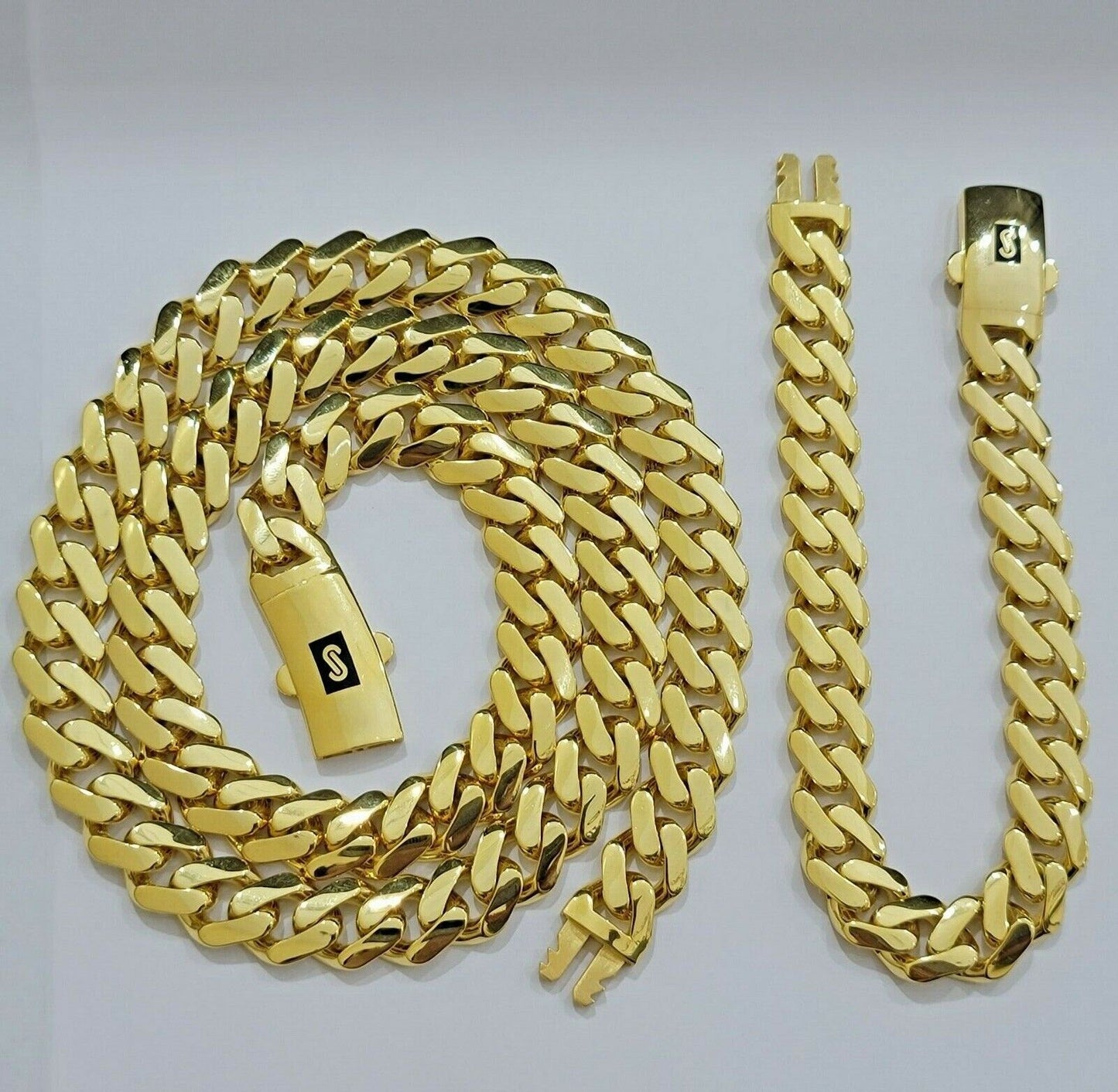 10 k Yellow Gold ( Real , Not plated , Not filled ) Royal Cuban link Monaco chain and Bracelet SET, For men's . The Width of the Item is 11 MM and 26 Inches Necklace and 8 Inch Bracelet. The Clasp is Box Lock. The Item is considered durable. The Item is 100% guaranteed 10k yellow gold and have been professionally tested and stamped 10k for purity authenticity. The Item feels light weight because of its weight but We guarantee the purity of the gold to be 10k, and the Item are NOT GOLD PLATED, NOT FILLED. If you are not happy with the way it looks or feels, we do offer FREE Return shipping.