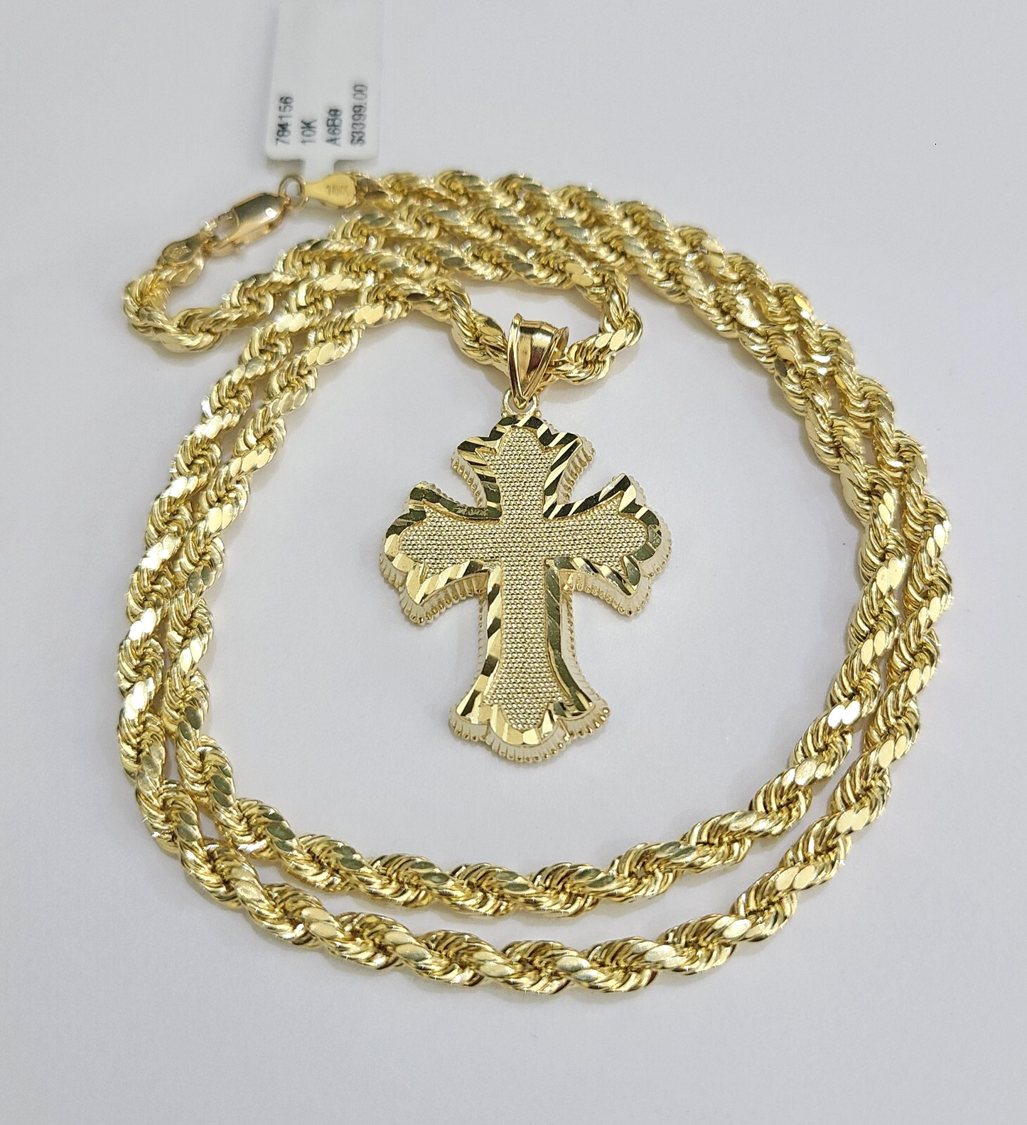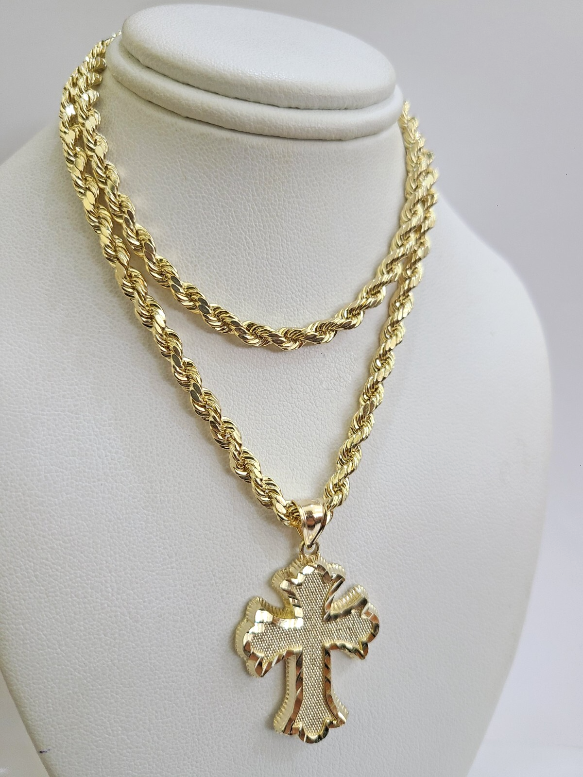 Genuine 10k Yellow Gold Rope Chain 4mm With Jesus Cross Diamond cuts design. The Various length of the Chain are 18"-28". The pendants are unique in design and considered durable too. If you are not happy with the way it looks or feels, we do offer 30 - Days FREE Return shipping. Contact us for more information.
