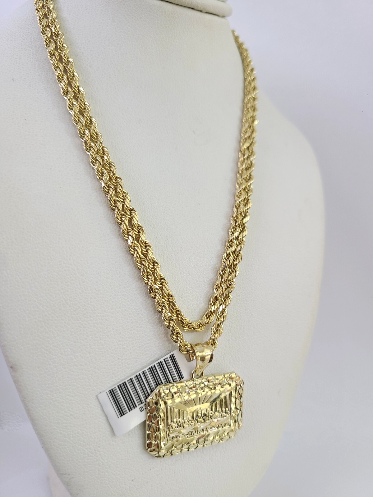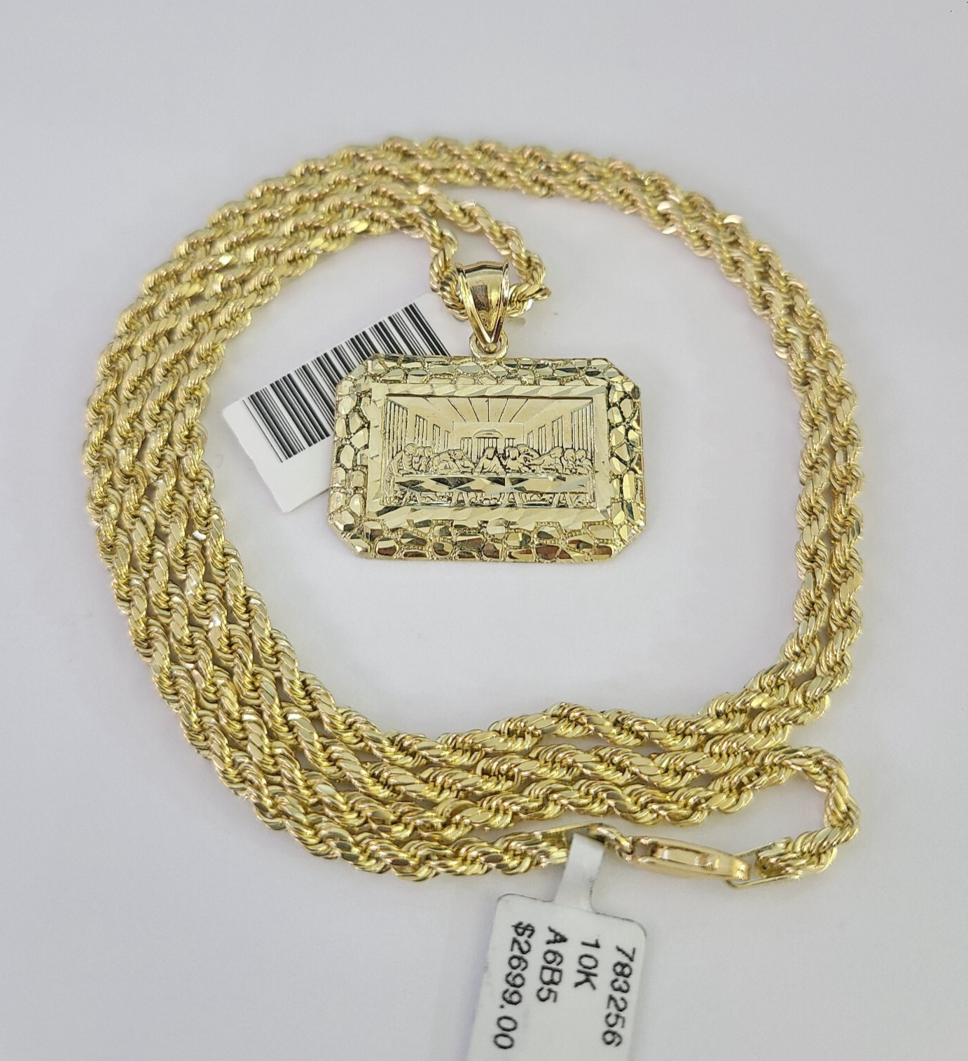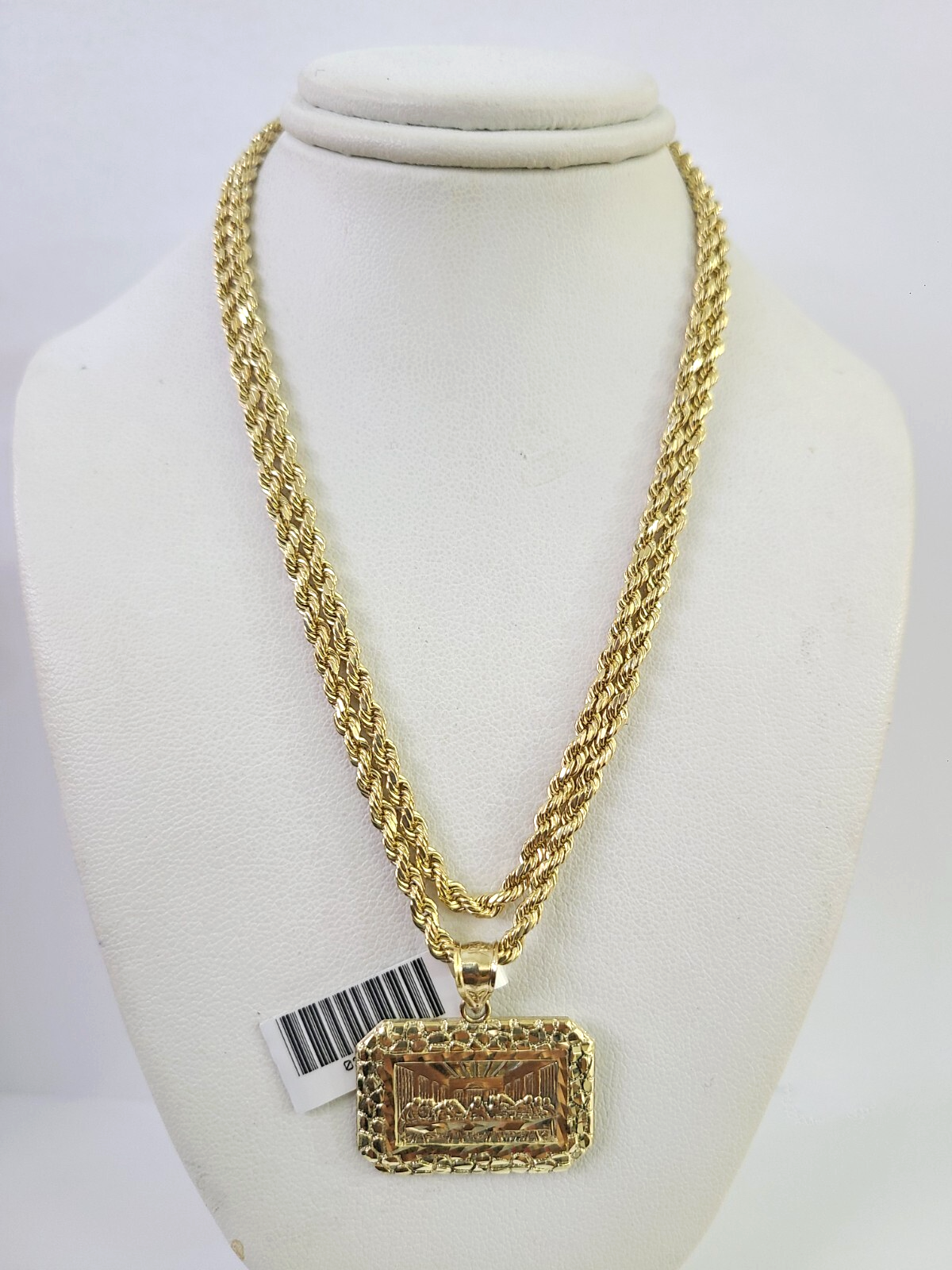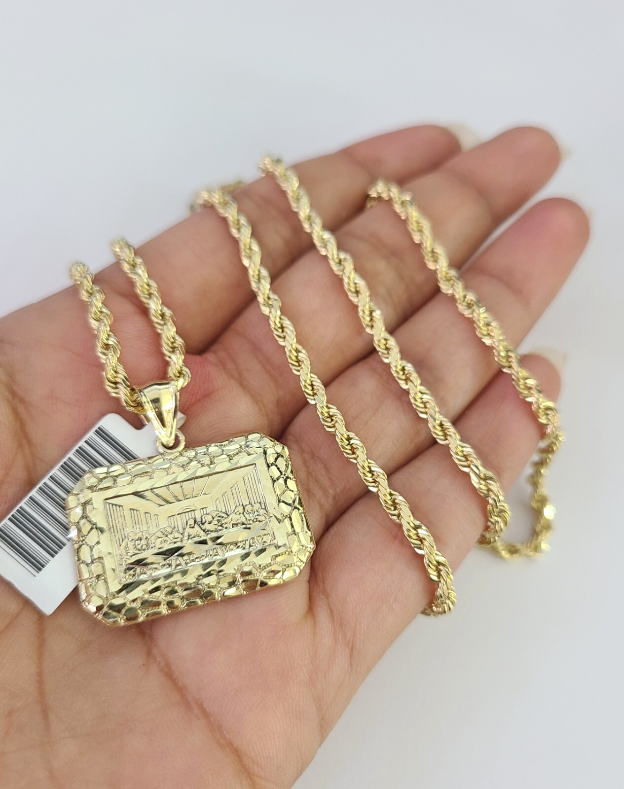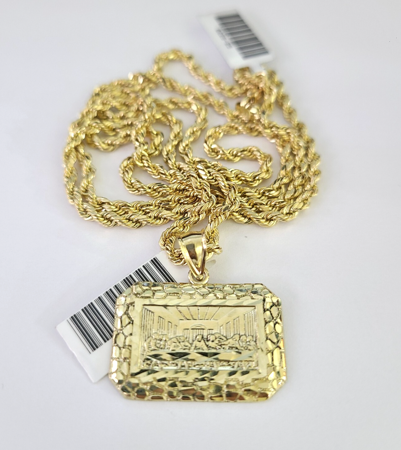 REAL 10k Rope Chain Last Supper Charm Pendant 3mm Necklace Set 18"-30" in