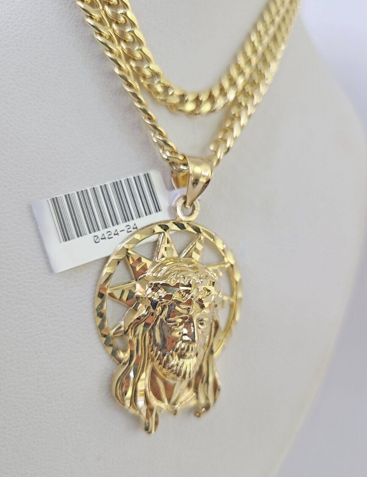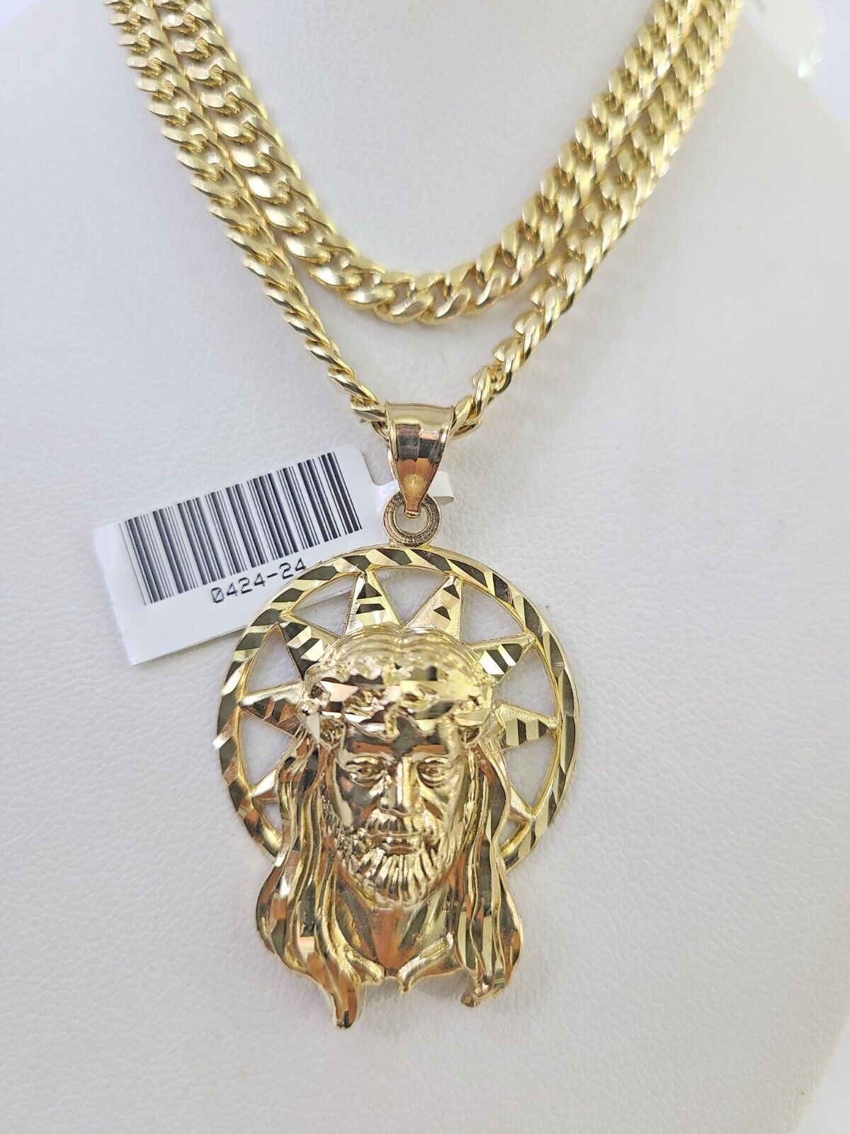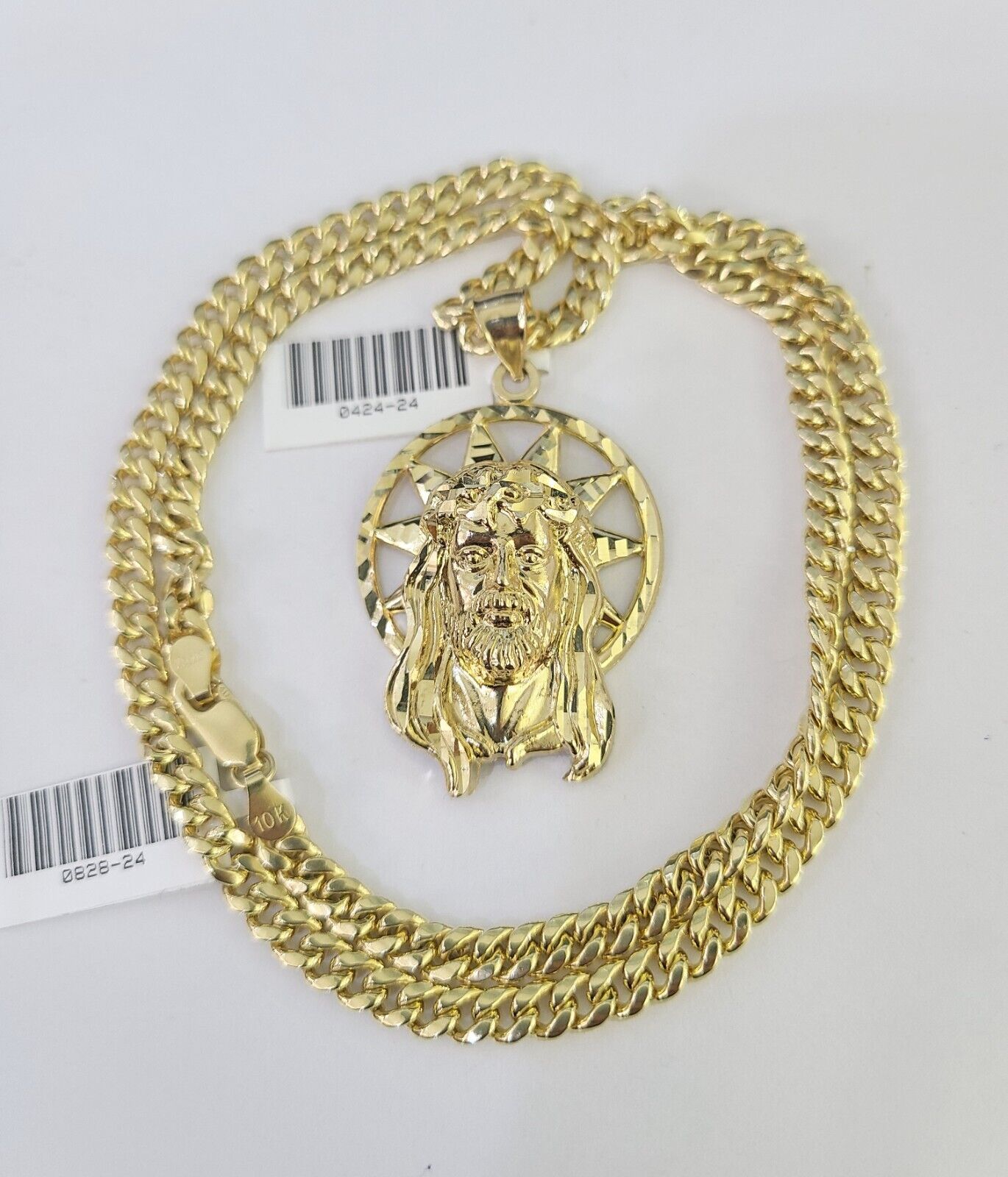 10k Gold Chain Jesus Head Pendant Set Miami Cuban link Necklace 5mm 20-30 Inch