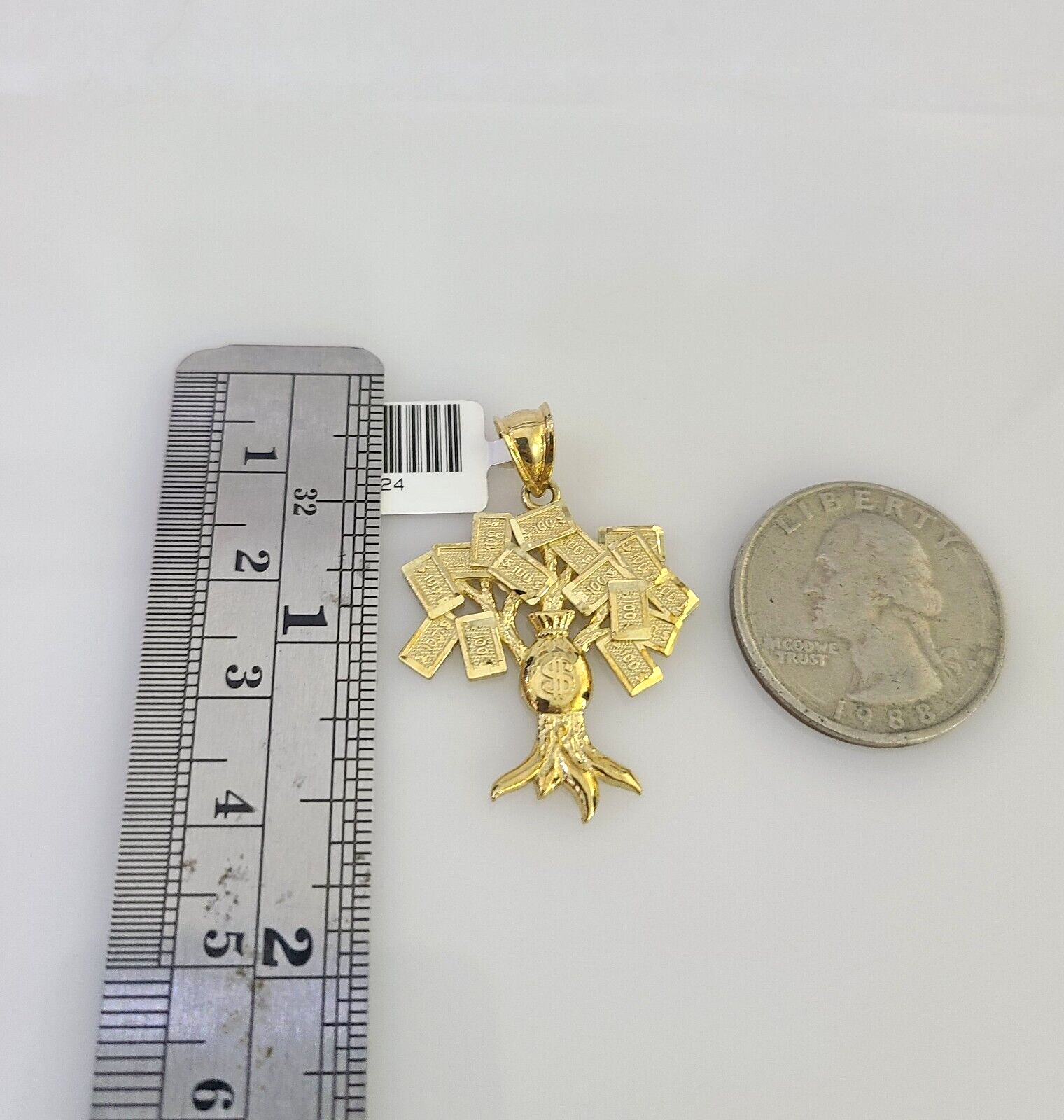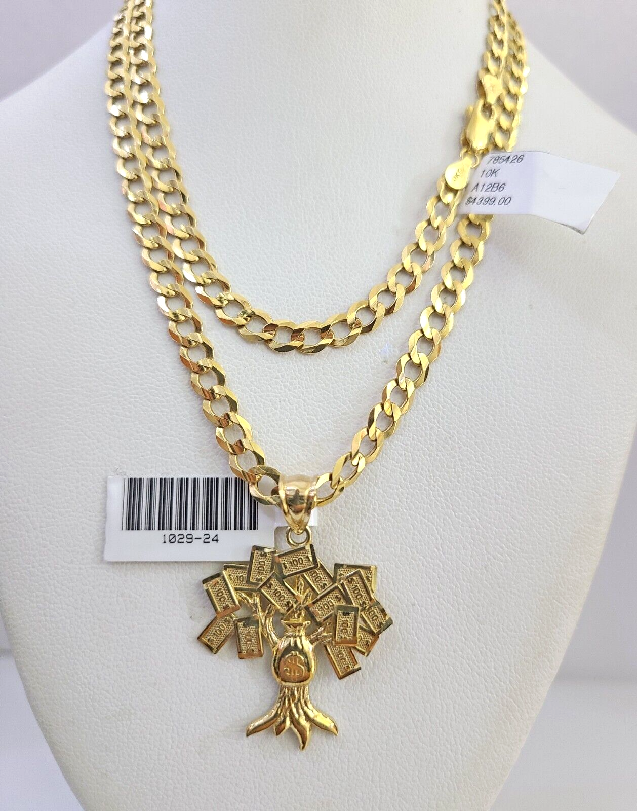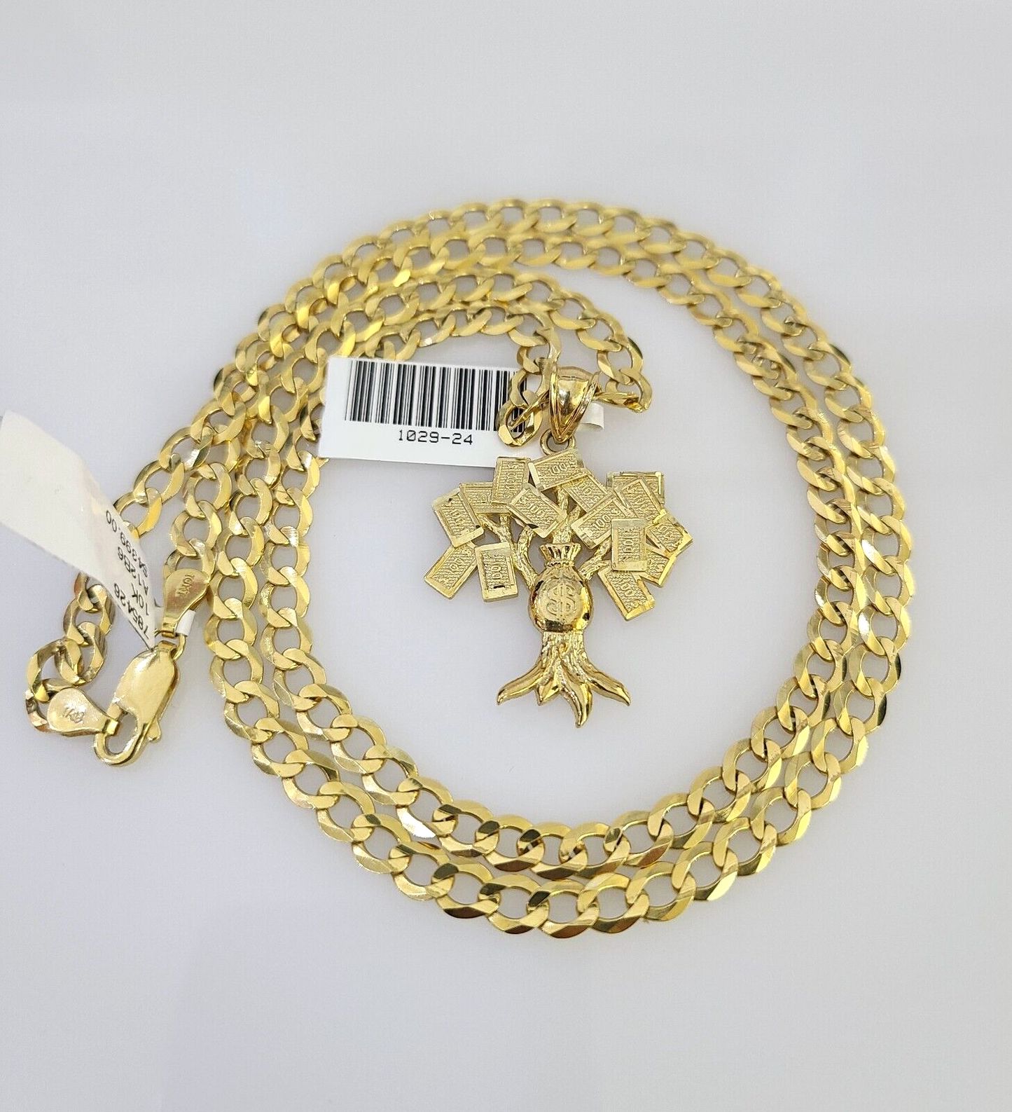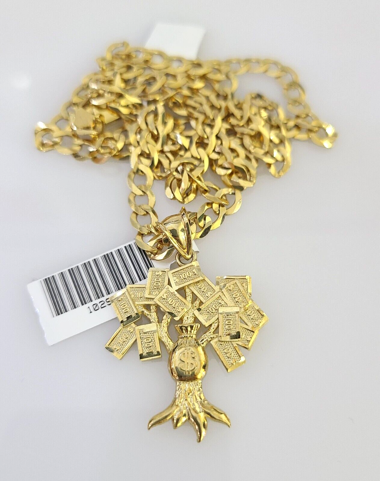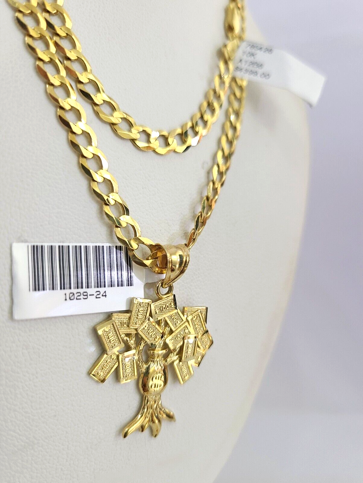 10k Gold Chain Necklace Money Tree Pendant Set Cuban Curb 5mm 20"-28" Charm