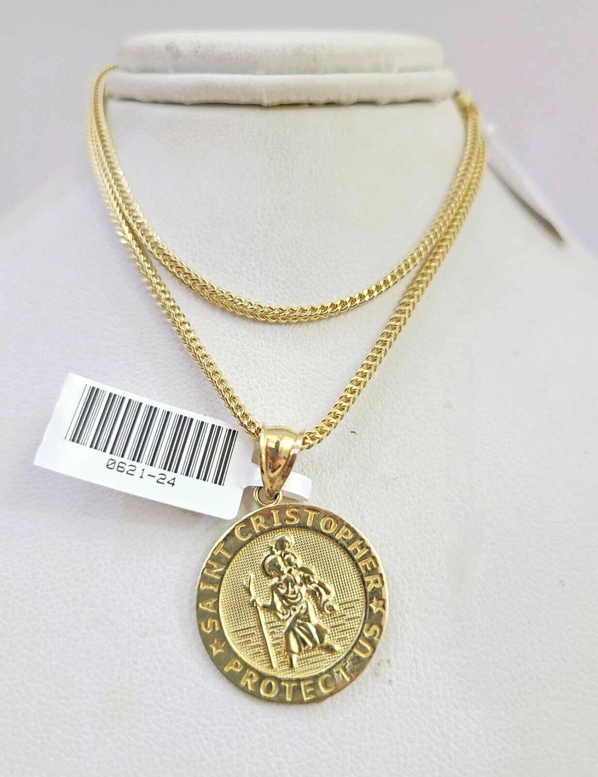 Genuine 10k Yellow Gold Franco Necklace 2mm Chain With Saint Cristopher Charm. The Various length of the Chain are 18"-24" with Saint Cristopher Charm 1-1.5 inches (approx.). The pendants are unique in design and considered durable too. If you are not happy with the way it looks or feels, we do offer 30 - Days FREE Return shipping. Contact us for more information.