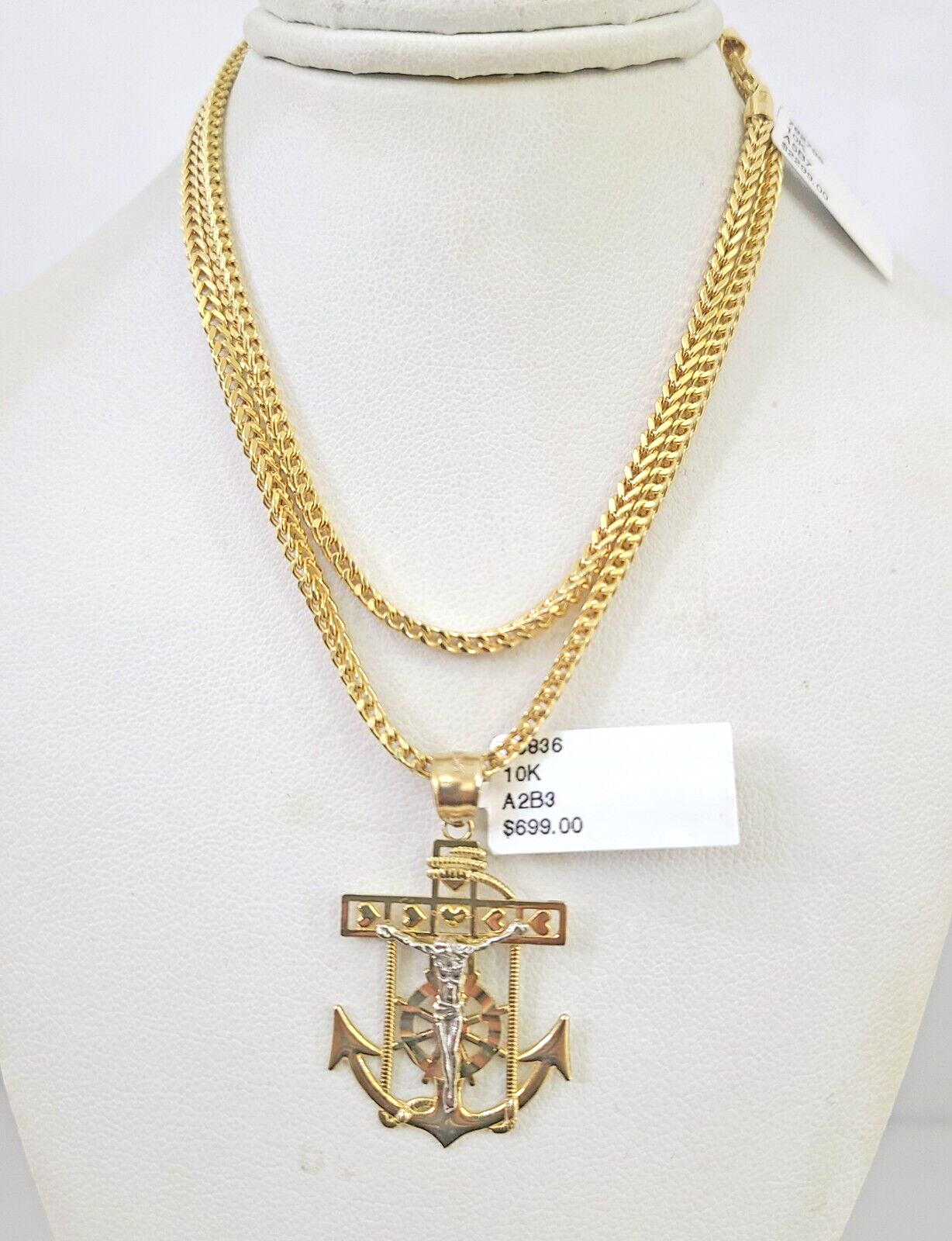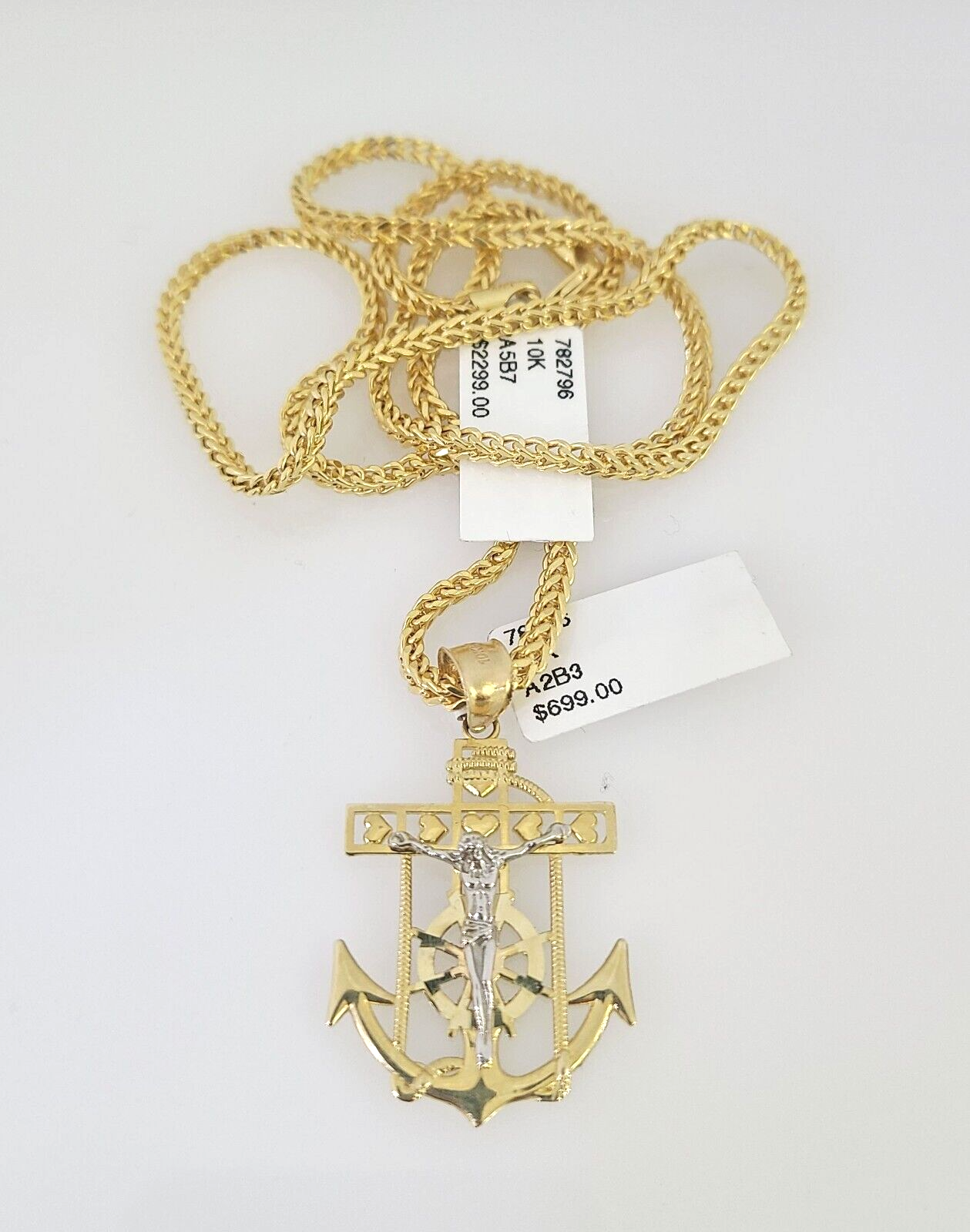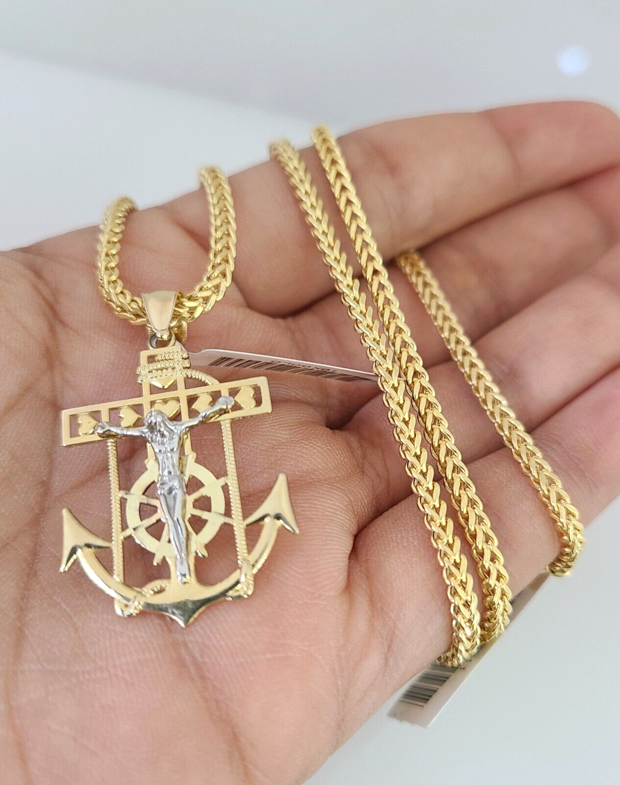 Genuine 10k Yellow Gold Franco Necklace 2.5mm Chain With Jesus Anchor Charm. The Various length of the Chain are 18"-24" with Jesus Anchor Charm 1-2 inches (approx.). The pendants are unique in design and considered durable too. If you are not happy with the way it looks or feels, we do offer 30 - Days FREE Return shipping. Contact us for more information.