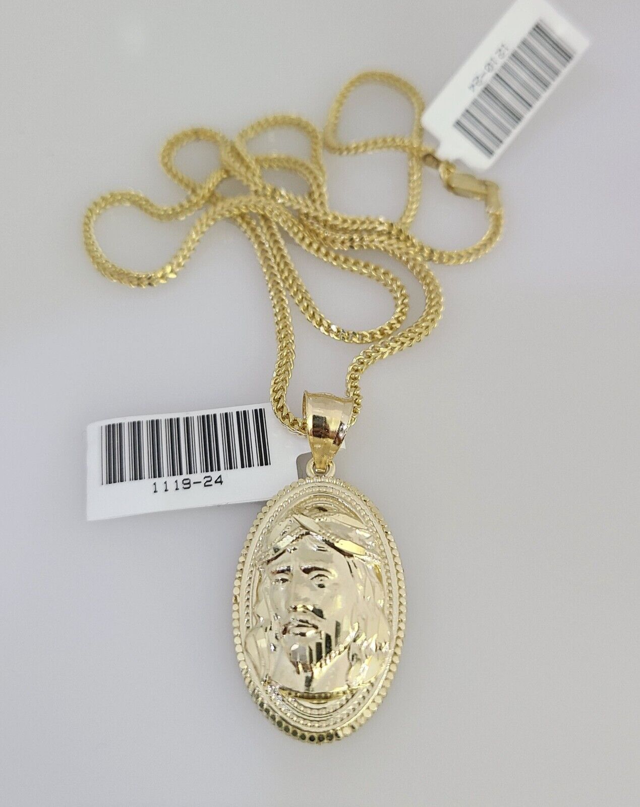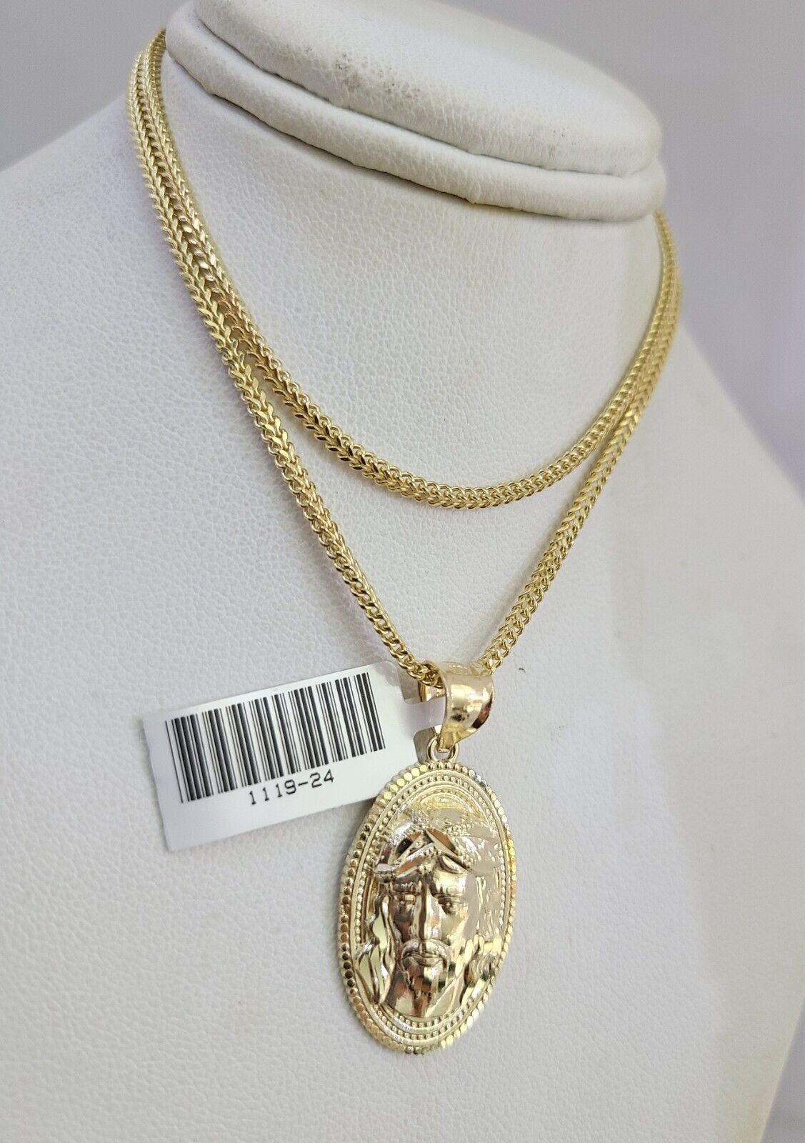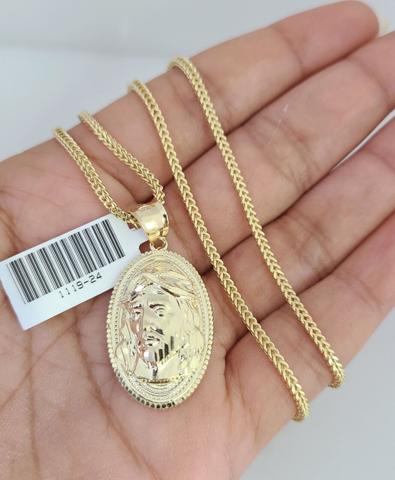 10k Gold Franco Chain Jesus Head Charm Pendant 2mm 18-24 Inches Necklace SET