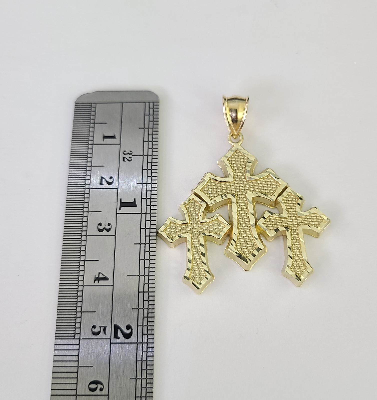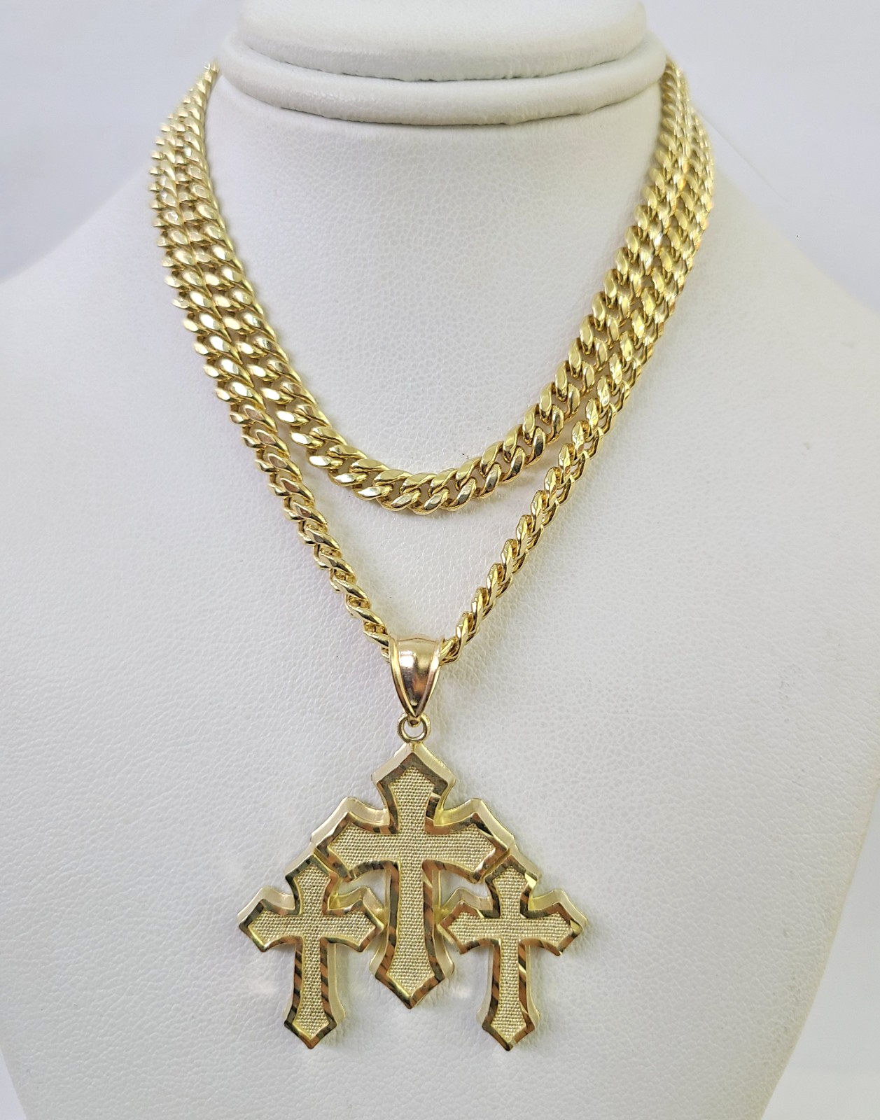 Genuine 10k Yellow Gold Miami Cuban Necklace 5mm Chain with Jesus Triple Cross Charm. The Various length of the Chain are 18"-28" with Jesus Triple Cross Charm. The pendants are unique in design and considered durable too. If you are not happy with the way it looks or feels, we do offer 30 - Days FREE Return shipping. Contact us for more information.