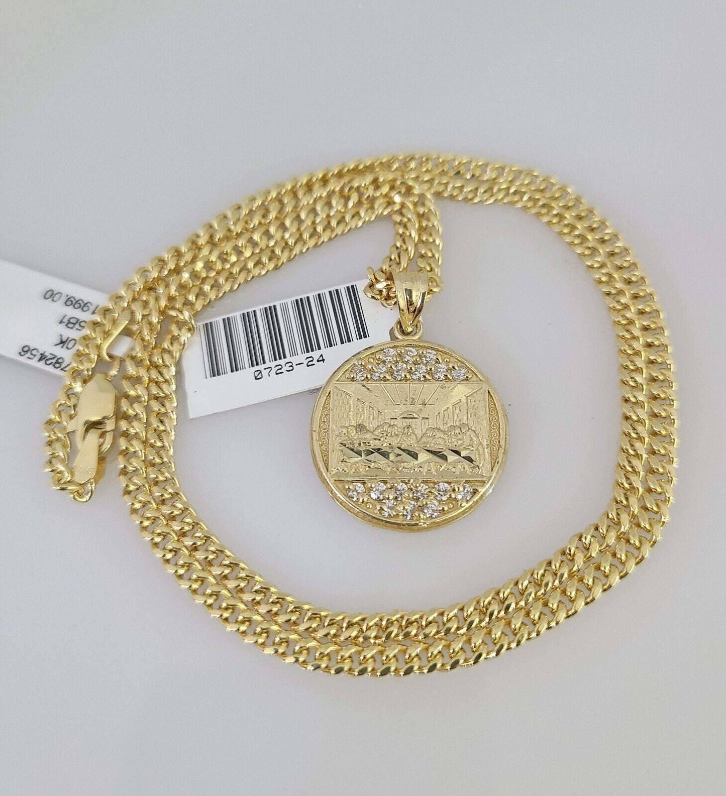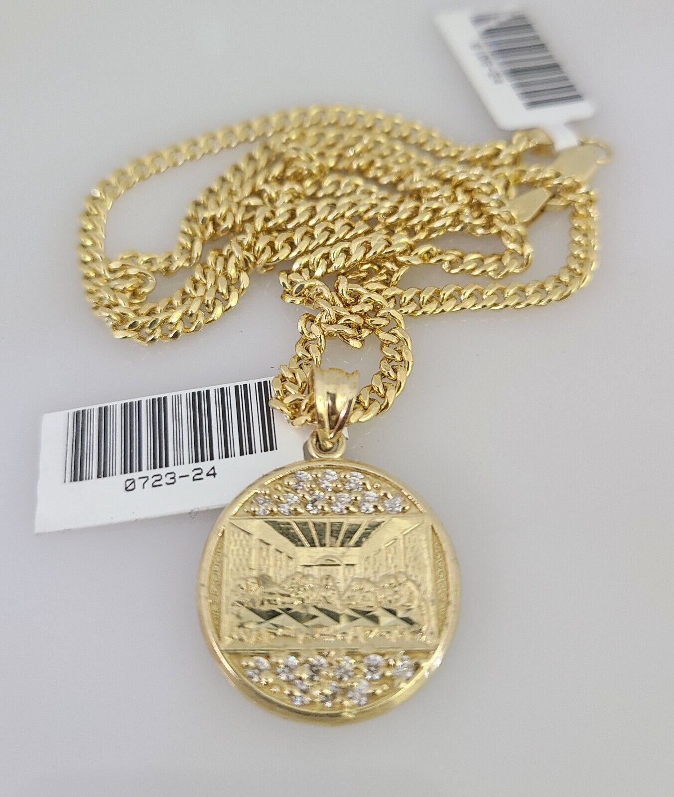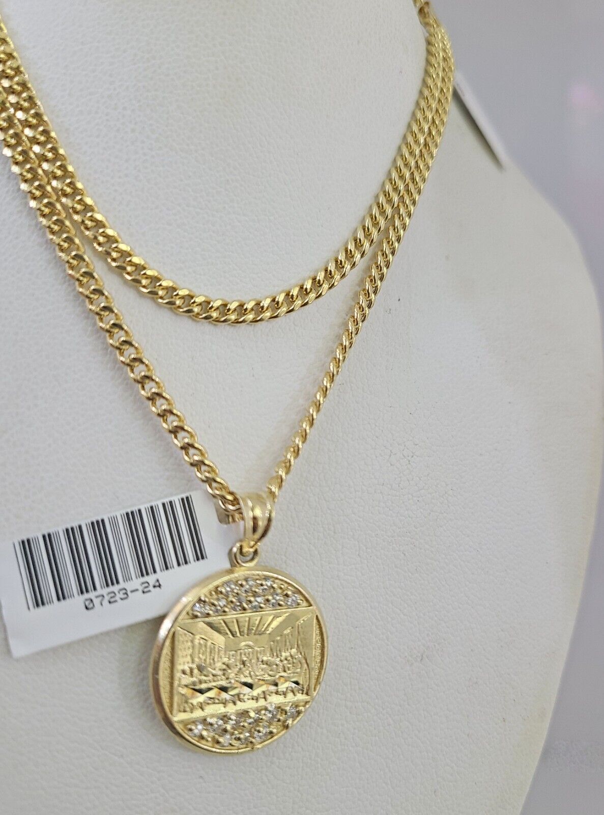 10k Gold Miami Cuban Chain Last Supper Charm Pendant 3mm 18-28 Inch Necklace Set