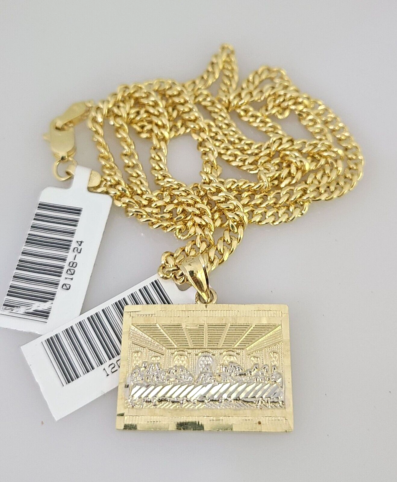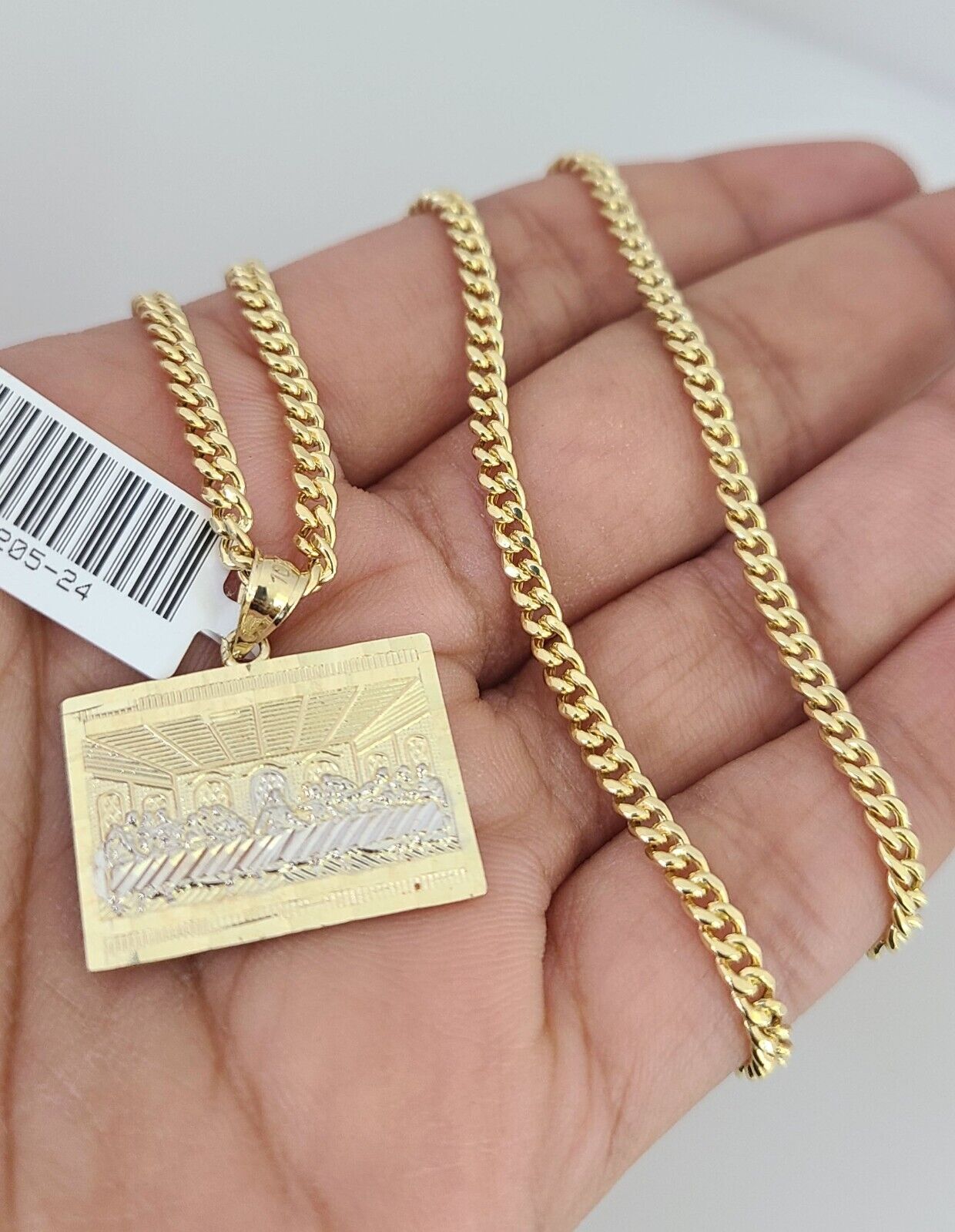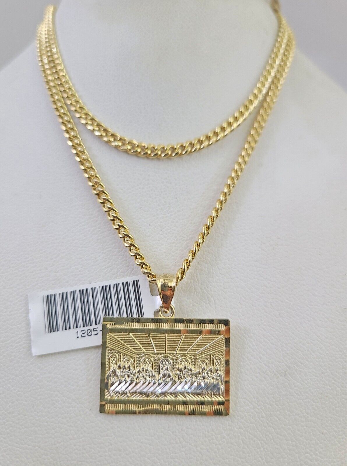 10k Gold Miami Cuban Necklace Last Supper Pendant Charm 3mm 18-28 Inch Chain Set