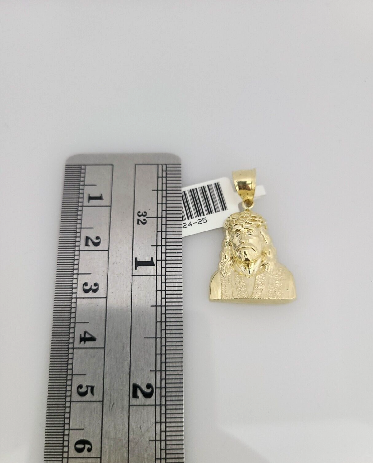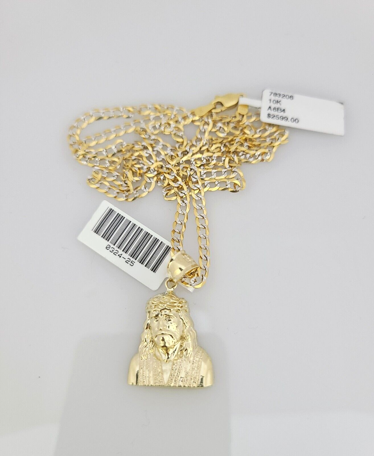 Genuine 10k Yellow Gold Solid Cuban Curb Link Chain Necklace 3mm Chain with Jesus Head Pendant. The Various lengths of the Chain are 18"-26". The Pendants are unique in design and considered durable too. If you are not happy with the way it looks or feels, we do offer 30 - Days FREE Return shipping. Contact us for more information.