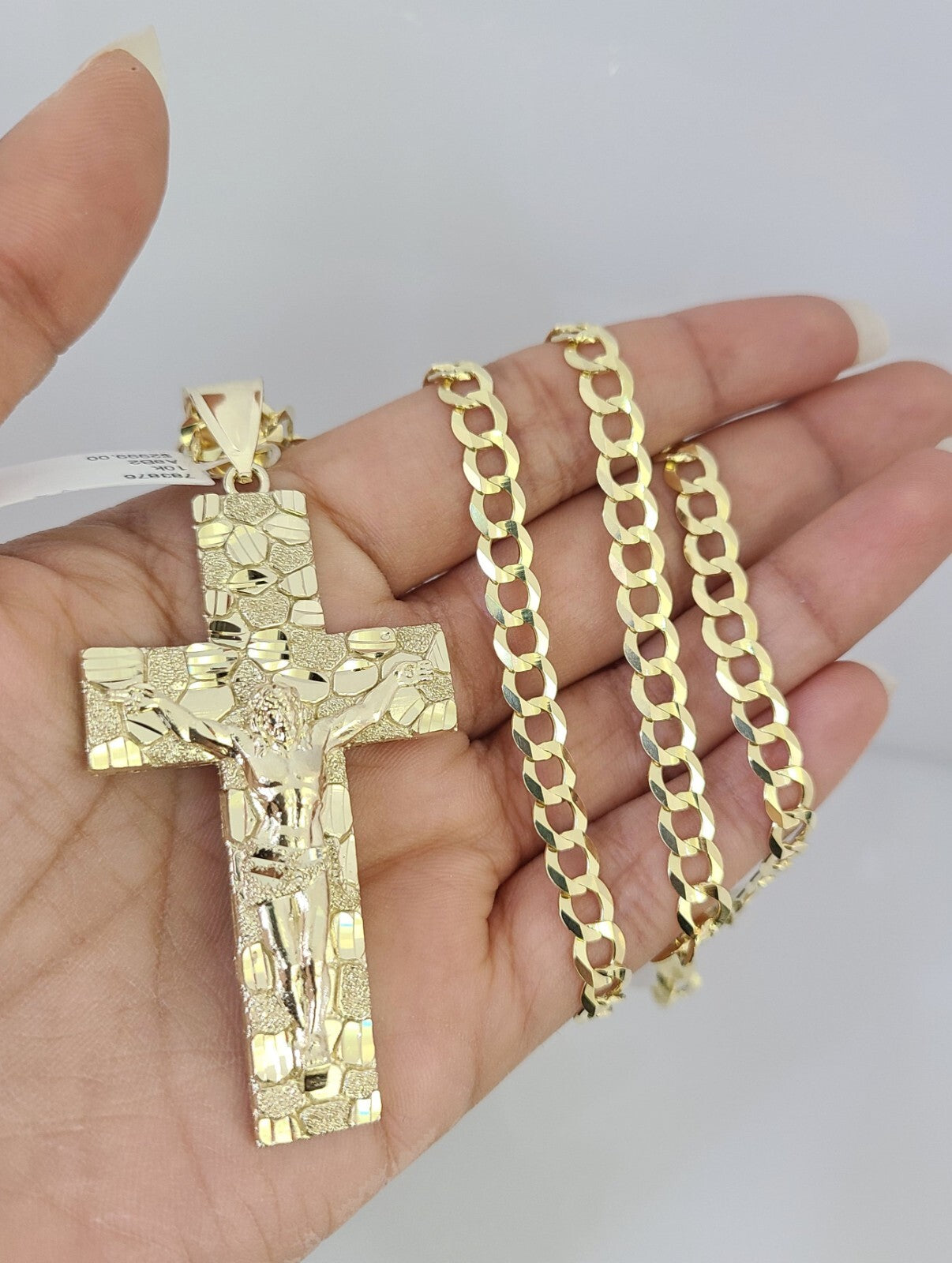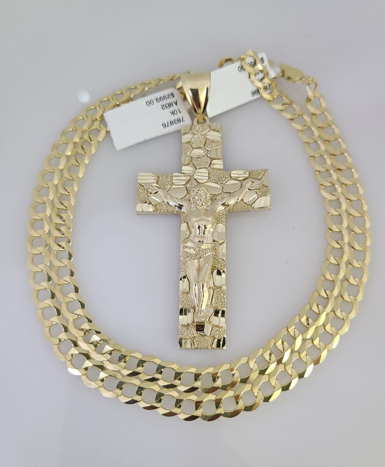10k Gold Solid Cuban Curb Chain Necklace Nugget Cross Pendant Set 6mm 20"-30"
