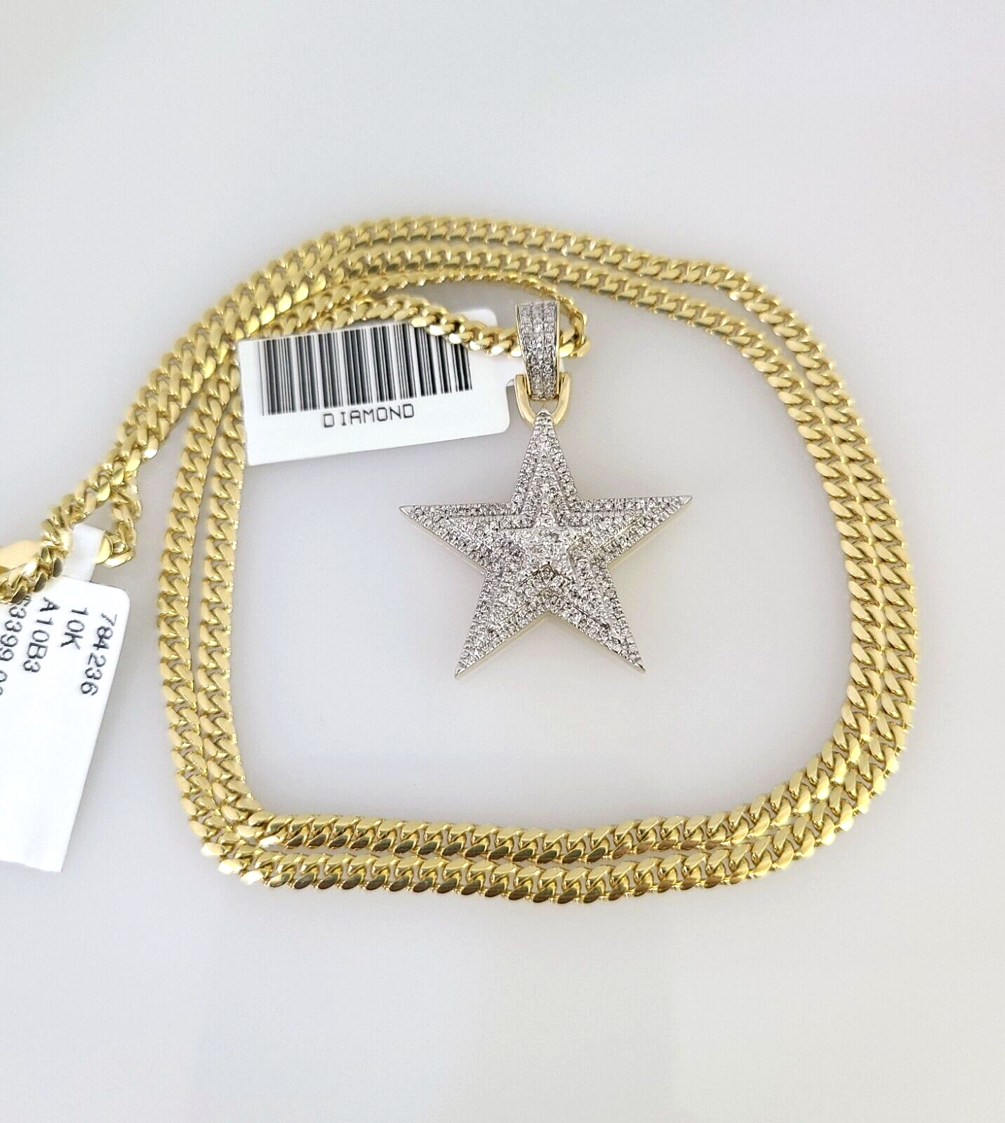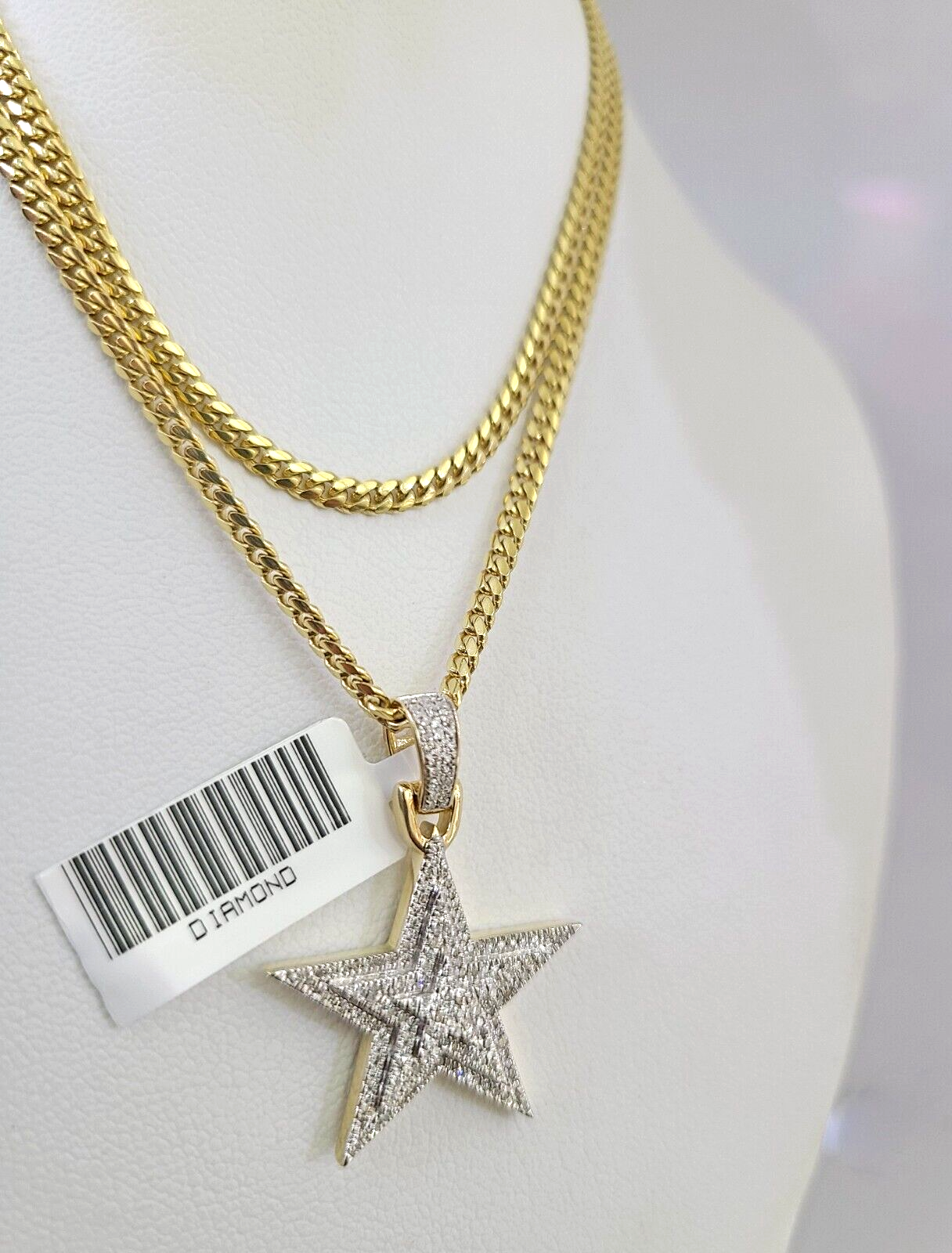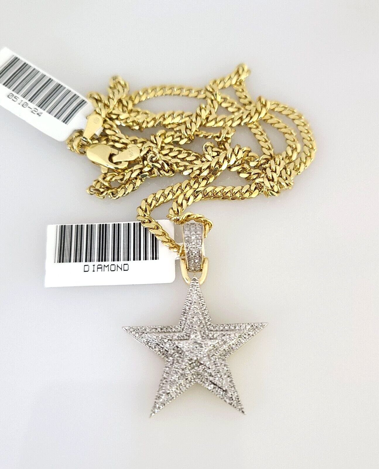 Genuine 10k Yellow Gold Miami Cuban Necklace 2.5mm Chain With Diamond Star Charm. The Various length of the Chain are 18"-24" . The pendants are unique in design and considered durable too. If you are not happy with the way it looks or feels, we do offer 30 - Days FREE Return shipping. Contact us for more information.