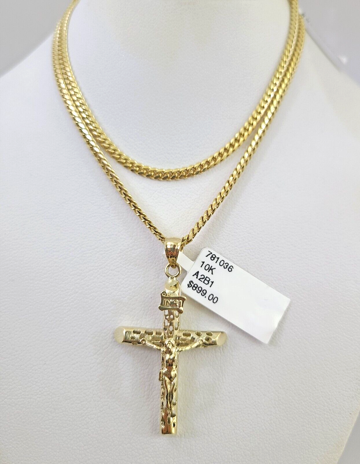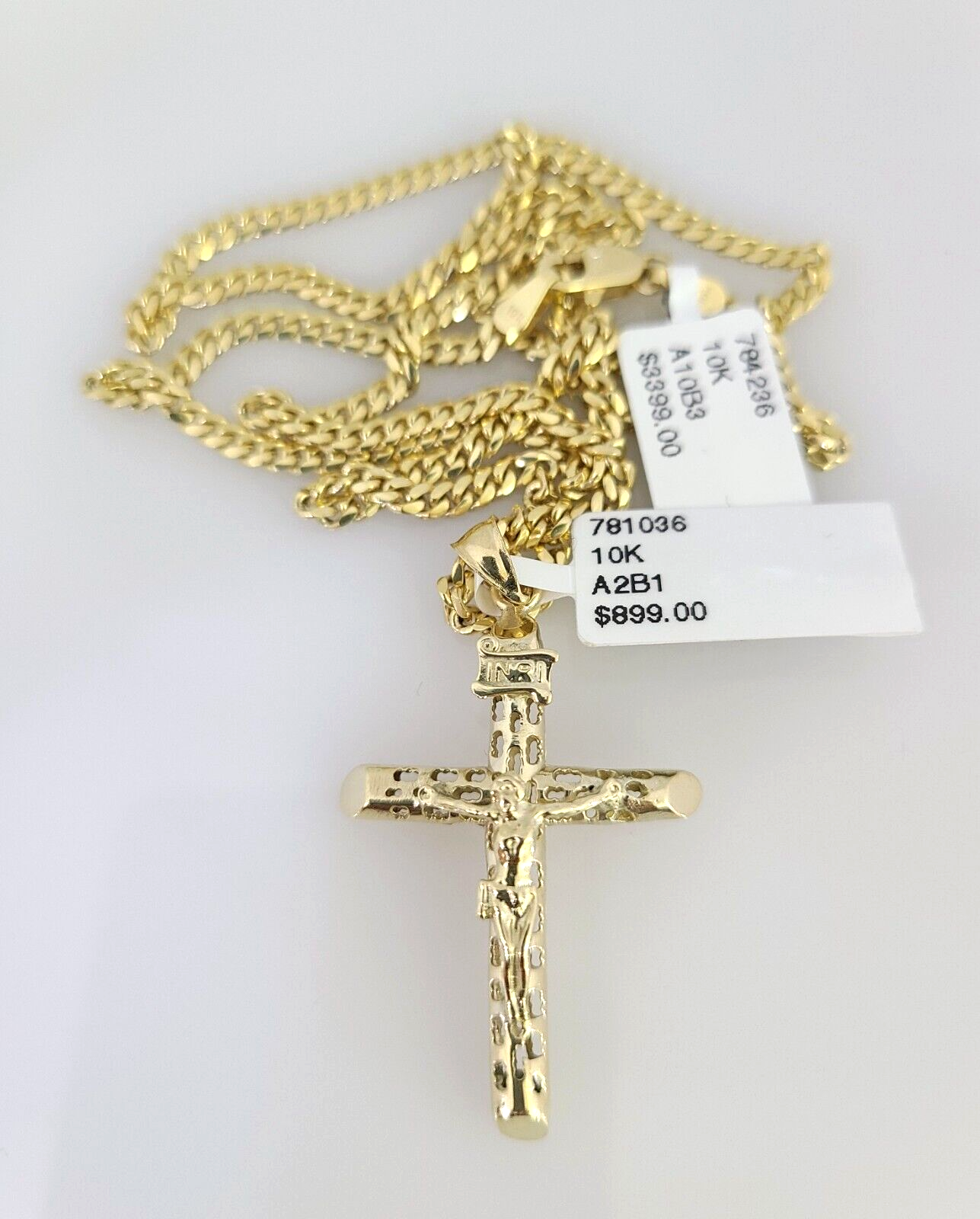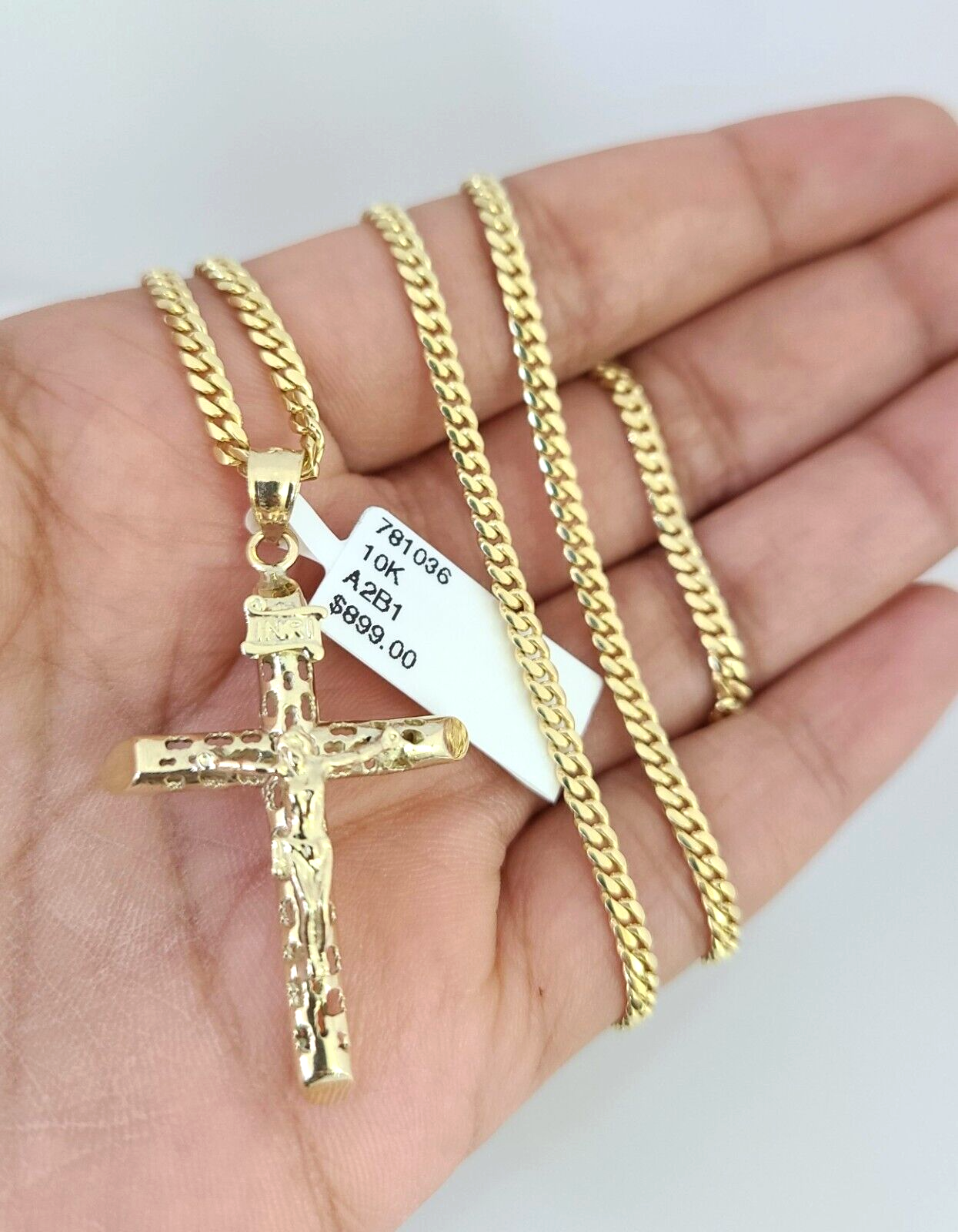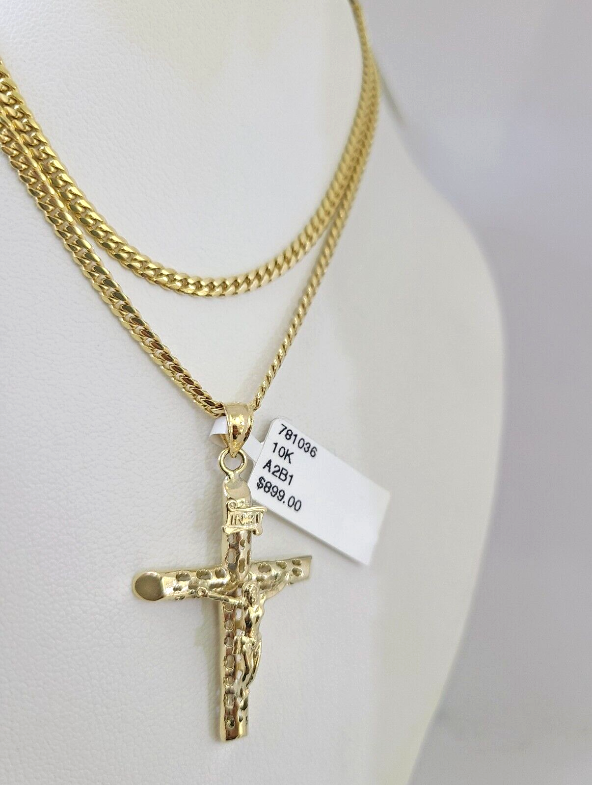 Genuine 10k Yellow Gold Miami Cuban Necklace 2.5mm Chain With INRI Jesus Cross Charm. The Various length of the Chain are 18"-24" . The pendants are unique in design and considered durable too. If you are not happy with the way it looks or feels, we do offer 30 - Days FREE Return shipping. Contact us for more information.