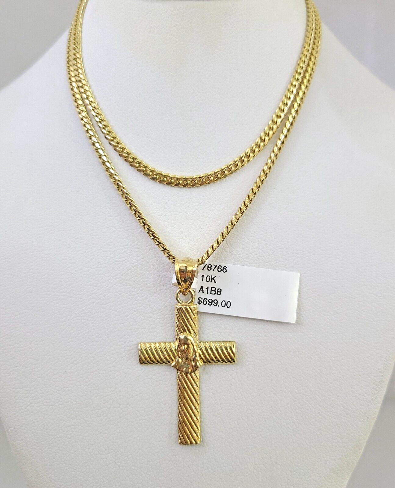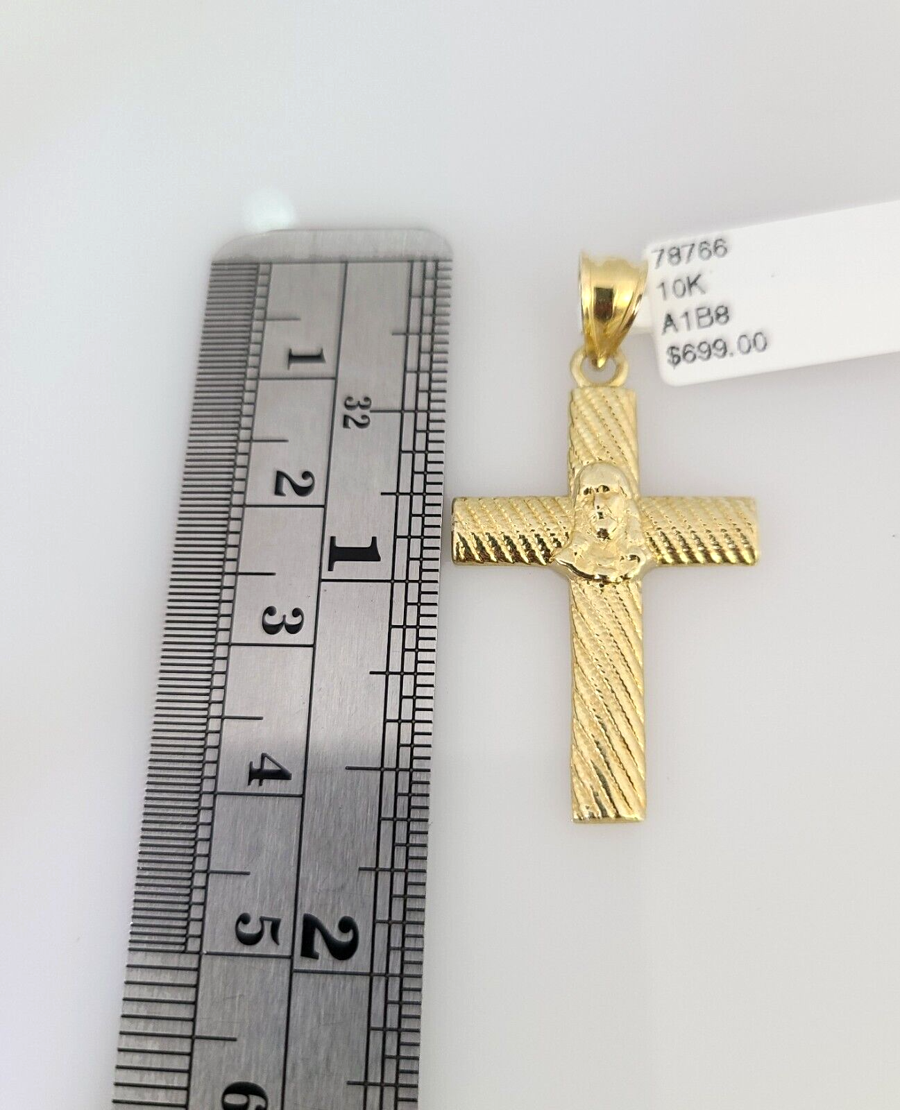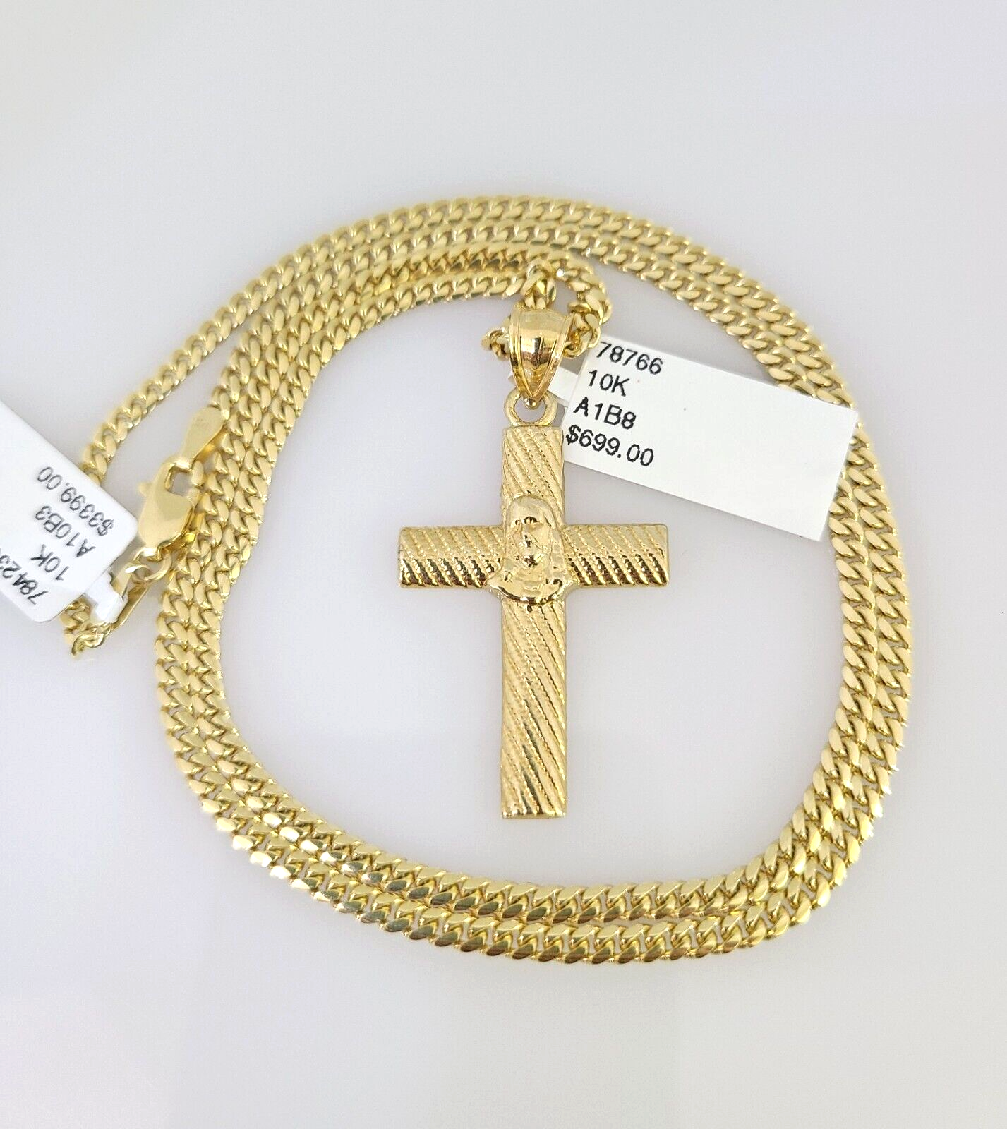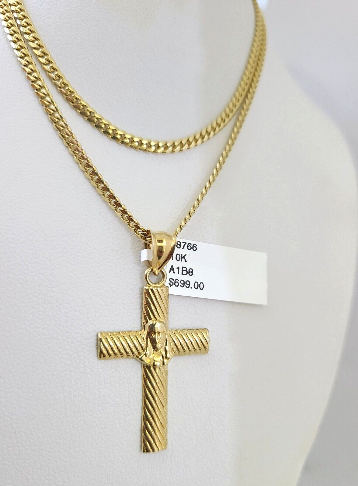Genuine 10k Yellow Gold Miami Cuban Necklace 2.5mm Chain With Jesus Cross Charm. The Various length of the Chain are 18"-24" . The pendants are unique in design and considered durable too. If you are not happy with the way it looks or feels, we do offer 30 - Days FREE Return shipping. Contact us for more information.