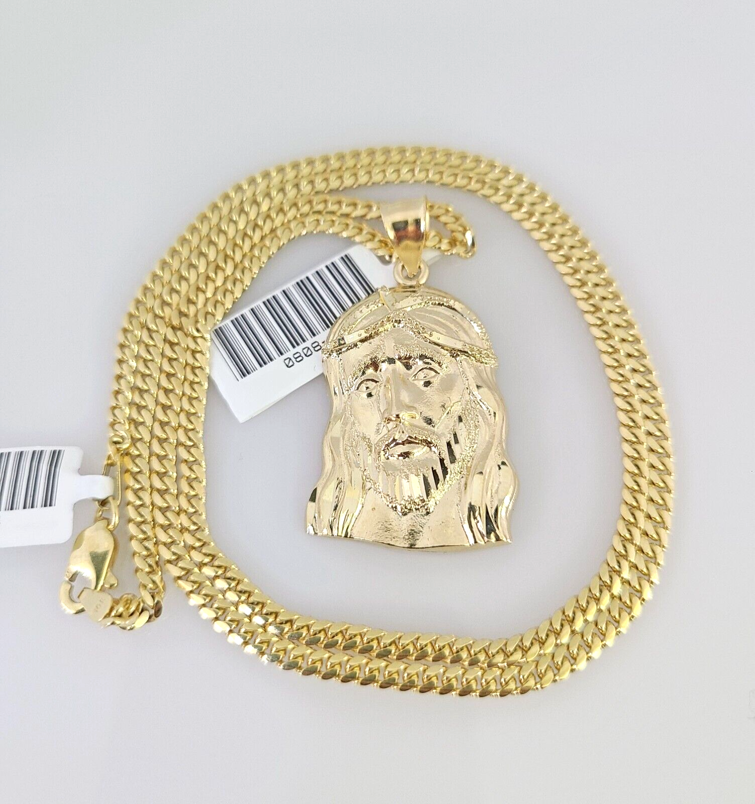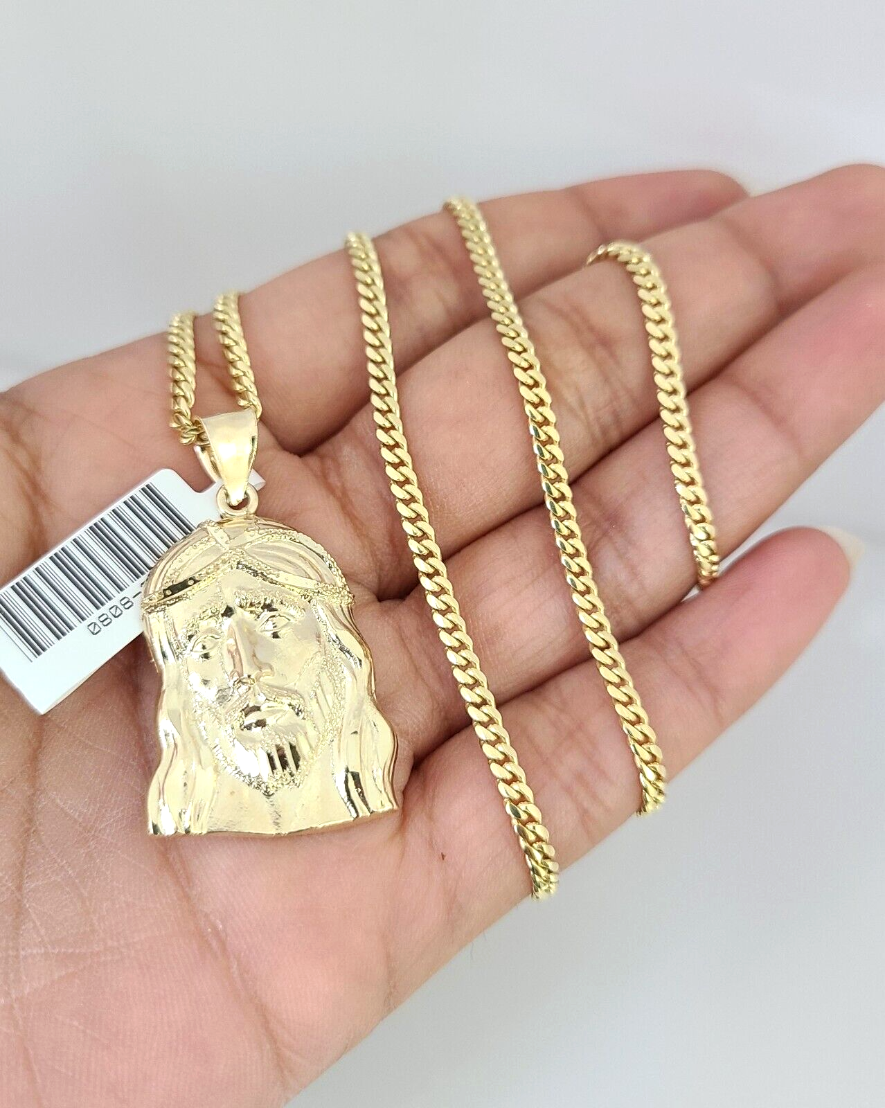 10k Gold Solid Miami Cuban Necklace Jesus Head Pendant 2.5mm 18-24" Chain Set