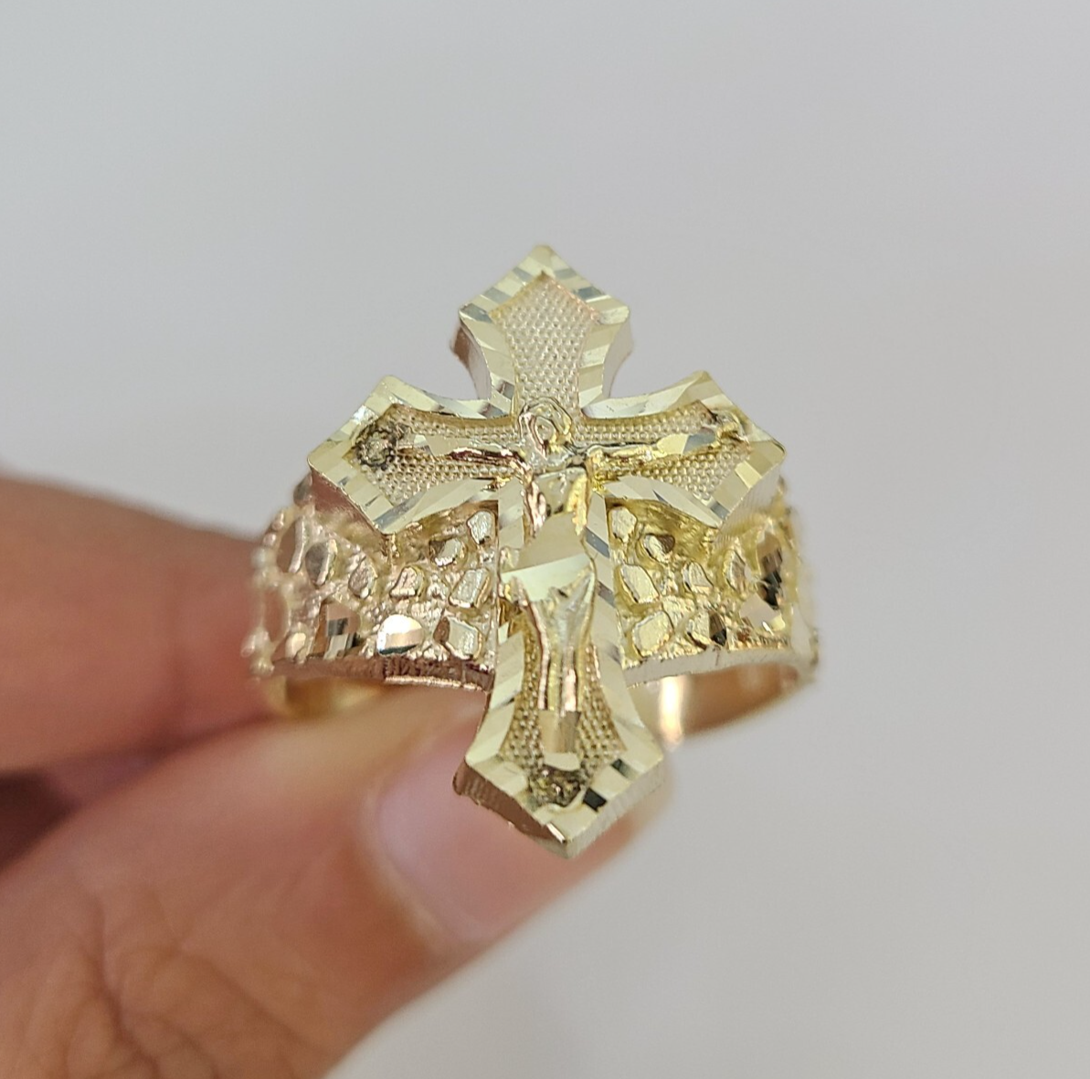 10k Jesus Crucifix Cross Nugget Ring Casual Band Yellow Gold Brand New Religious Size 6 7 8 9 10 11 & 12