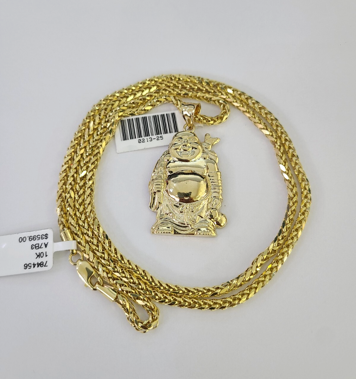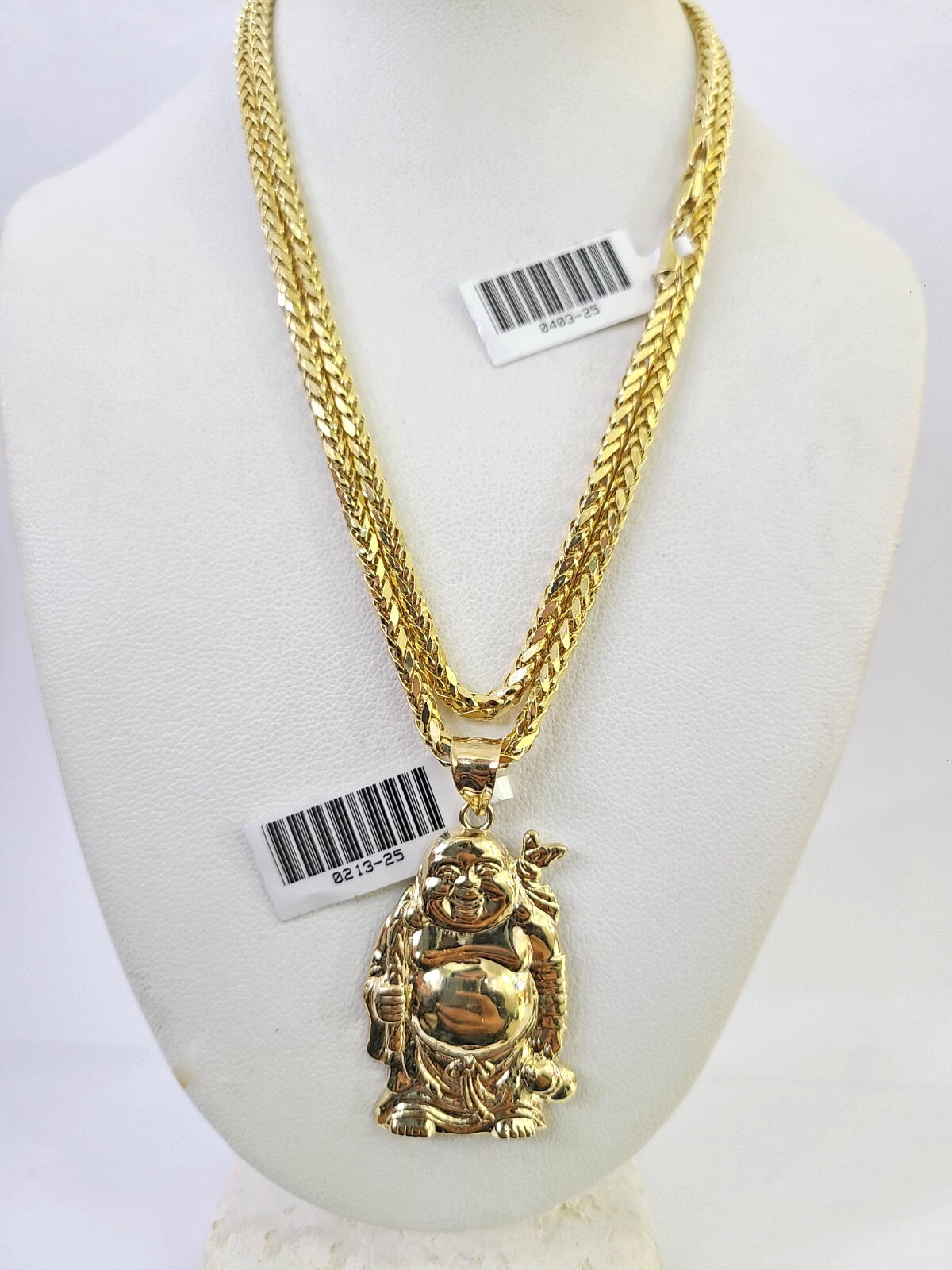 Genuine 10k Yellow Gold Palm Chain 3mm With Laughing Buddha design. The Various length of the Chain are 18"-26". The pendants are unique in design and considered durable too. If you are not happy with the way it looks or feels, we do offer 30 - Days FREE Return shipping. Contact us for more information.
