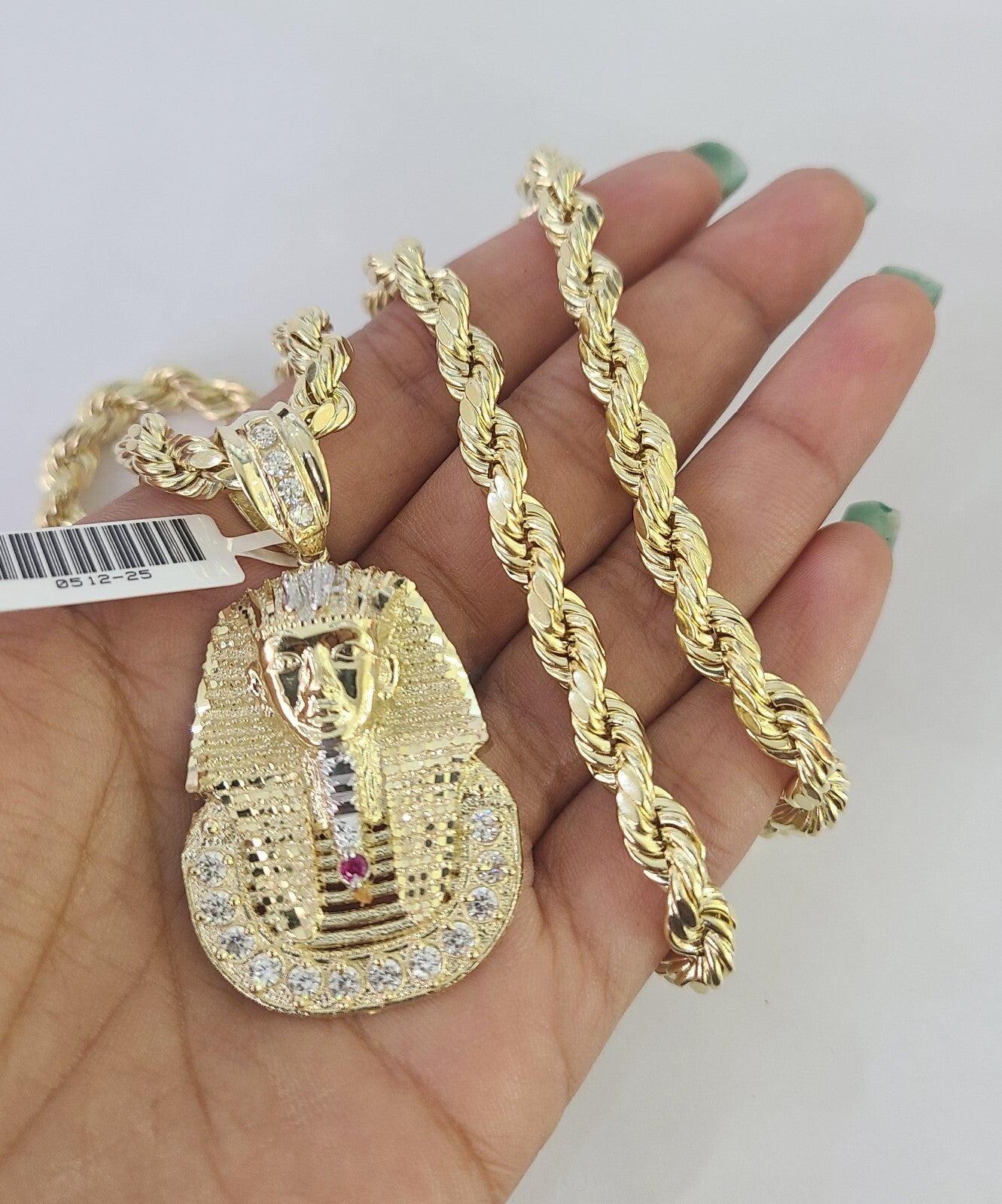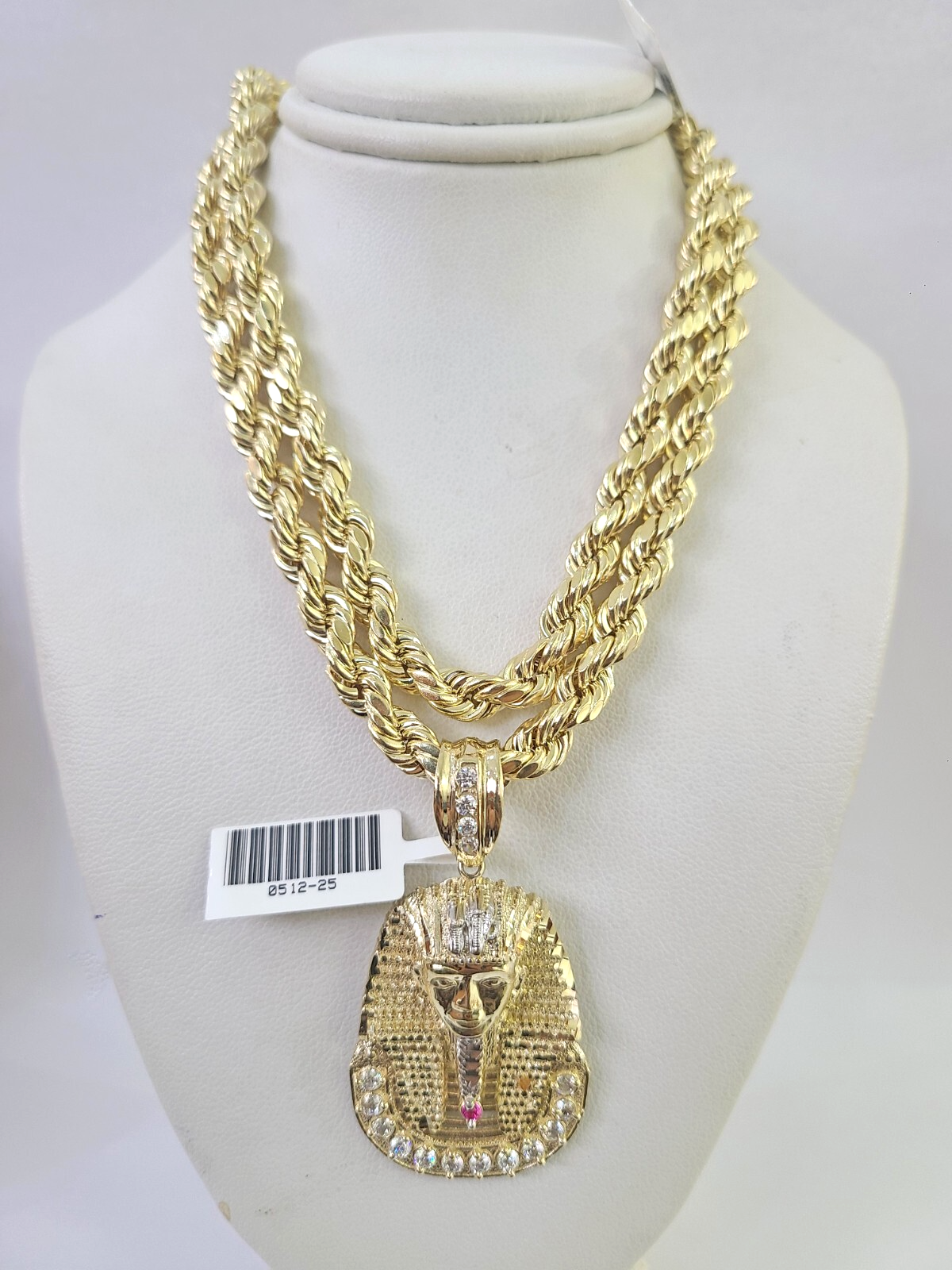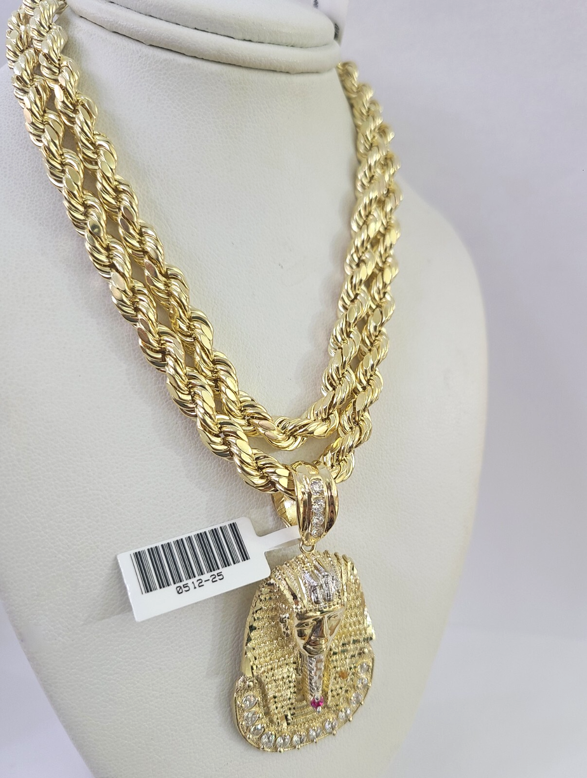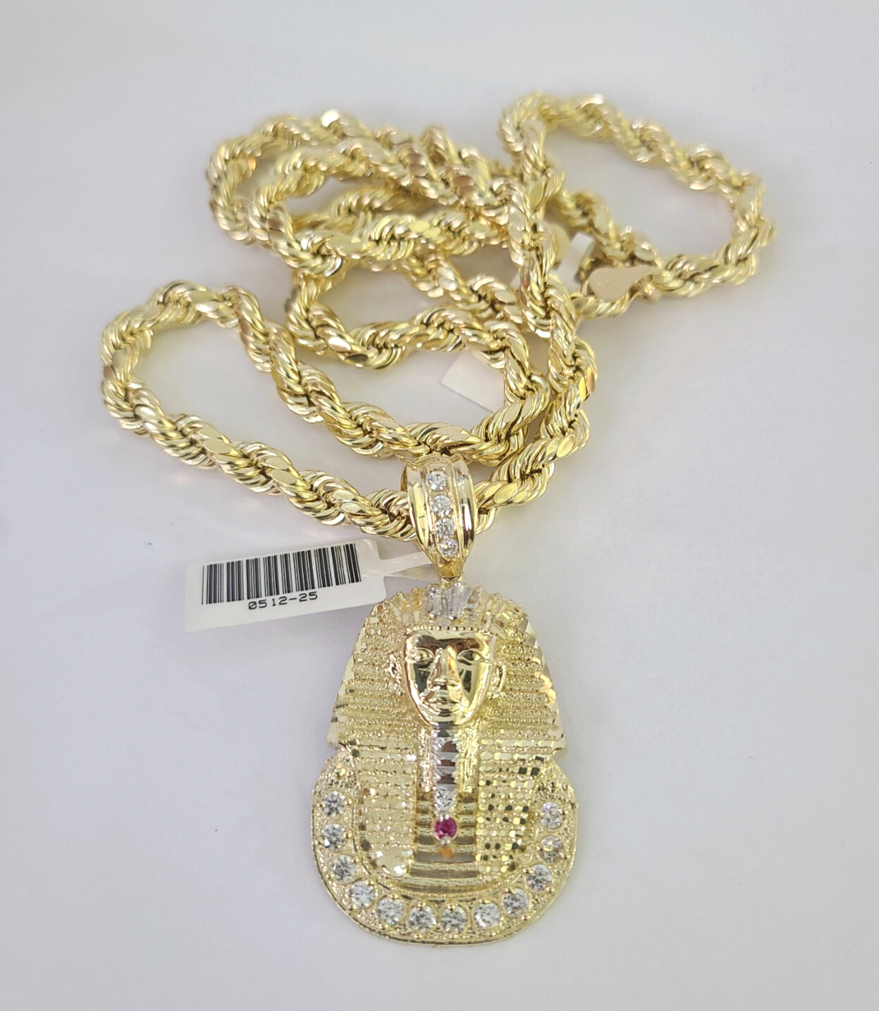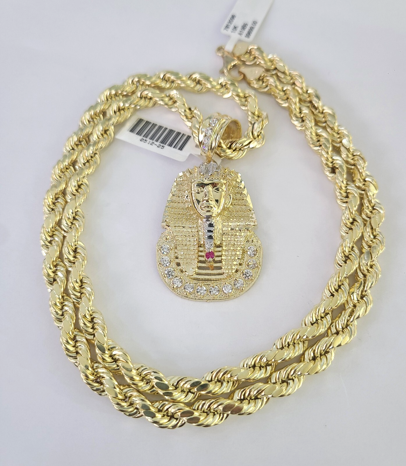10k Rope Chain Pharaoh Head Charm Pendant Yellow Gold 18"-30'' Inch 7mm Necklace