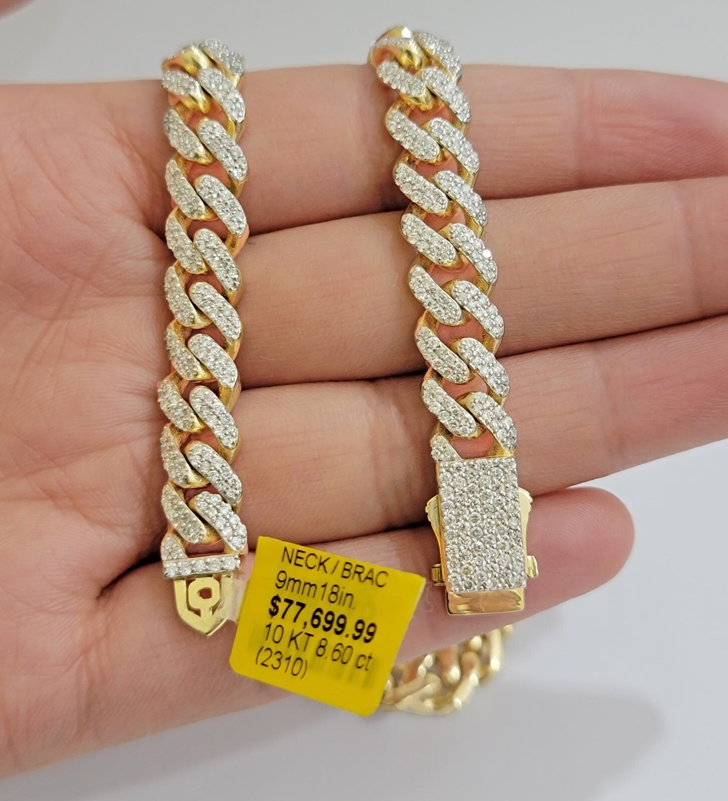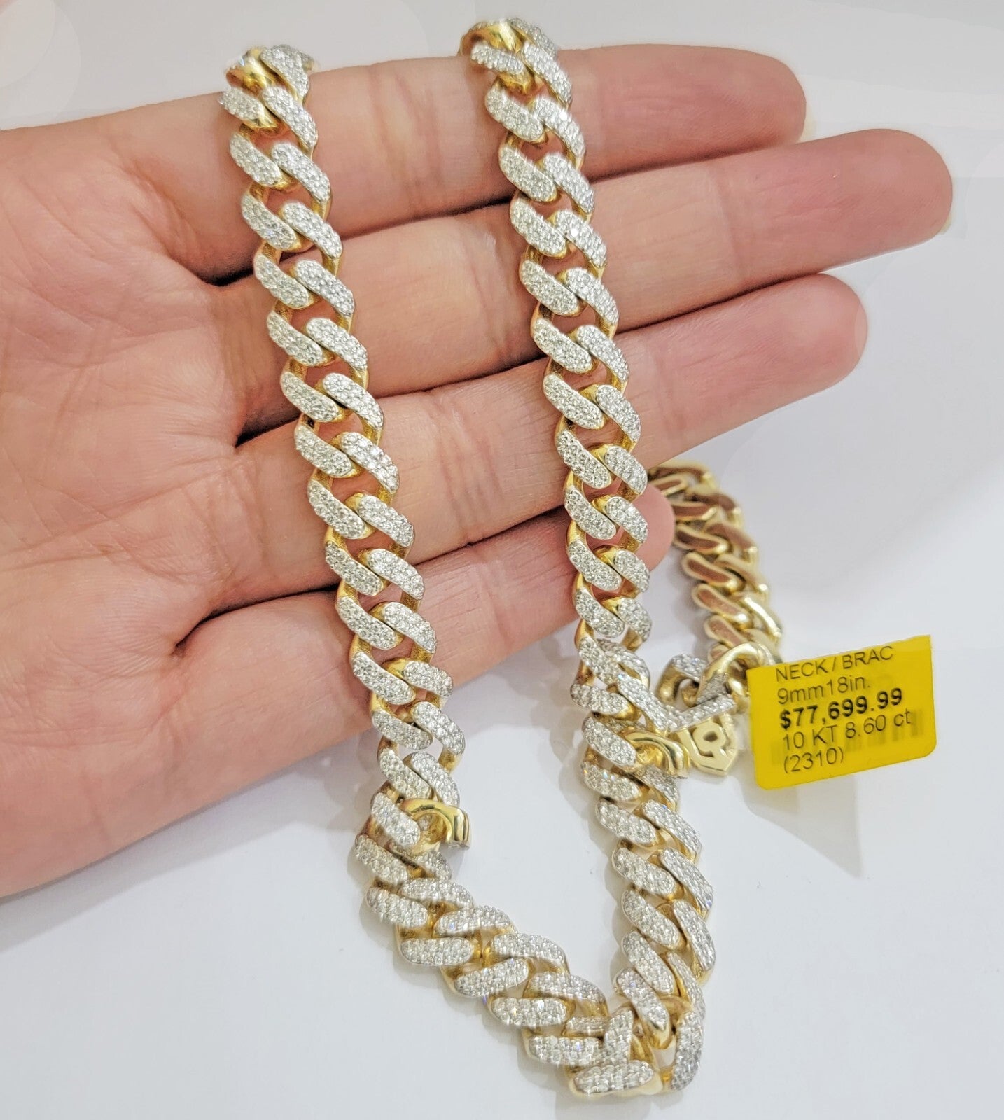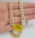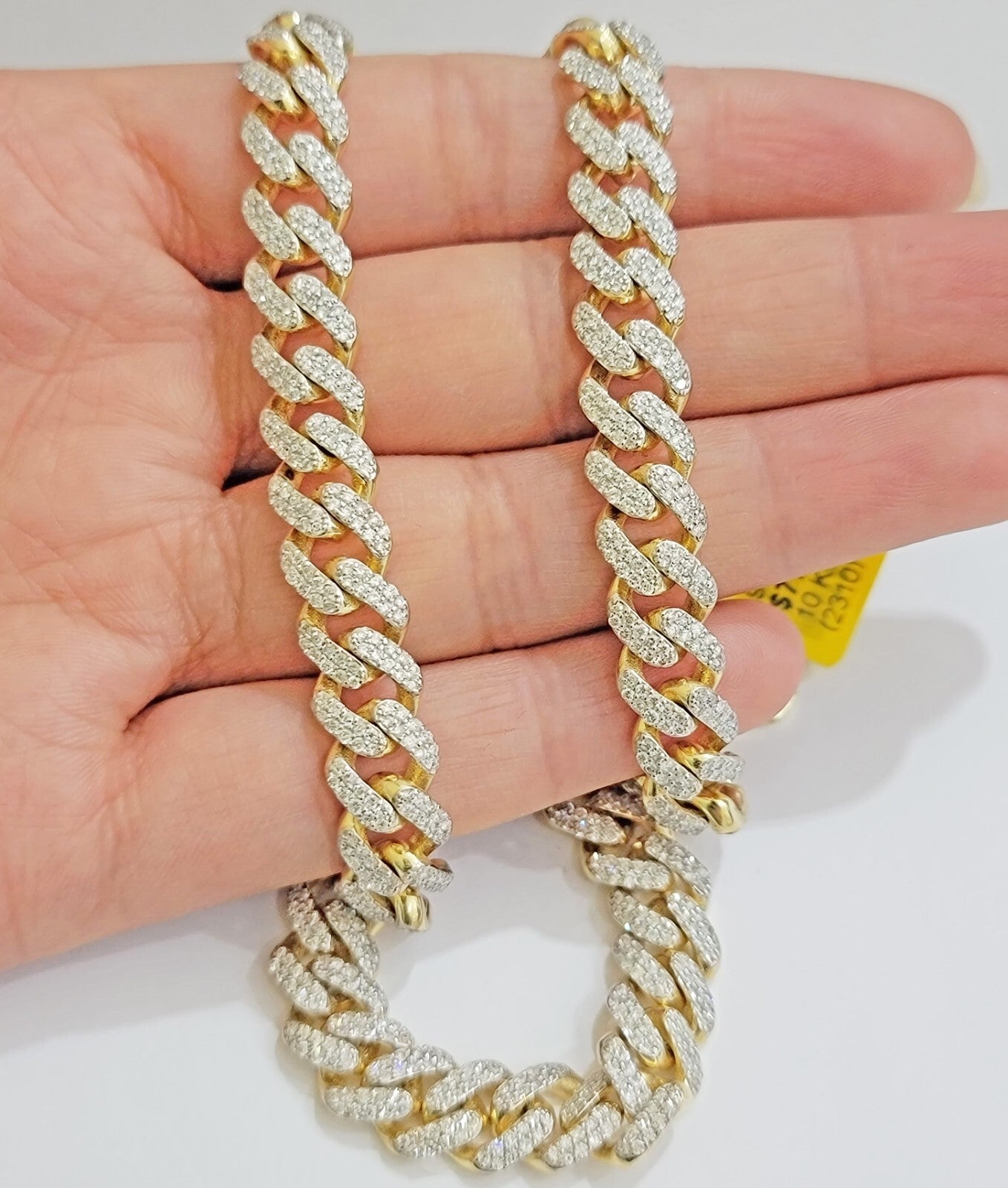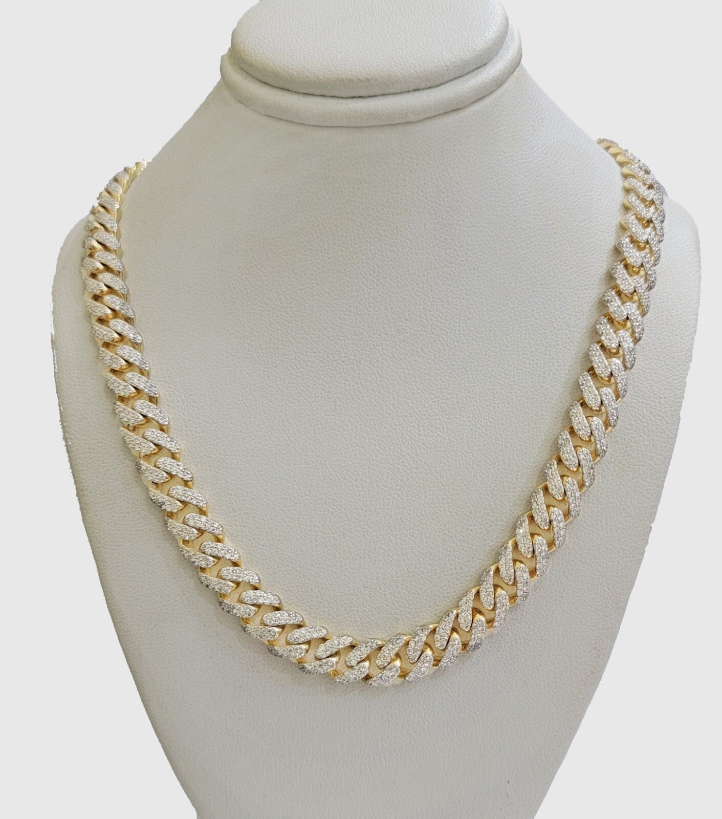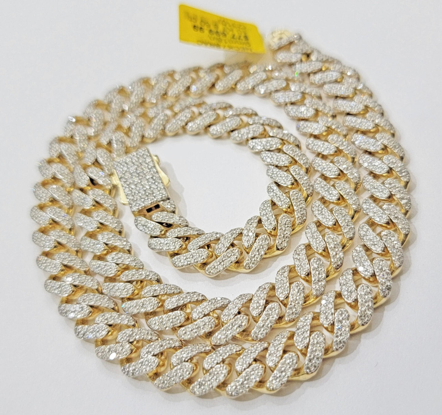 Solid 10 k Yellow Gold ( Real , Not plated , Not filled ) Miami Cuban Link chain For Men's Ladies . The Width of the necklace is 9 mm and 18 Inch Long . The Clasp is Box Clasp. The chain is Beautiful and shiny with brilliant round diamonds. We have different lengths available. If you are not happy with the way it looks or feels, we do offer 30 - Days FREE Return shipping.