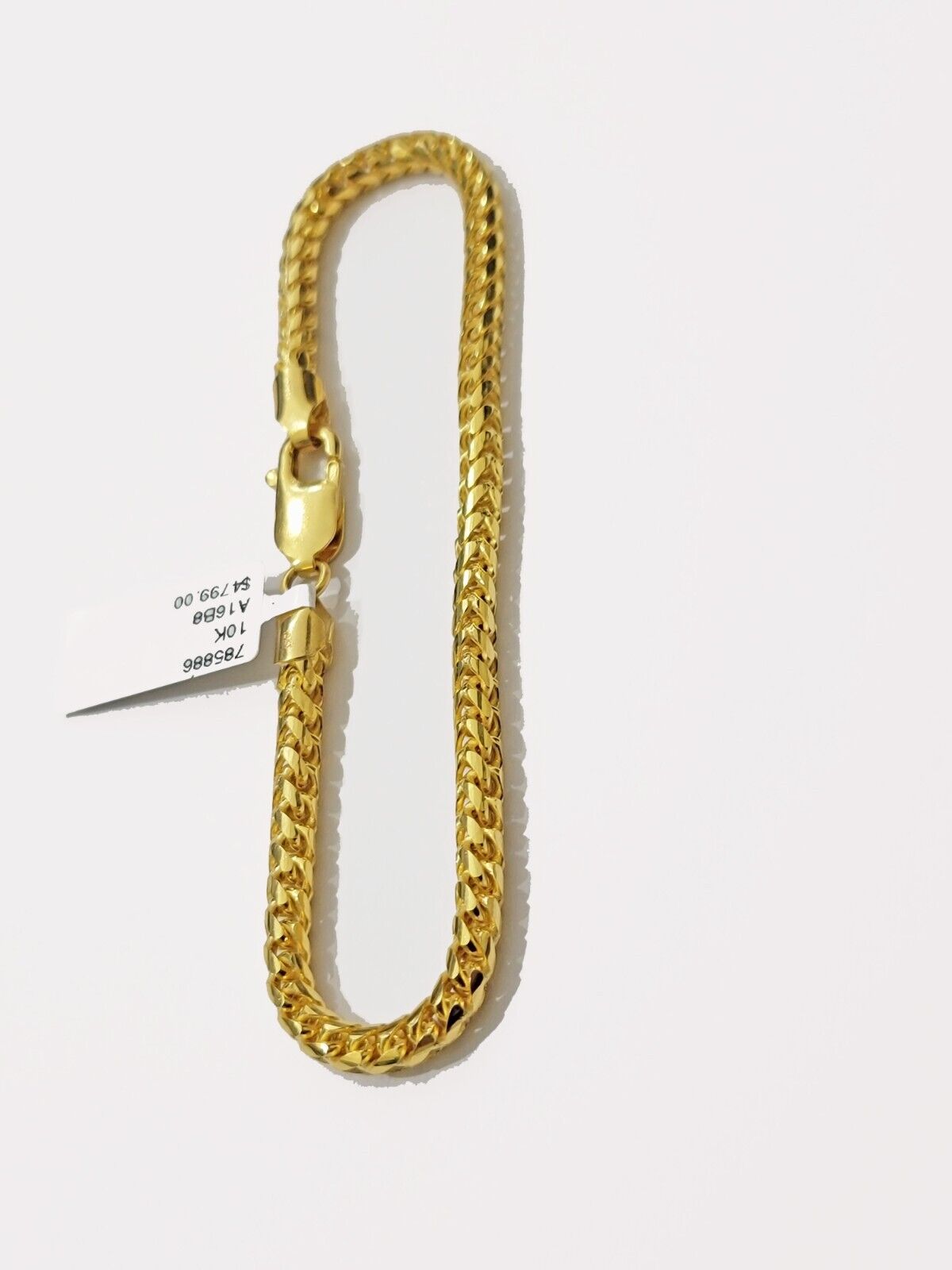 Solid 10 K Yellow Gold ( Real , Not plated , Not filled ) Franco Bracelet With Diamond Cuts For Men's. The length is 7.5 Inch Long and Width of the Bracelet is 4mm ( approx.). The Clasp is Lobster clasp. The bracelet is beautiful designed with Franco-Box style. If you are not happy with the way it looks or feels, we do offer 30 - Days FREE Return shipping.