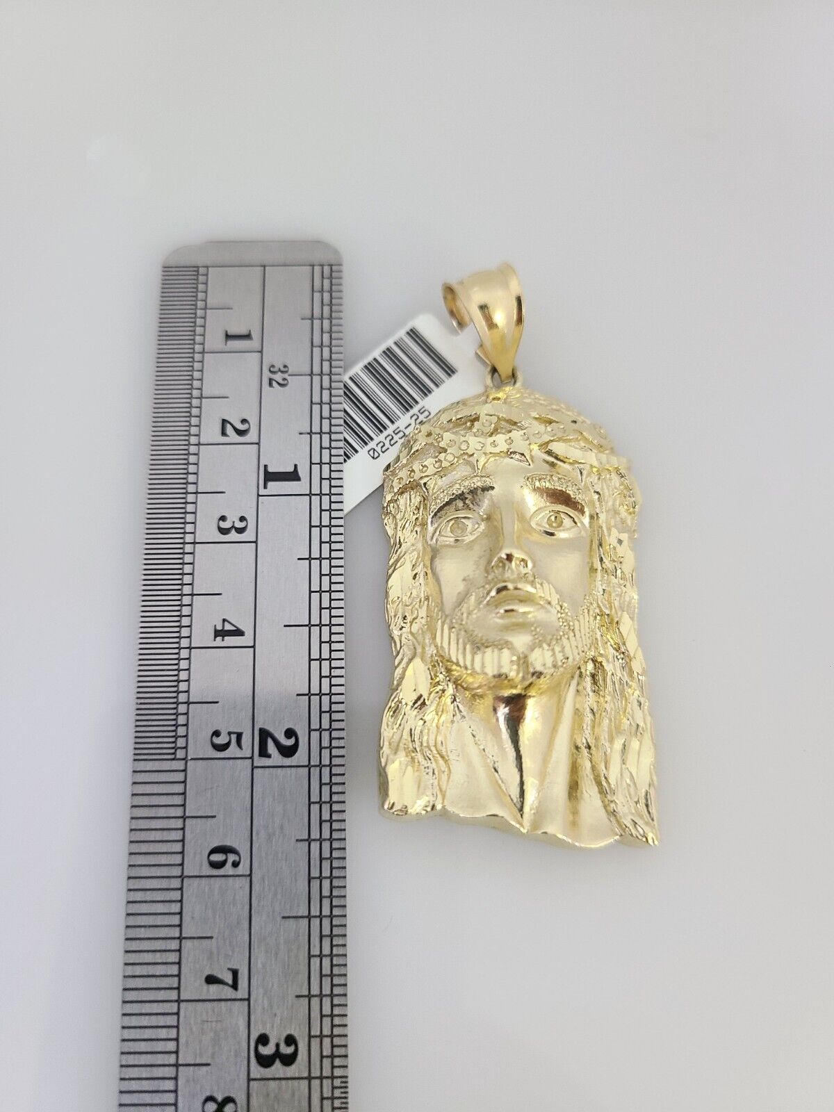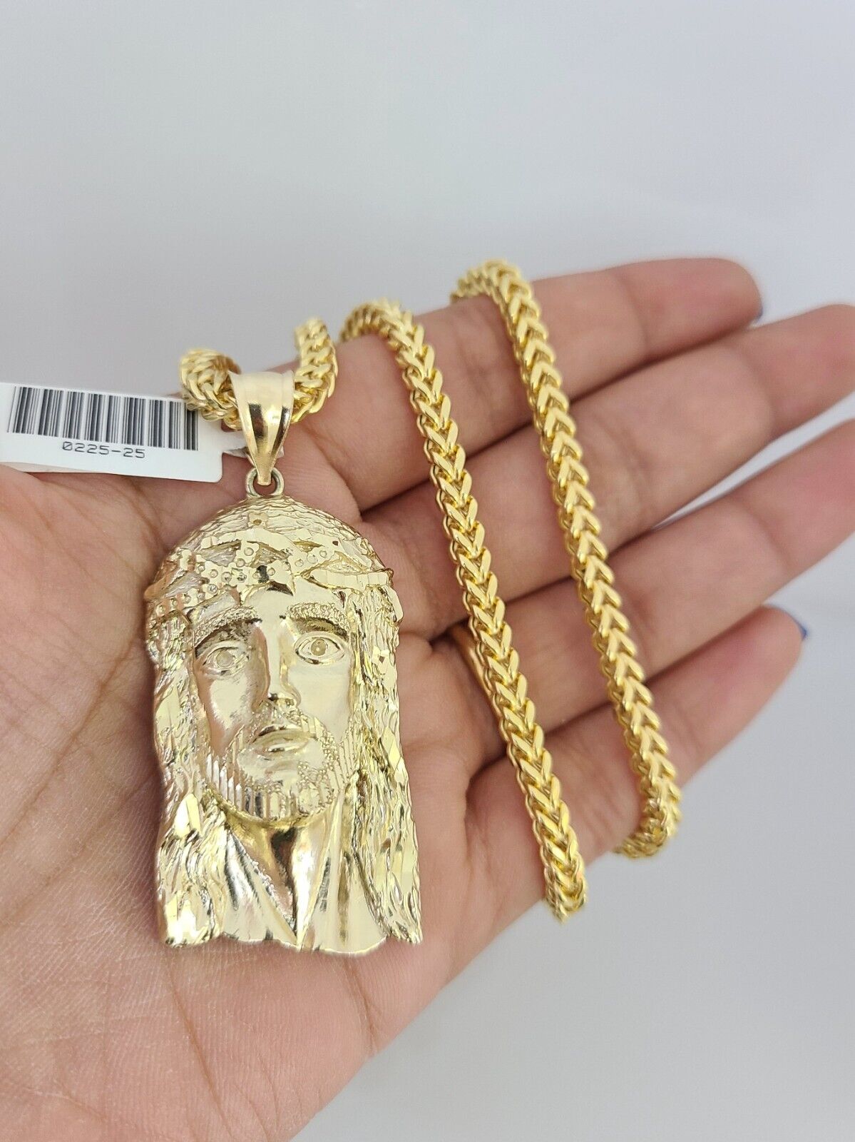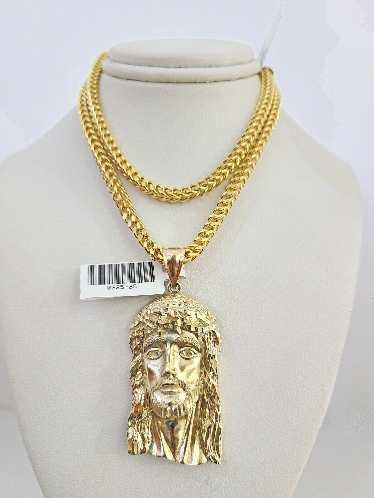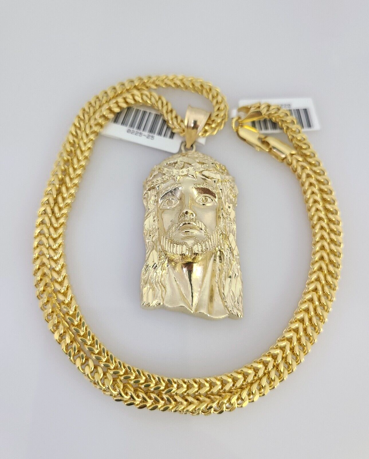 Genuine 10k Yellow Gold Franco Necklace 4mm Franco Chain with Jesus Head Charm. The Various length of the Chain are 18"-28" with Jesus Head Charm. The pendants are unique in design and considered durable too. If you are not happy with the way it looks or feels, we do offer 30 - Days FREE Return shipping. Contact us for more information.