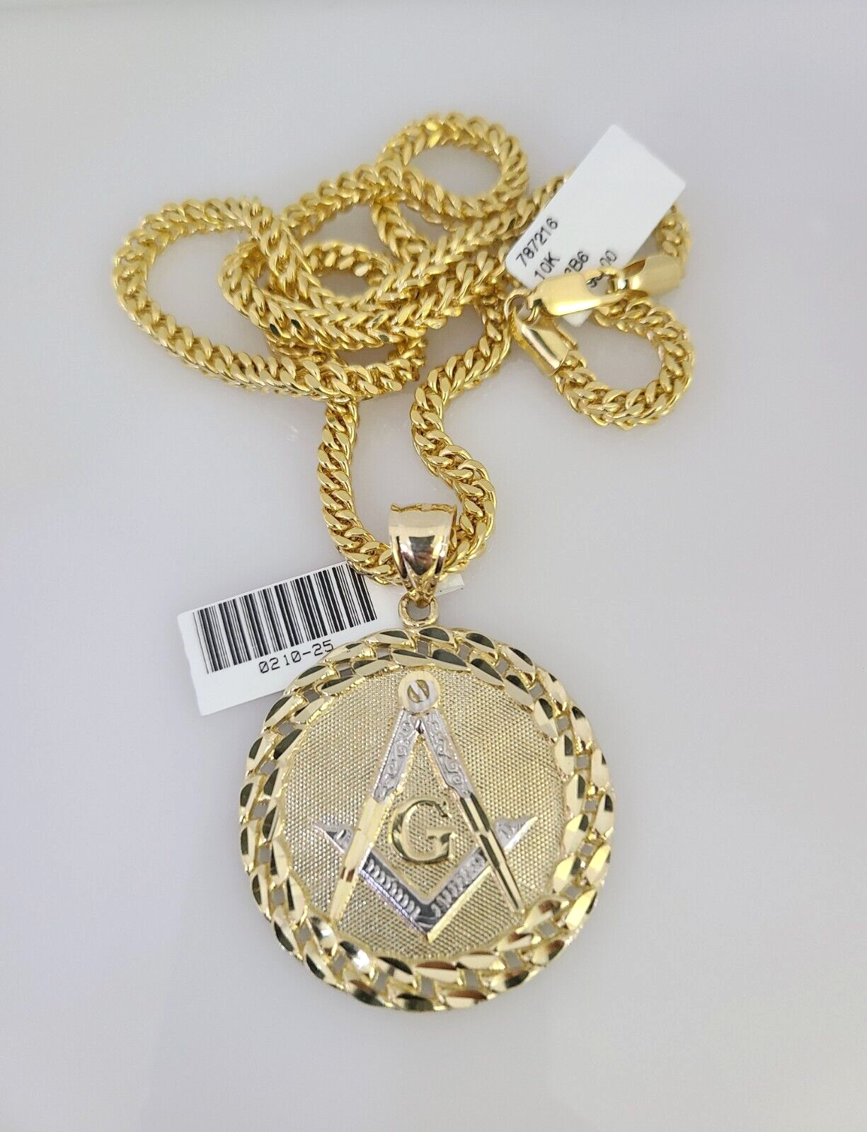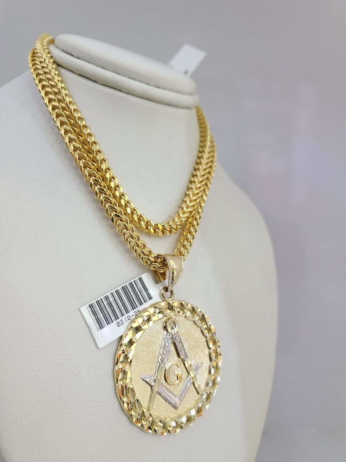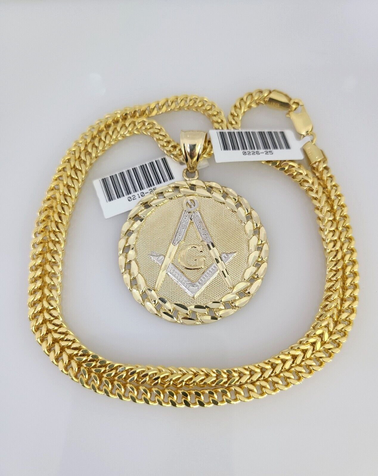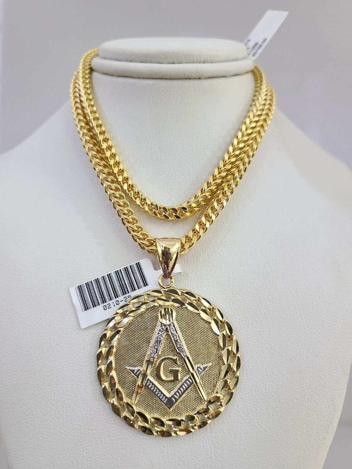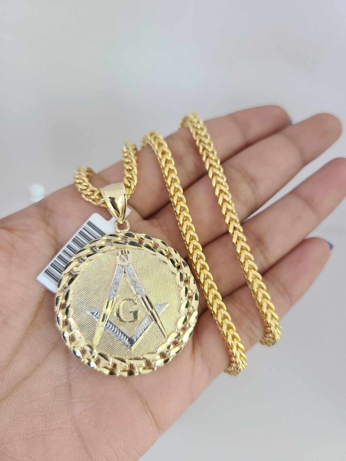 Genuine 10k Yellow Gold Franco Necklace 4mm Franco Chain with Masonic Charm. The Various length of the Chain are 18"-28" with Masonic Charm. The pendants are unique in design and considered durable too. If you are not happy with the way it looks or feels, we do offer 30 - Days FREE Return shipping. Contact us for more information.