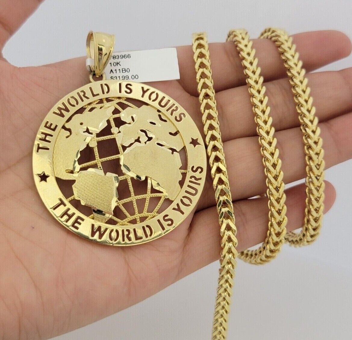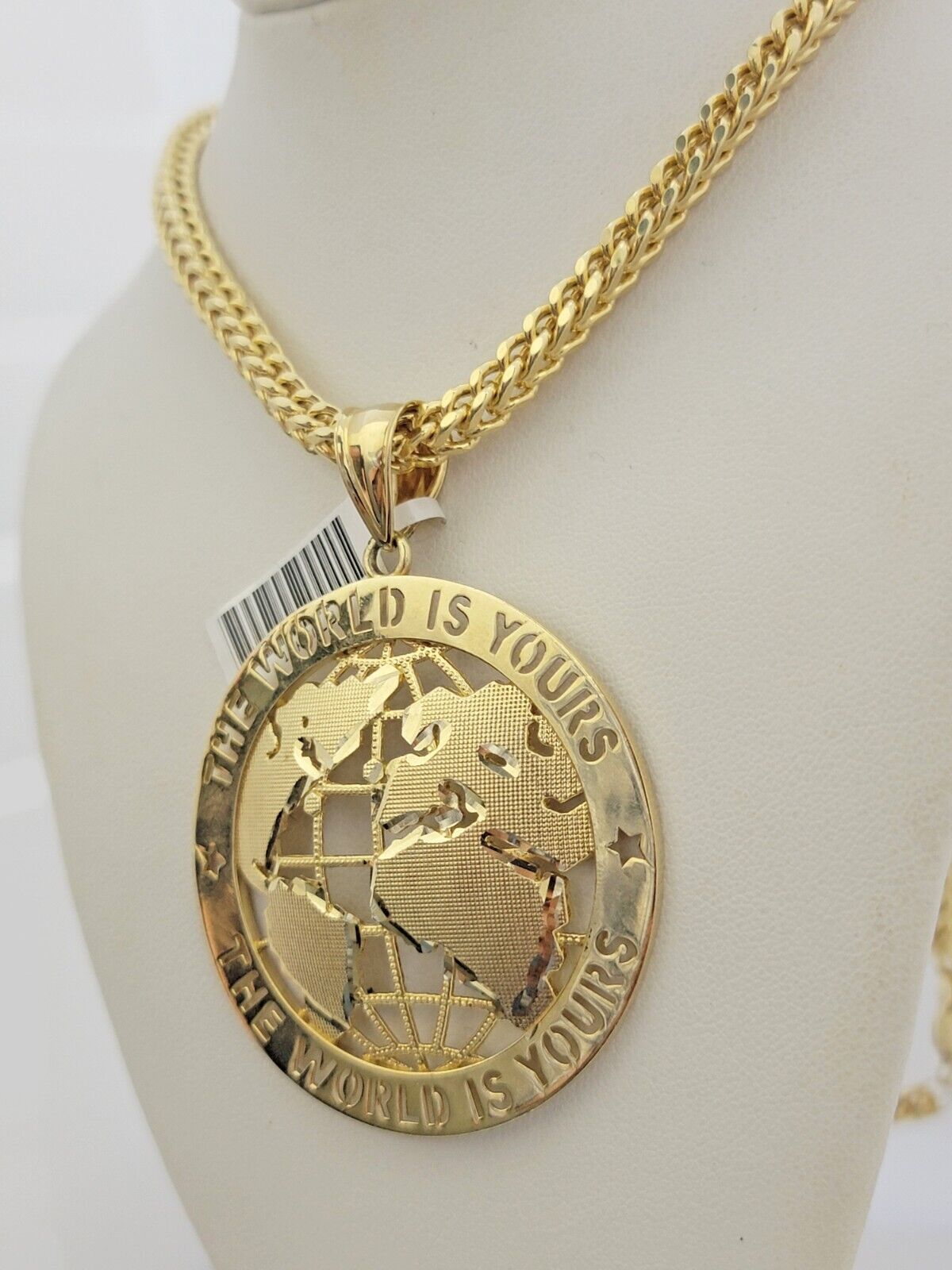 Genuine 10 k Yellow Gold Franco Necklace 5mm Chain With World Map Charm. The Various length of the Chain are 20"-26" with World Map Charm 2.5 inches (approx.). The pendants are unique in design and considered durable too. If you are not happy with the way it looks or feels, we do offer 30 - Days FREE Return shipping. Contact us for more information.