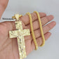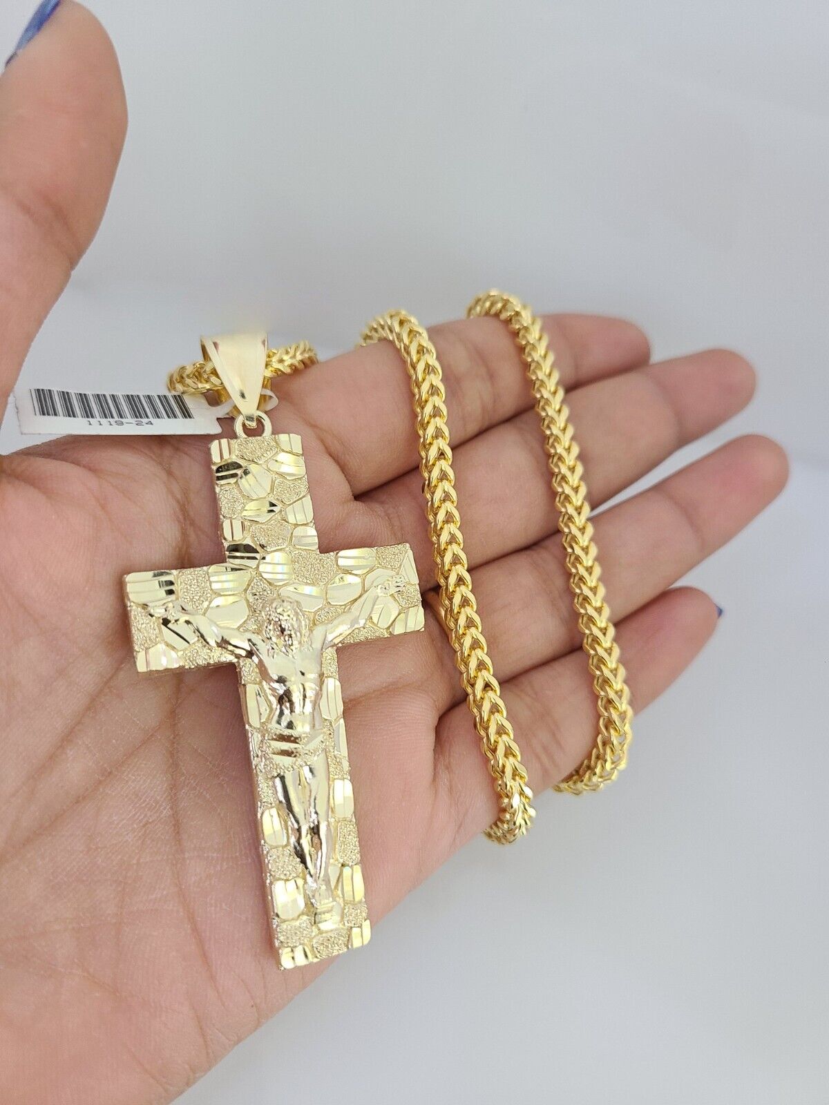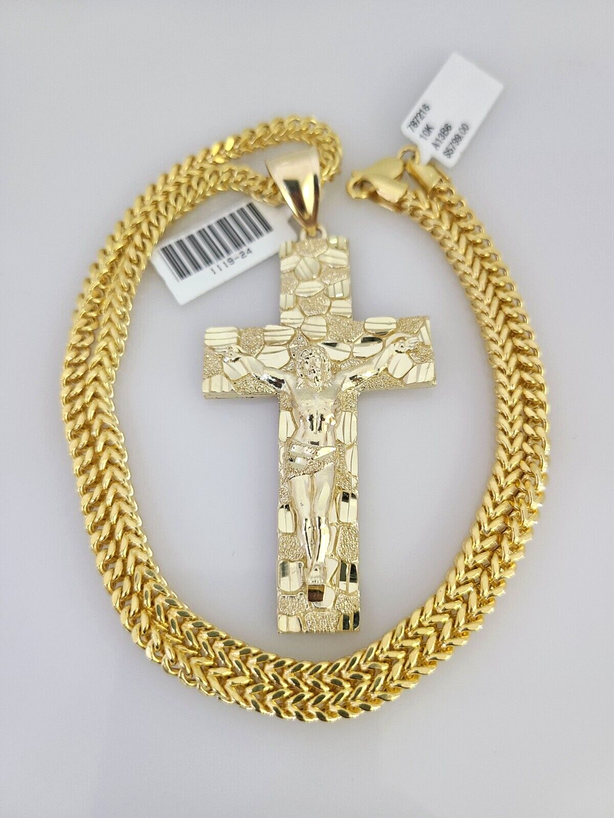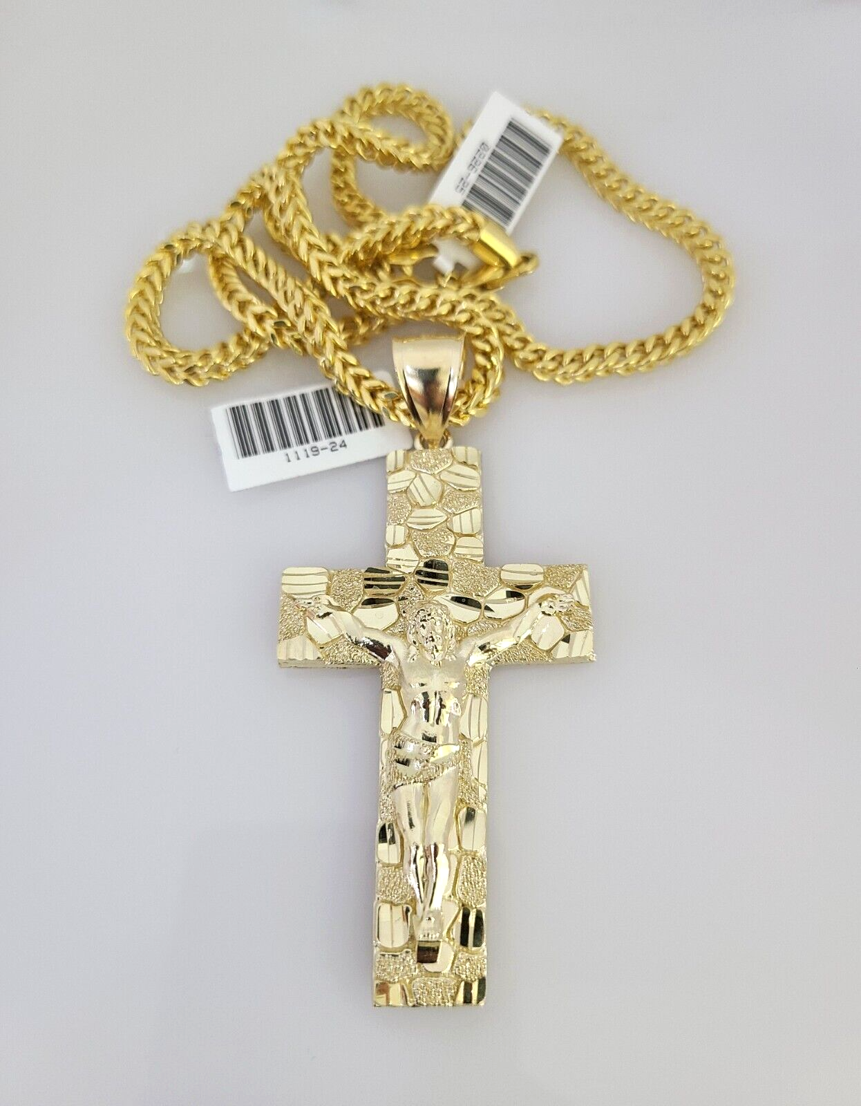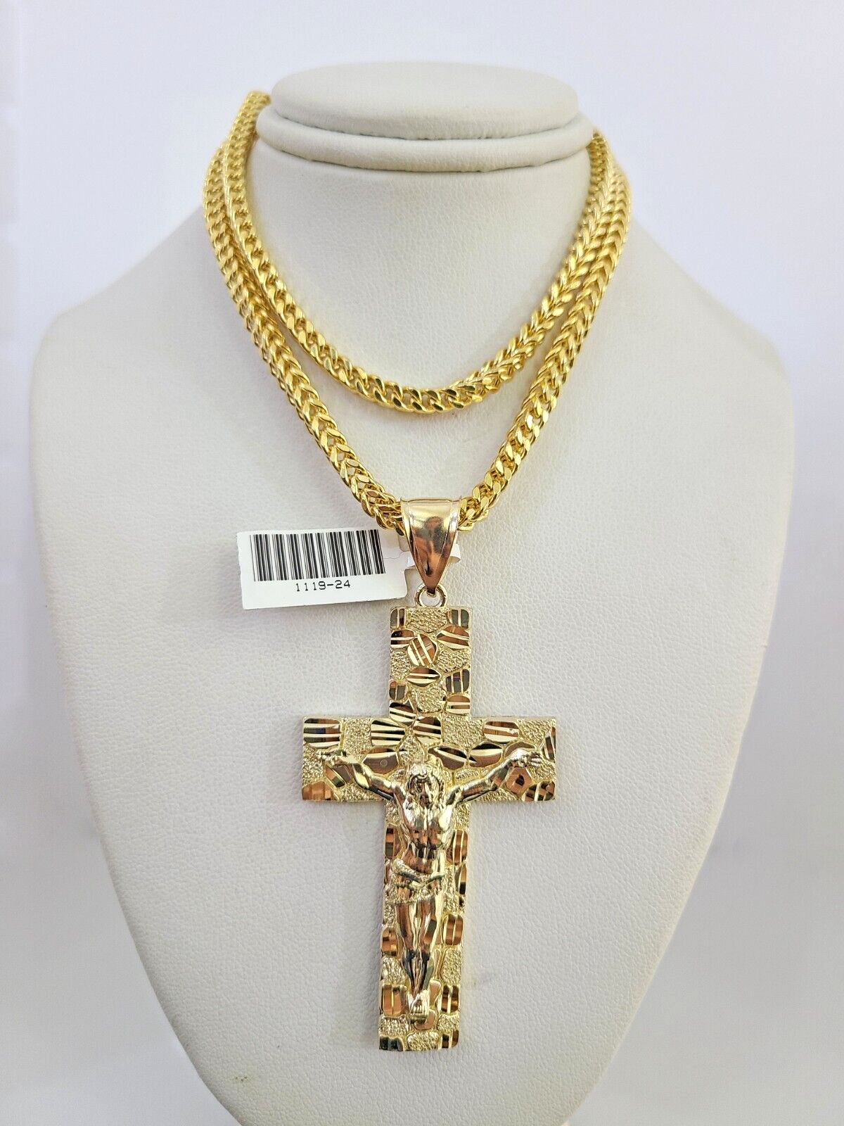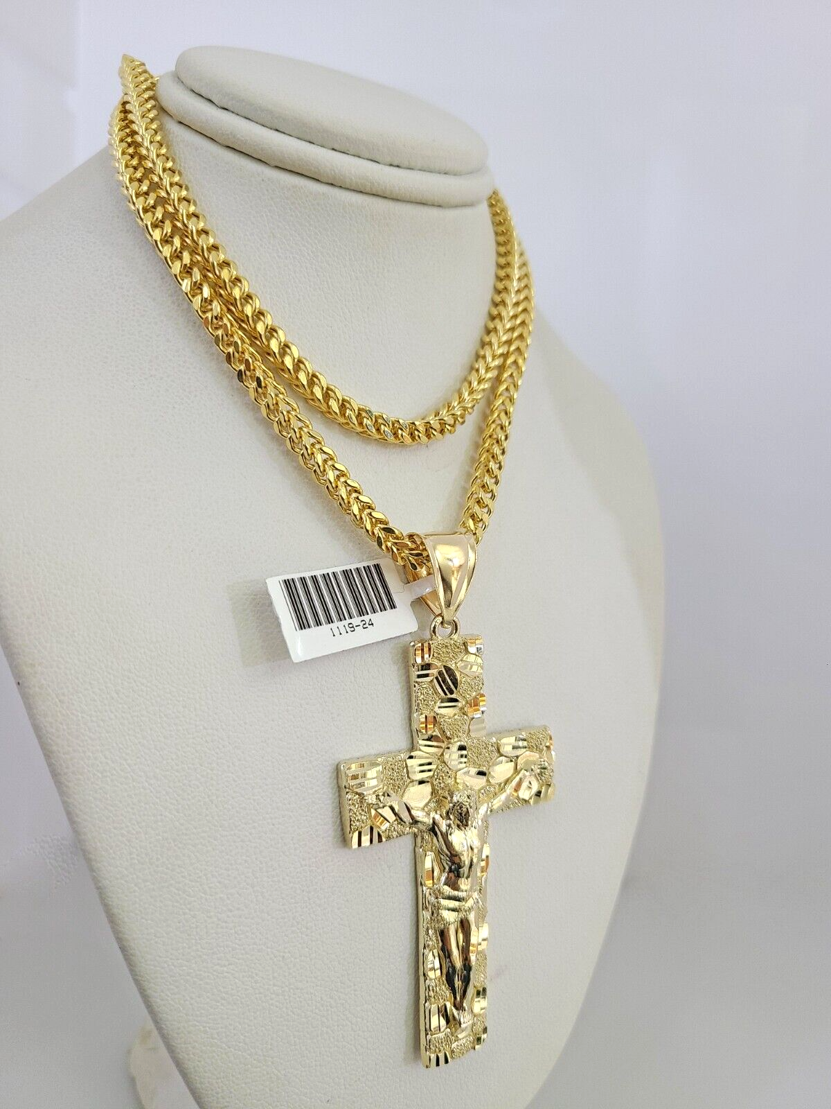 Genuine 10k Yellow Gold Franco Necklace 4mm Franco Chain with Nugget Jesus Cross Charm. The Various length of the Chain are 18"-28" with Nugget Jesus Cross Charm. The pendants are unique in design and considered durable too. If you are not happy with the way it looks or feels, we do offer 30 - Days FREE Return shipping. Contact us for more information.