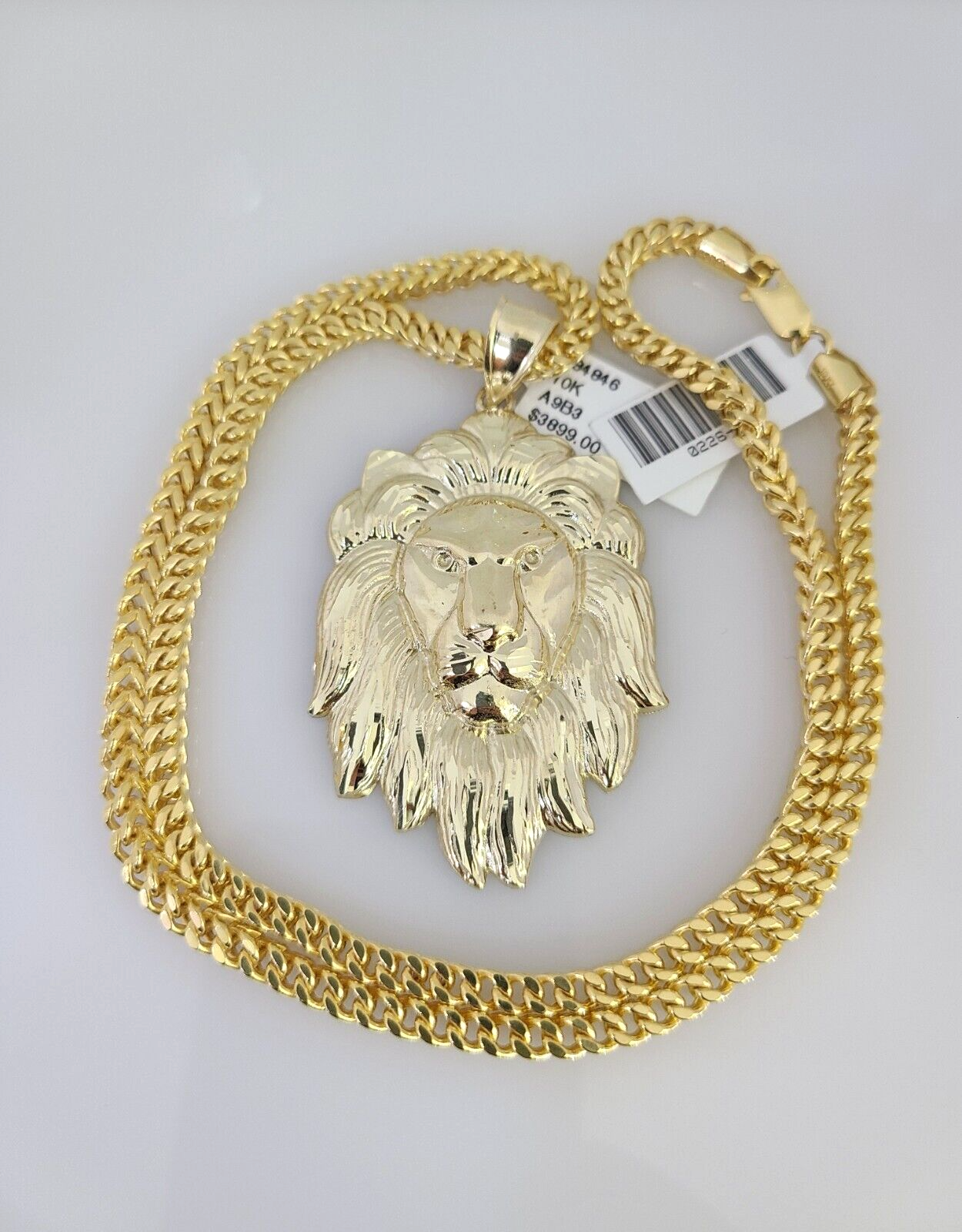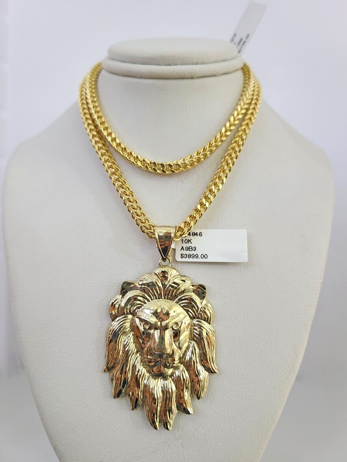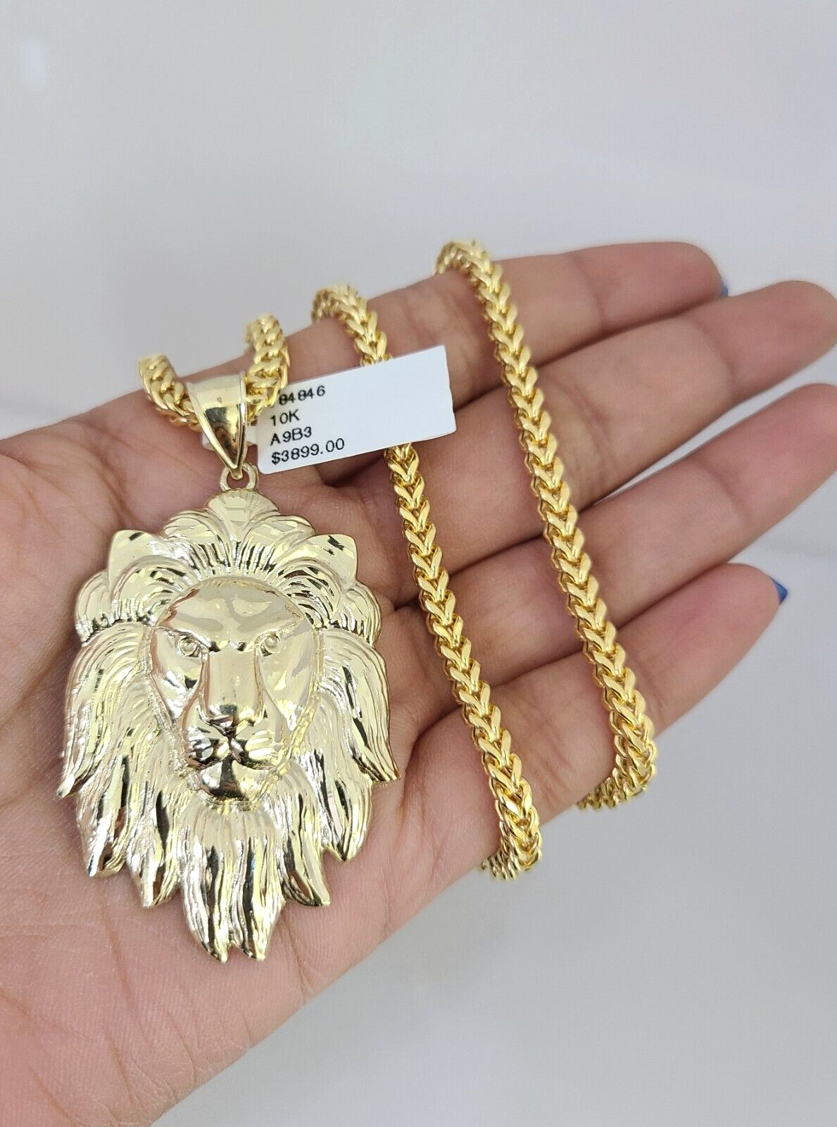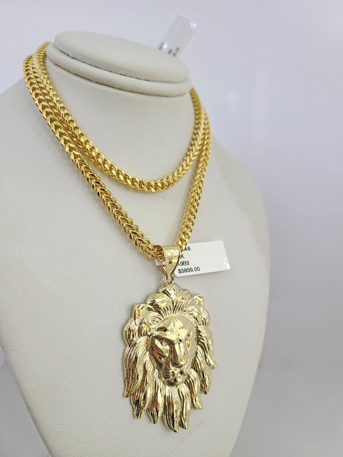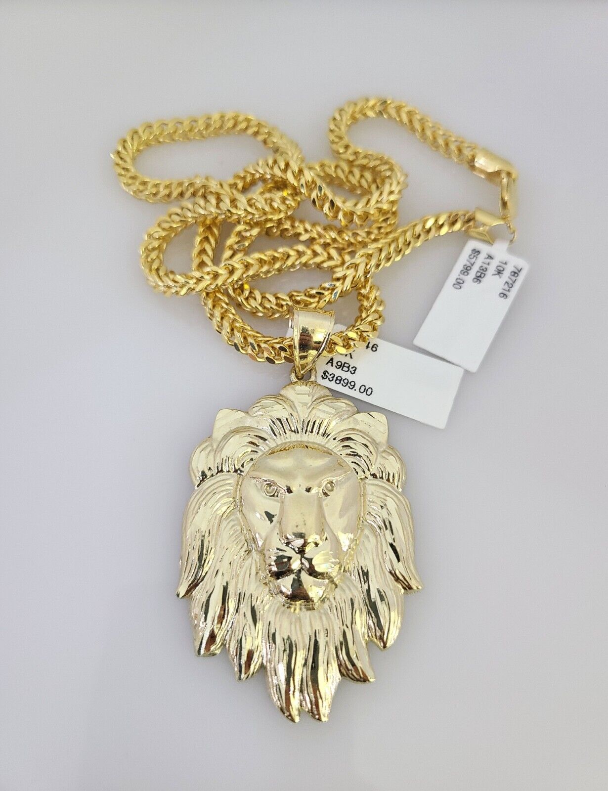 Genuine 10k Yellow Gold Franco Necklace 4mm Franco Chain with Roaring Lion Charm. The Various length of the Chain are 18"-28" with Roaring Lion Charm. The pendants are unique in design and considered durable too. If you are not happy with the way it looks or feels, we do offer 30 - Days FREE Return shipping. Contact us for more information.