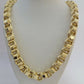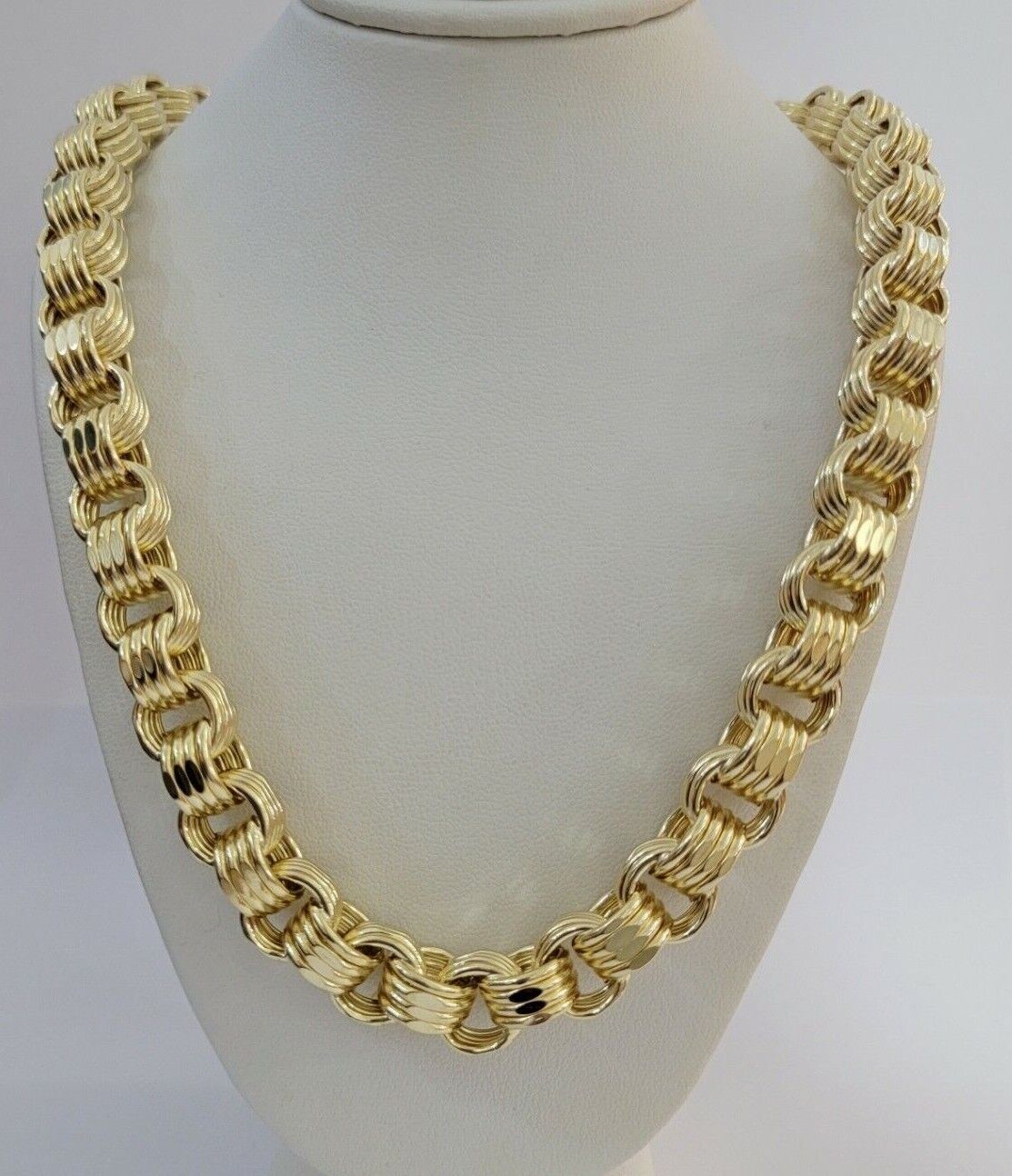 10 KT Yellow Gold ( Real , Not plated , Not filled ) Byzantine Thick Necklace chain. The Width of the necklace is 12.5 MM and in Length 28 Inches. The Clasp is Lobster Lock. The chain is considered durable. If you are not happy with the way it looks or feels, we do offer