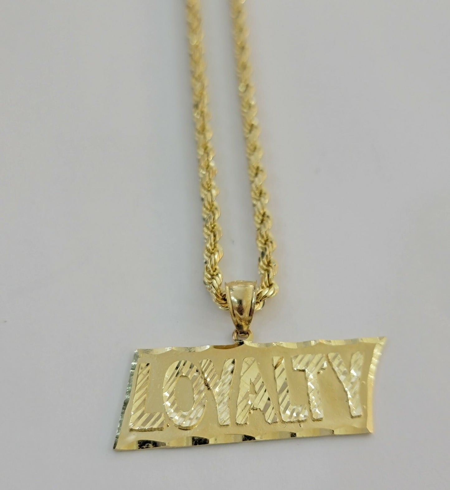 10 k Yellow Gold Real (Not plated , Not filled ) Loyalty charm pendant With 10k gold rope chain 22" 3mm . The Length of the Pendant is 1 inches (approx. ) Long and 3.4 grams. The pendant can be worn with any chain. If you are not happy with the way it looks or feels, we do offer FREE Return shipping.