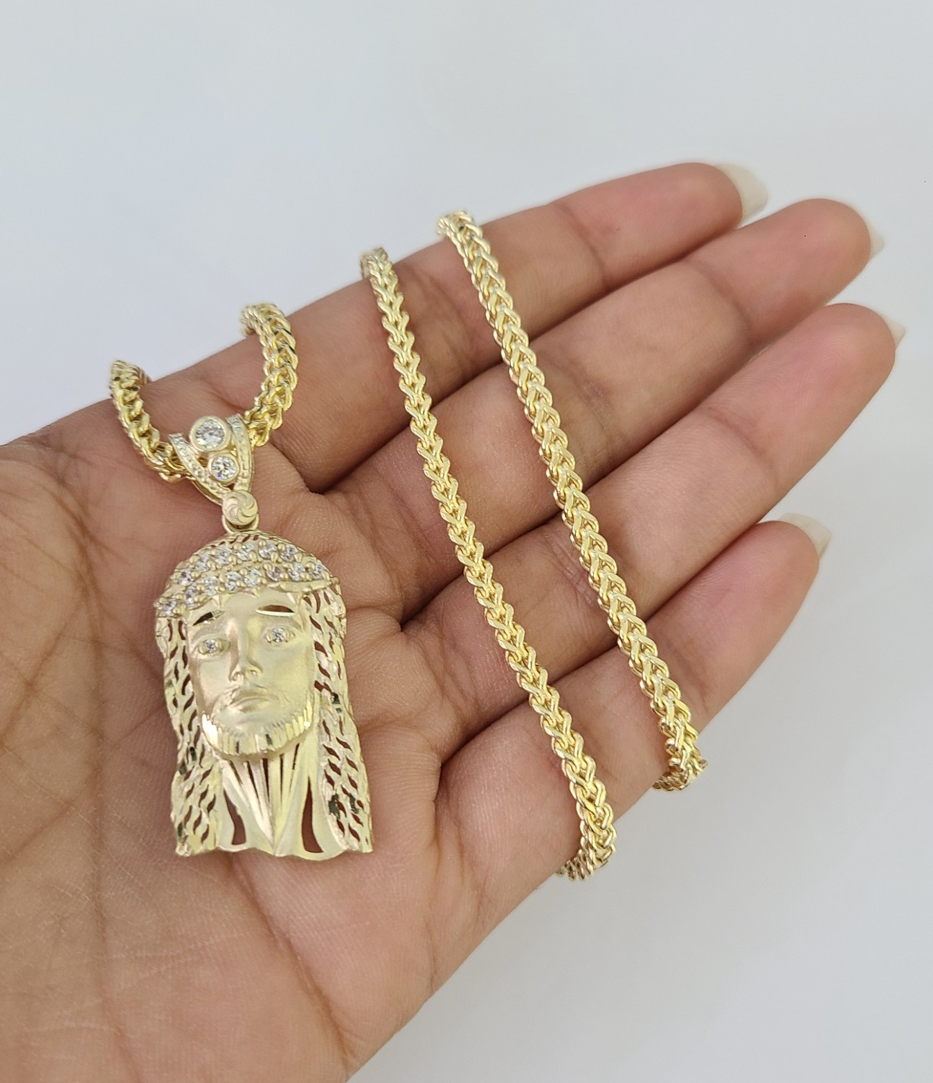Genuine 10k Yellow Gold Franco Necklace 3mm Chain with Jesus Head Charm. The Various length of the Chain are 18"-28" inches. The pendants are unique in design and considered durable too. If you are not happy with the way it looks or feels, we do offer 30 - Days FREE Return shipping. Contact us for more information.
