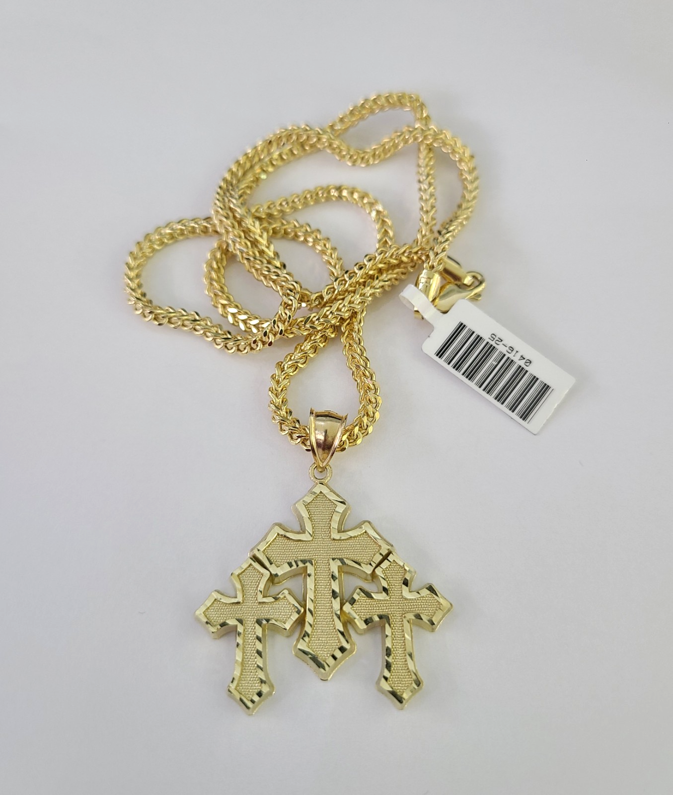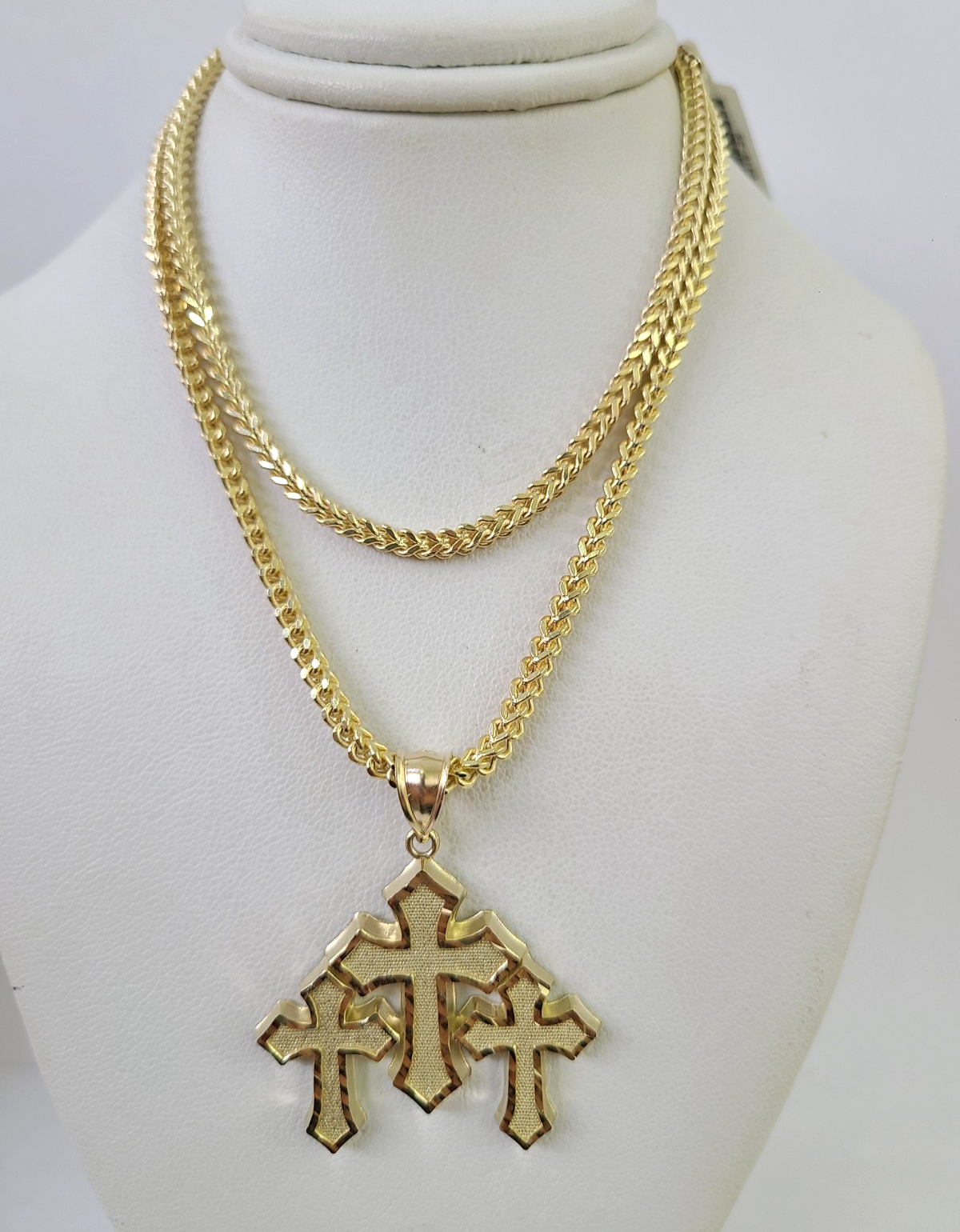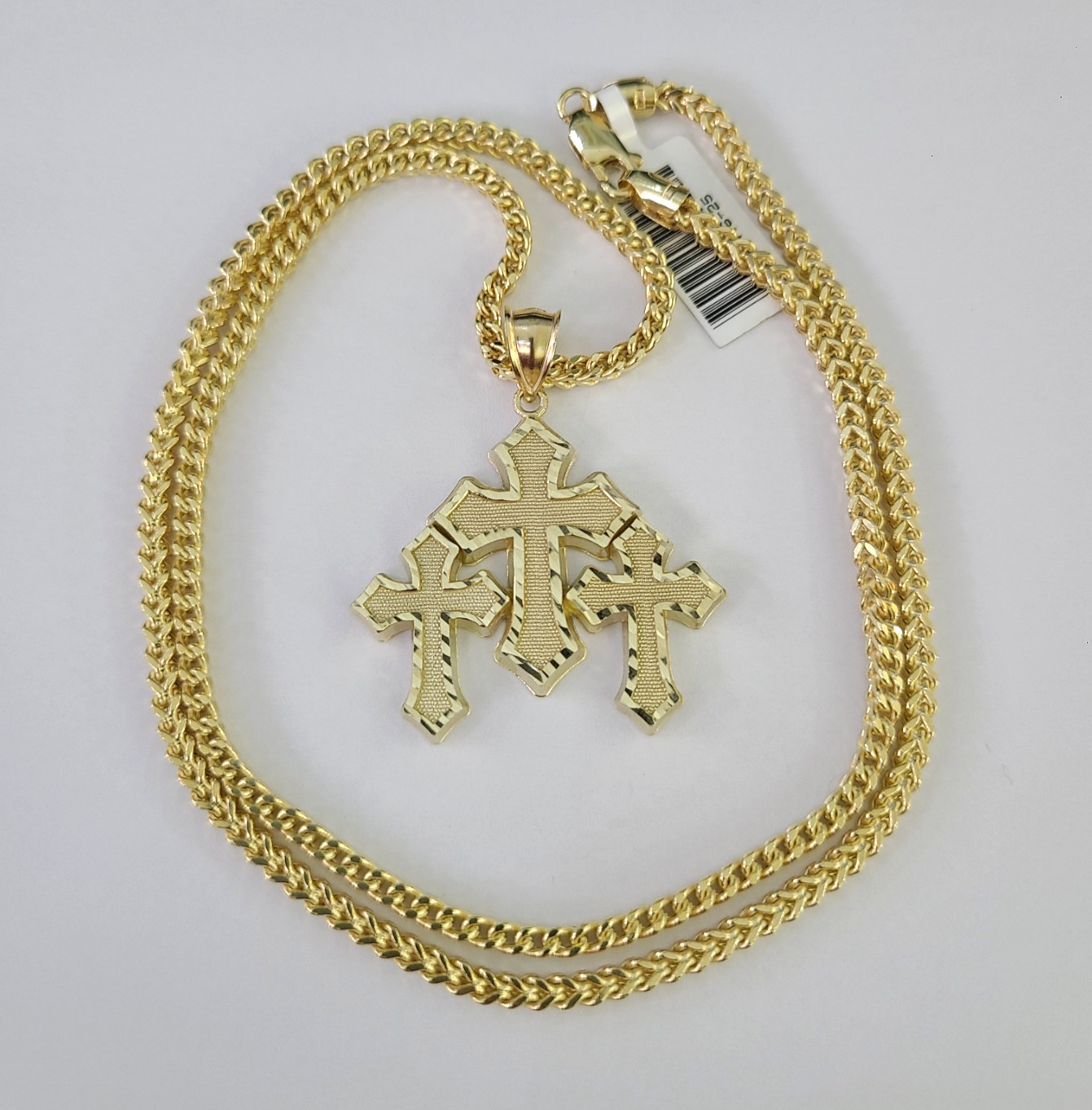 Genuine 10k Yellow Gold Franco Necklace 3mm Chain with Jesus Triple Cross Charm. The Various length of the Chain are 18"-28" inches. The pendants are unique in design and considered durable too. If you are not happy with the way it looks or feels, we do offer 30 - Days FREE Return shipping. Contact us for more information.