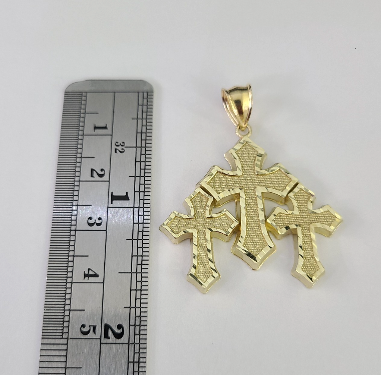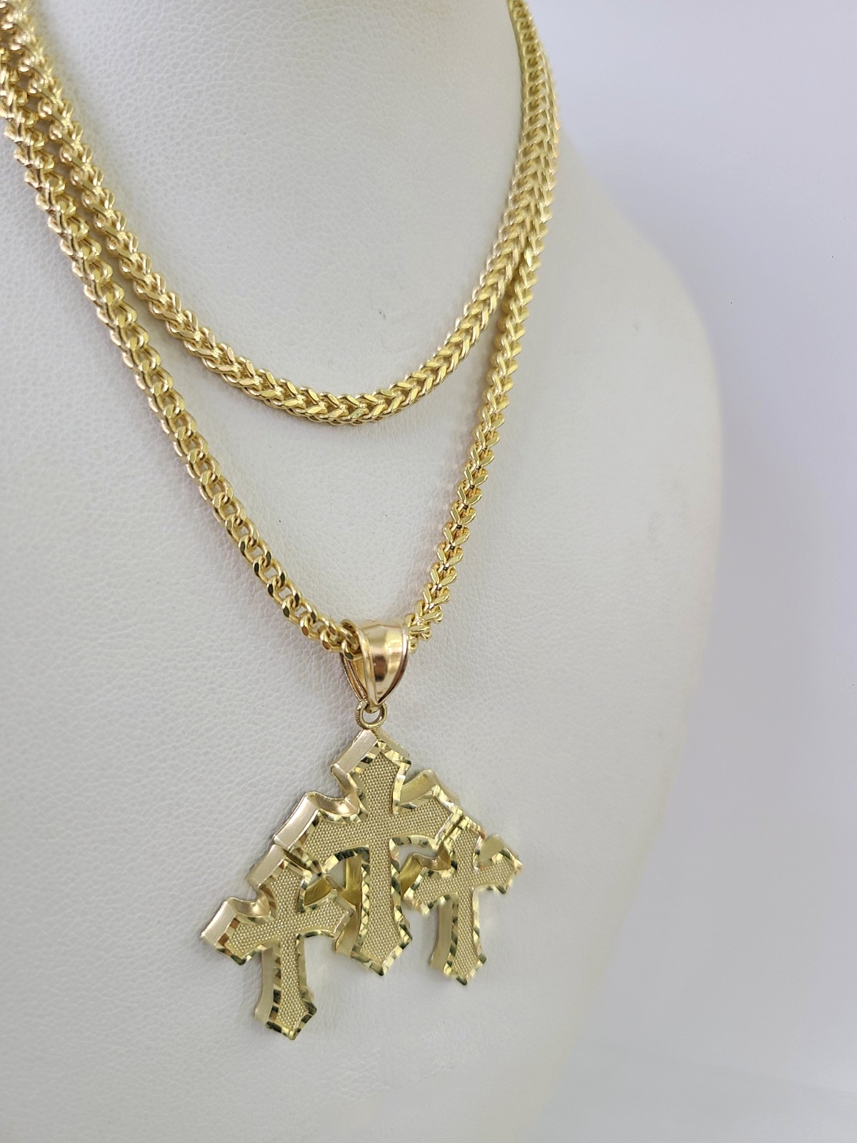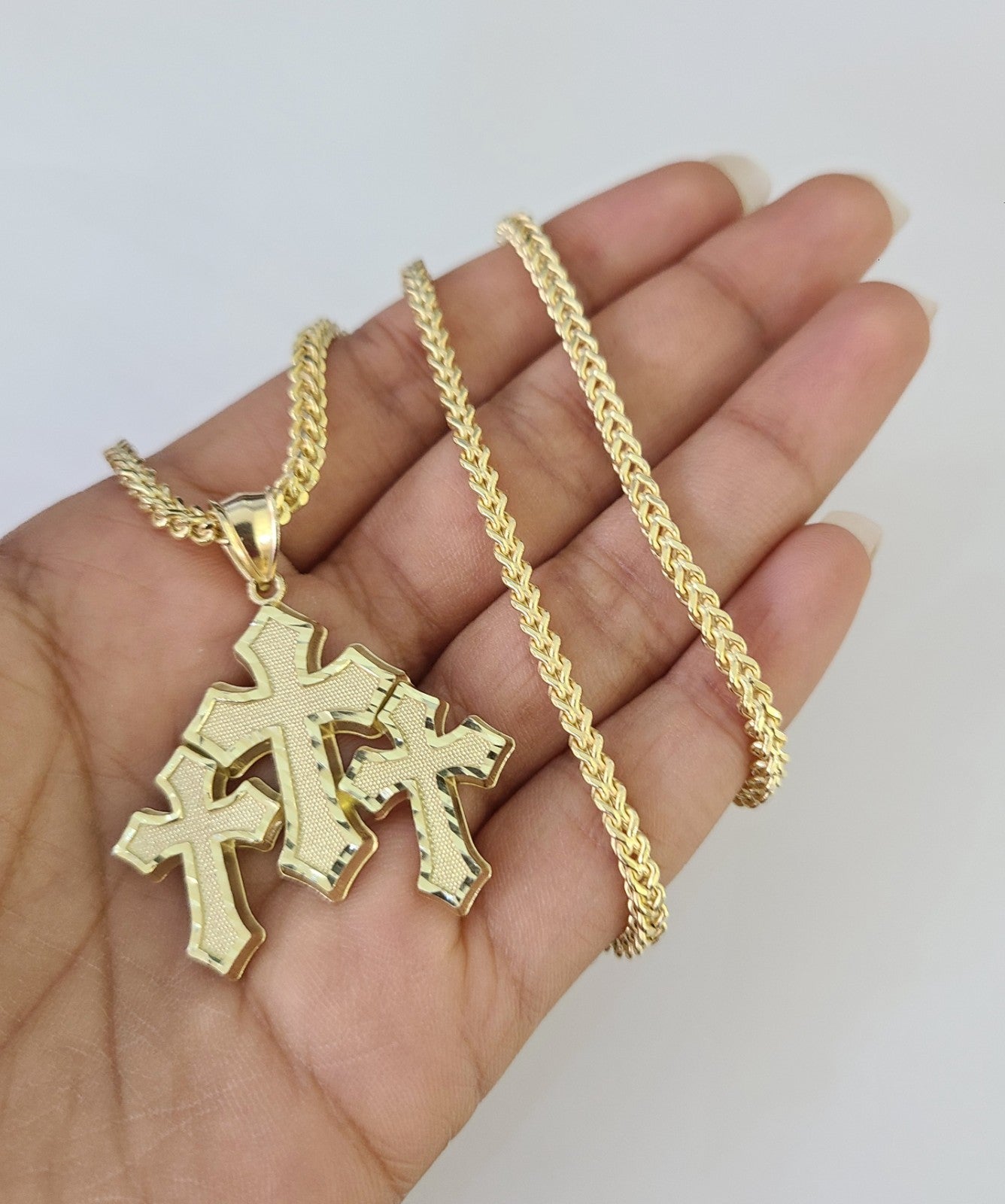 Genuine 10k Yellow Gold Franco Necklace 3mm Chain with Jesus Triple Cross Charm. The Various length of the Chain are 18"-28" inches. The pendants are unique in design and considered durable too. If you are not happy with the way it looks or feels, we do offer 30 - Days FREE Return shipping. Contact us for more information.