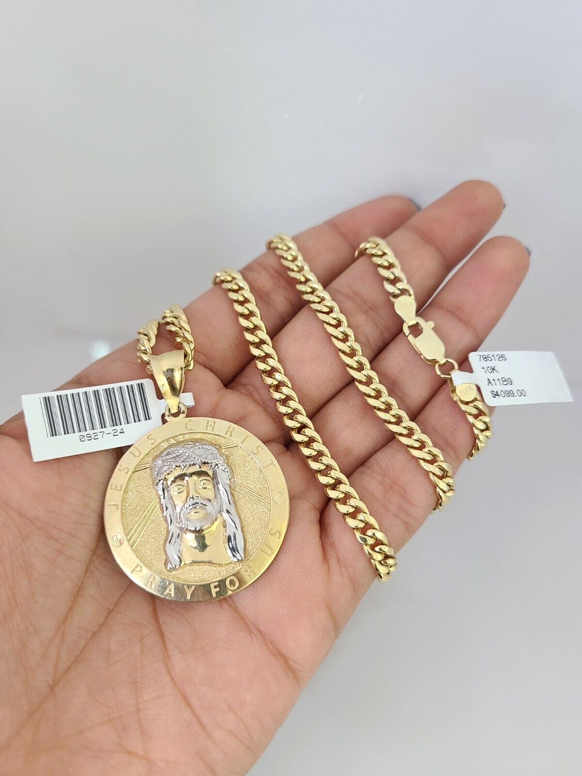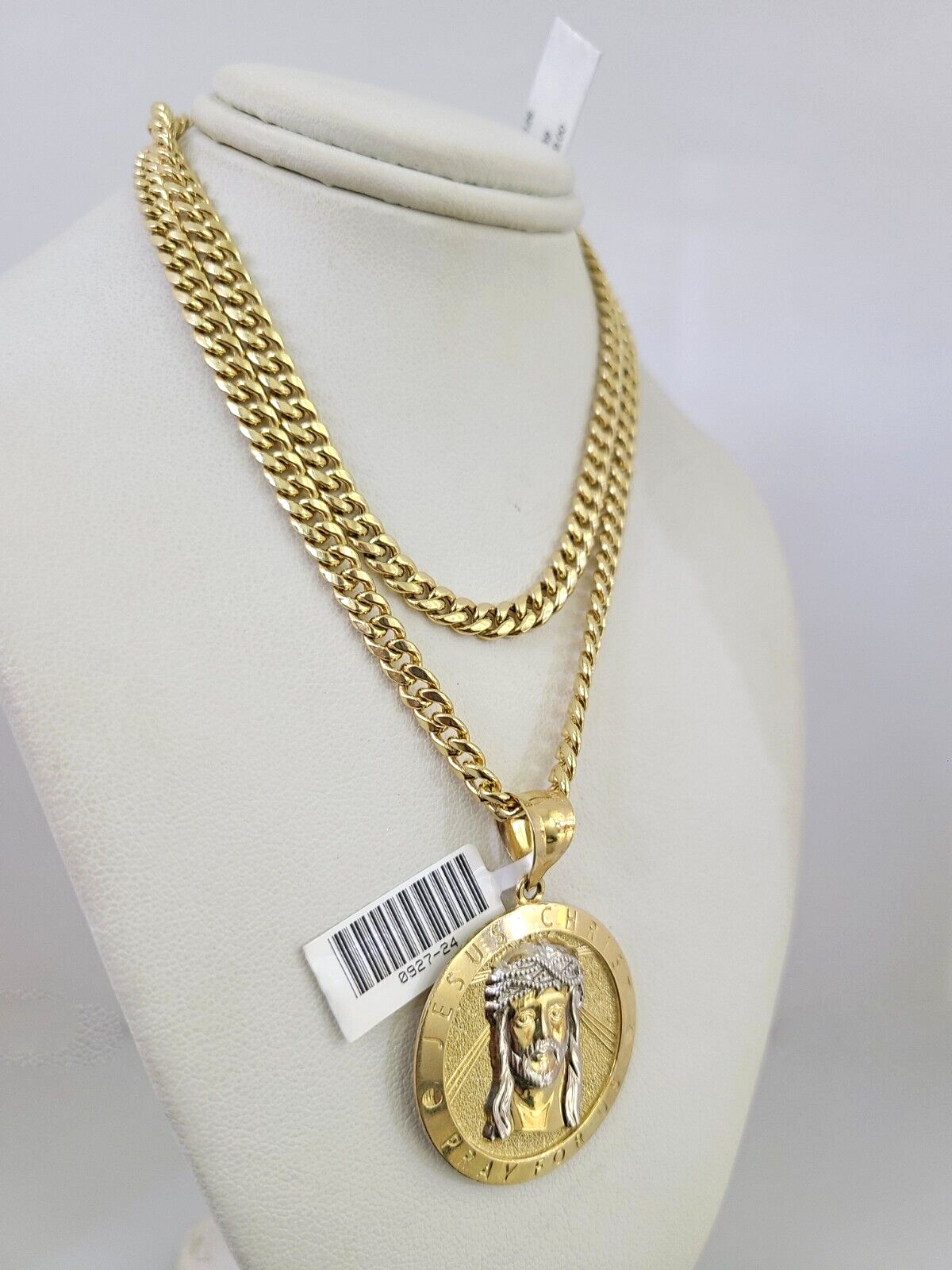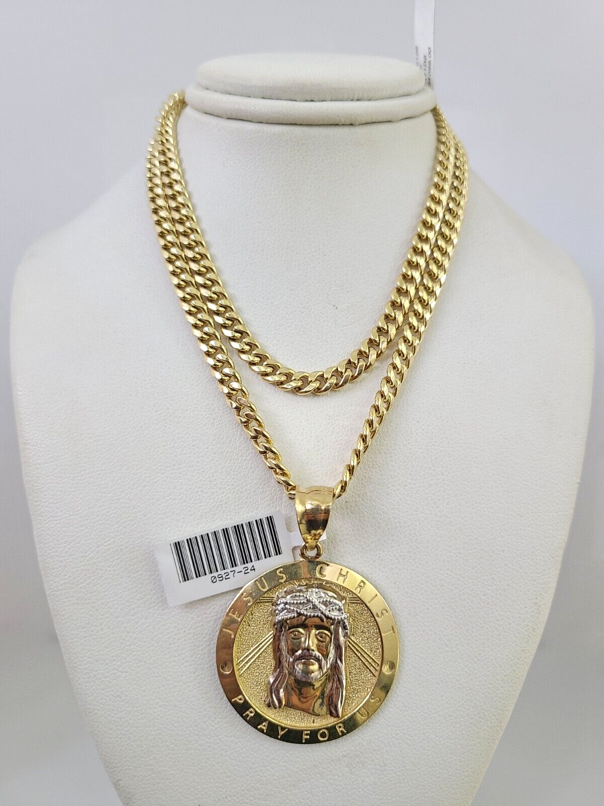 Genuine 10 k Yellow Gold Miami Cuban Necklace 5mm Chain with Jesus Christ Charm. The Various length of the Chain are 18"-28" with Jesus Christ Charm. The pendants are unique in design and considered durable too. If you are not happy with the way it looks or feels, we do offer 30 - Days FREE Return shipping. Contact us for more information.