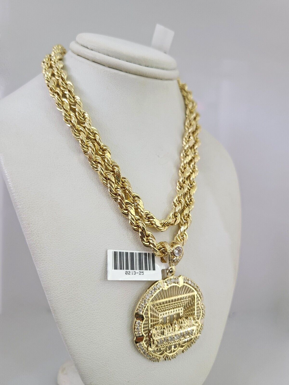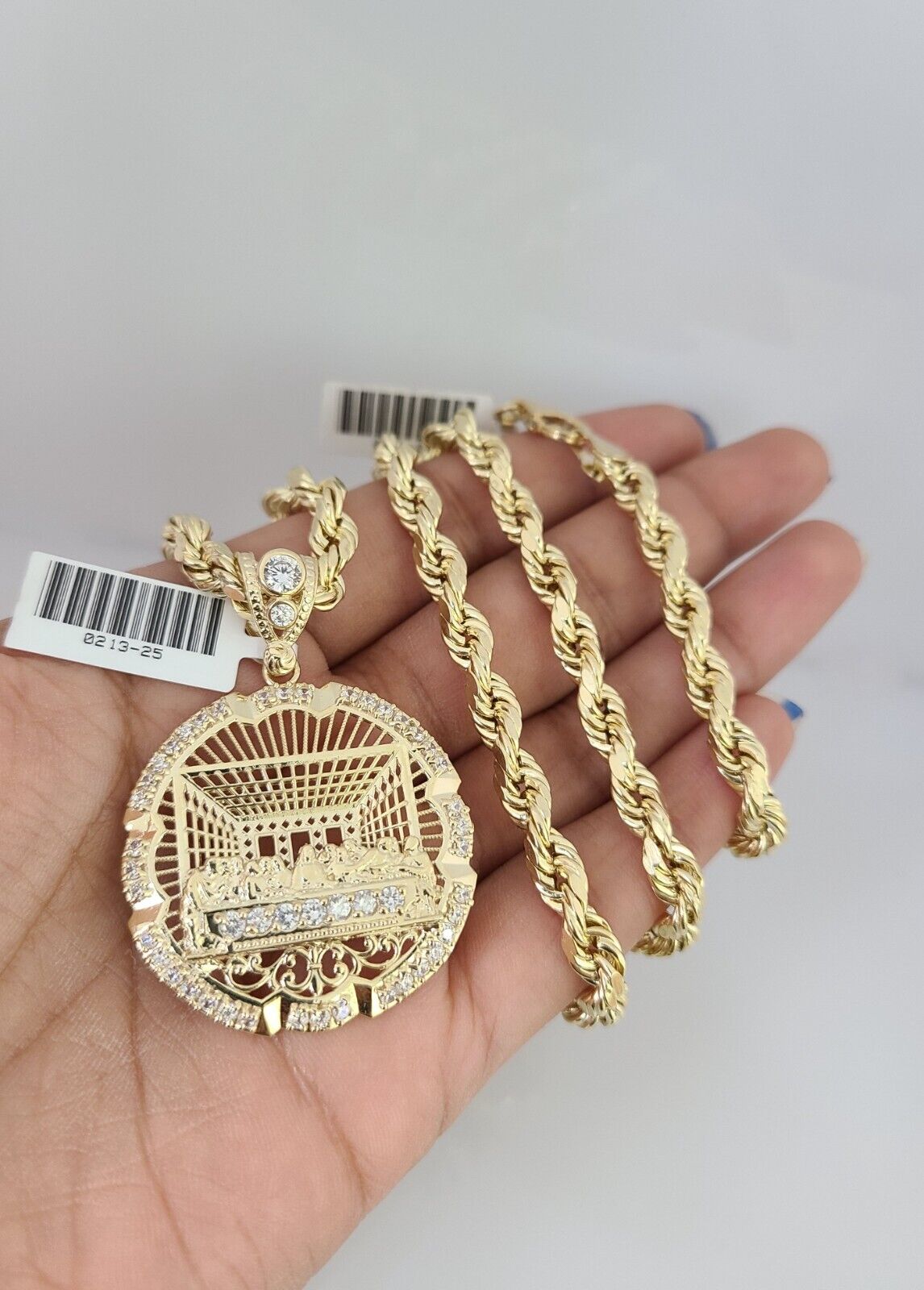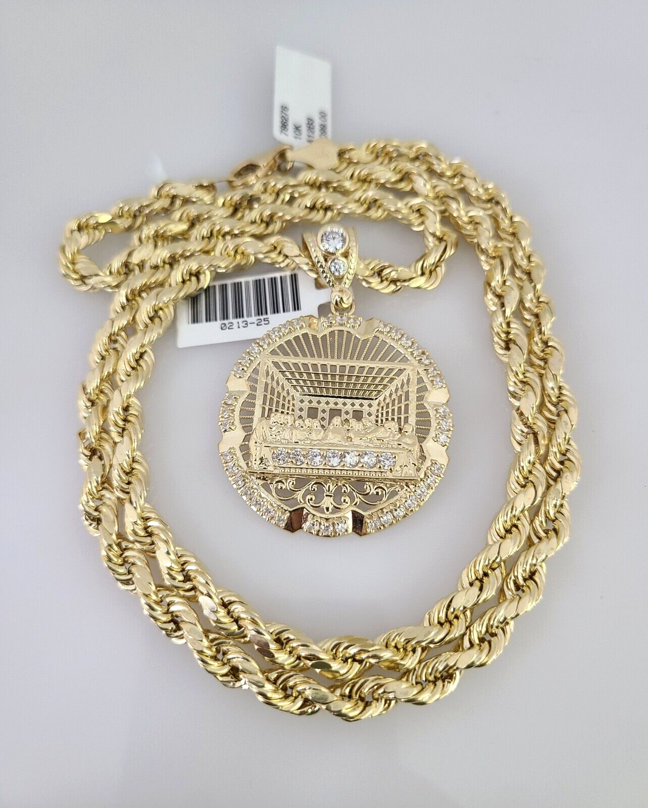 Genuine 10k Yellow Gold Rope Chain 18-30 Inch 6mm Necklace with Last Supper Charm design as a SET. The Various length of the Chain are 18-30 Inches. If you are not happy with the way it looks or feels, we do offer 30 - Days FREE Return shipping. Contact us for more information.