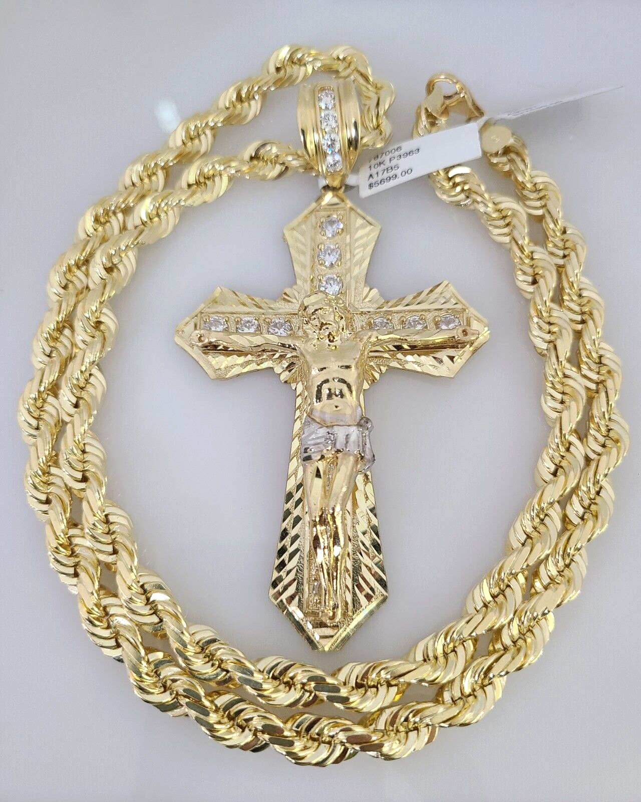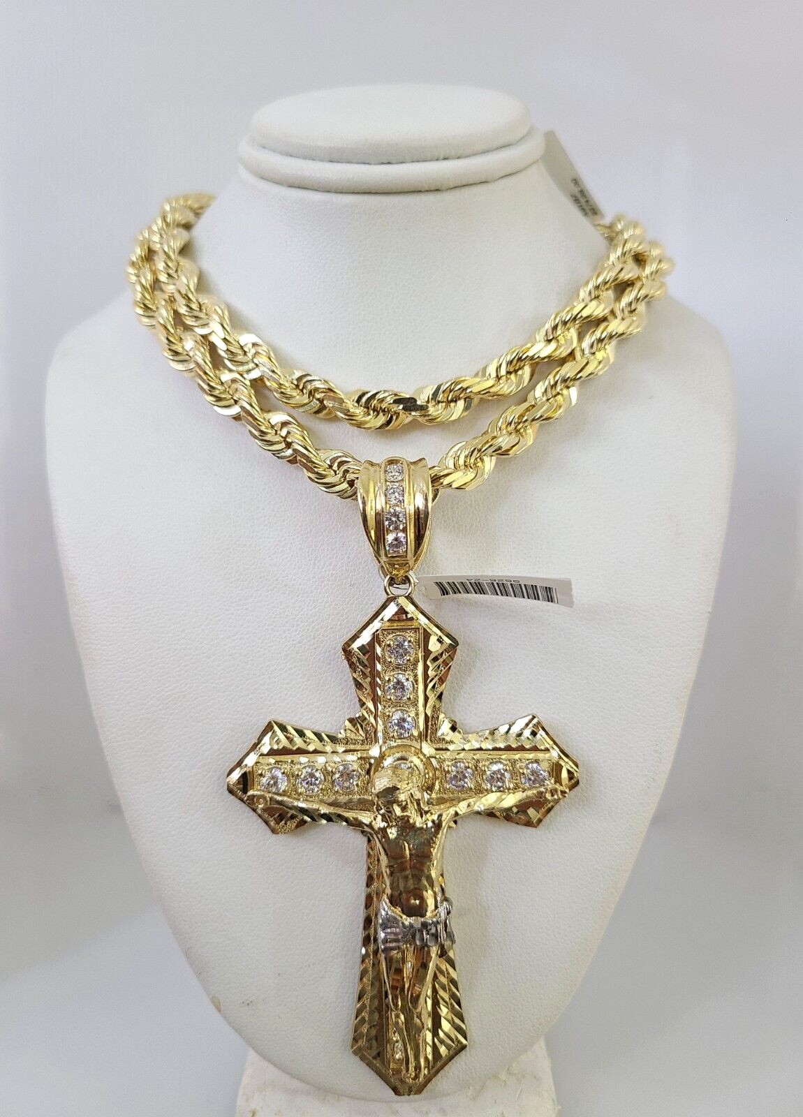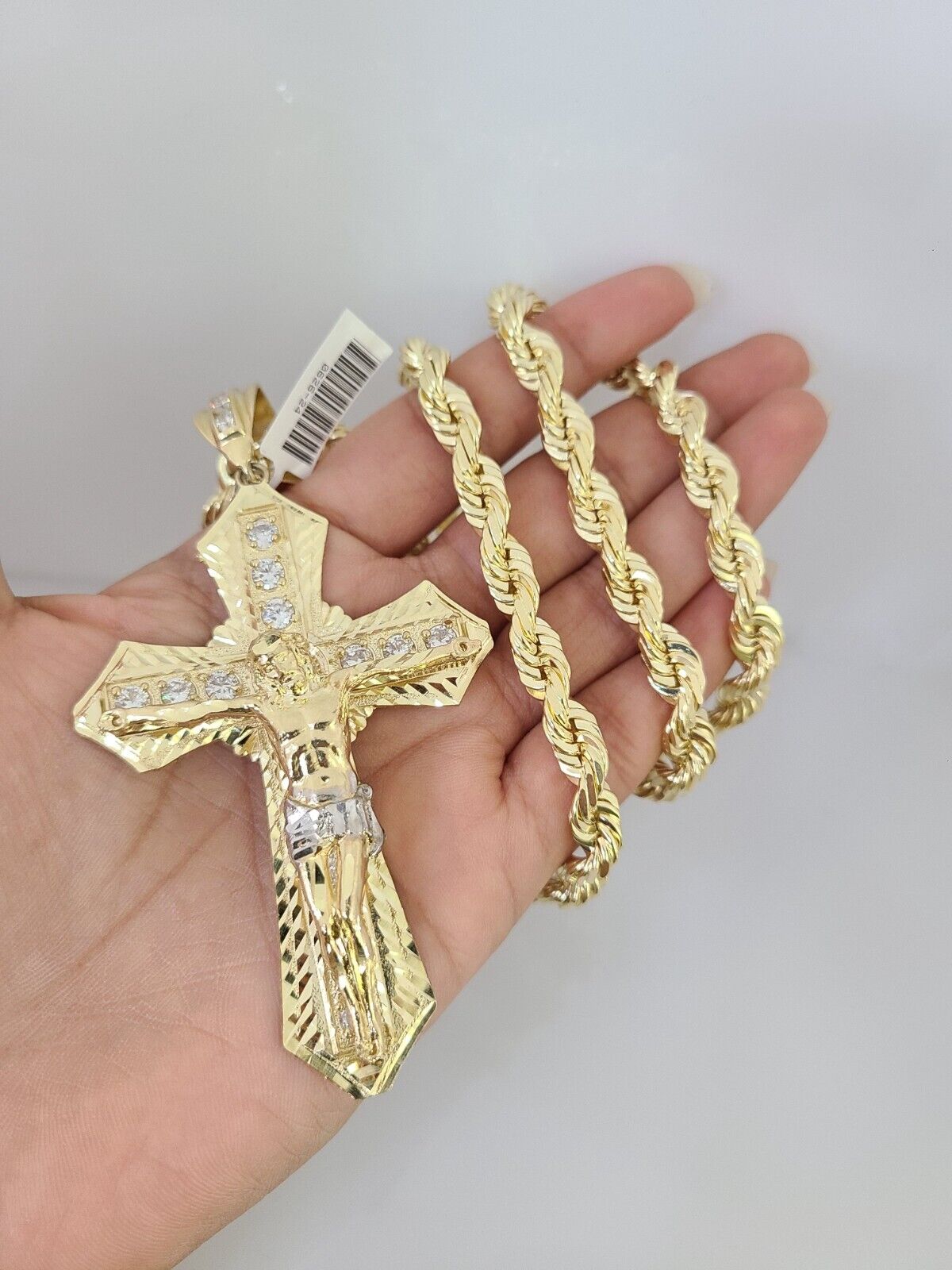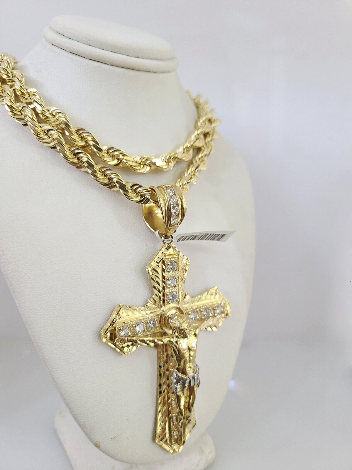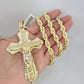 10kt Gold Solid Rope Chain Jesus Cross Charm Set 18"-30'' Inch 7mm Pendant