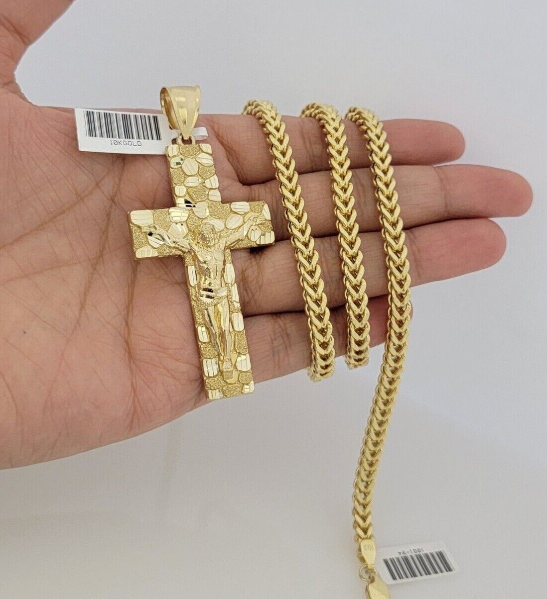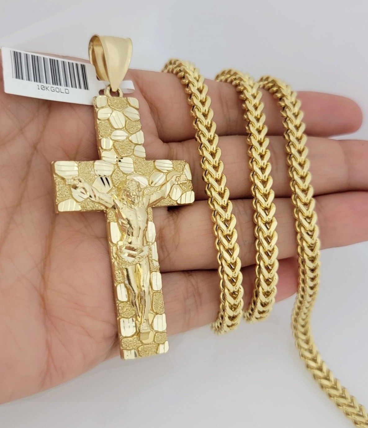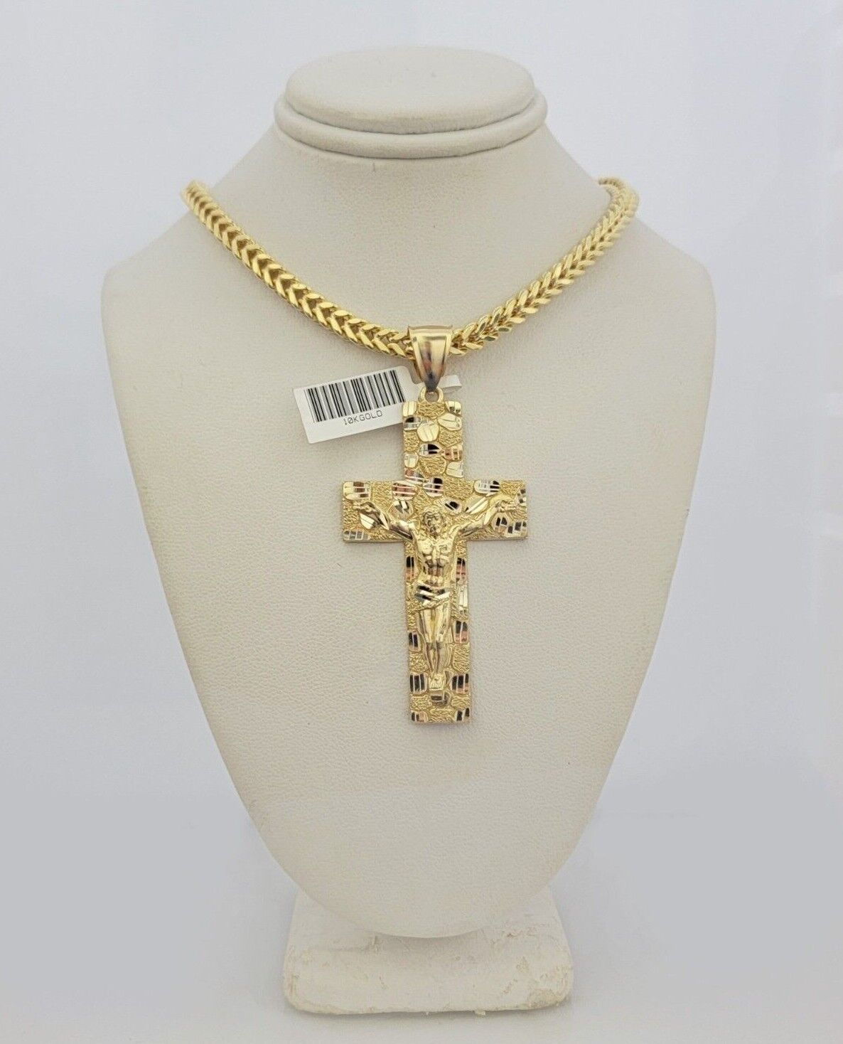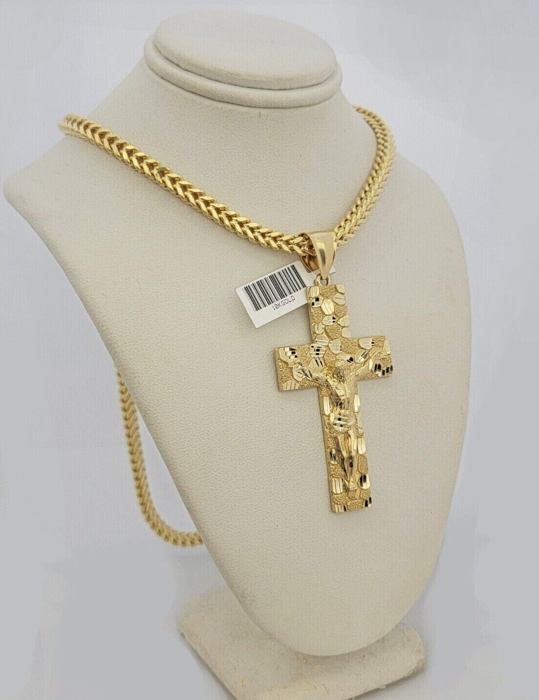 Genuine 10 k Yellow Gold Franco Necklace 5mm Chain With Nugget Cross Charm. The Various length of the Chain are 20"-26" with Nugget Cross Charm 2.5 inches (approx.). The pendants are unique in design and considered durable too. If you are not happy with the way it looks or feels, we do offer 30 - Days FREE Return shipping. Contact us for more information.