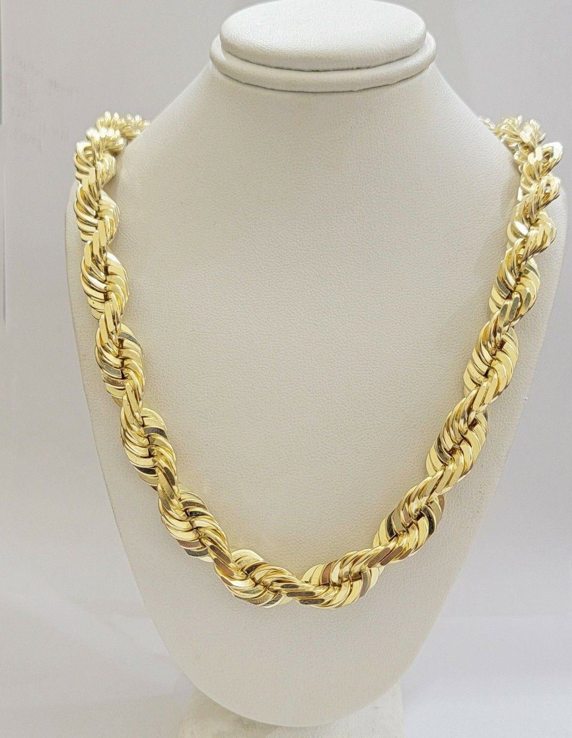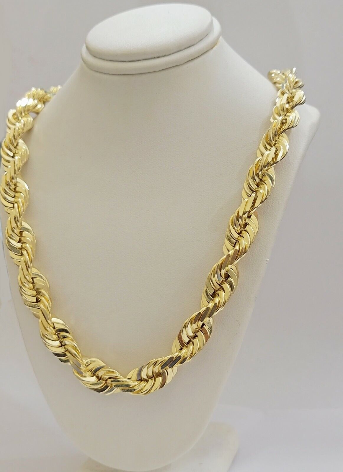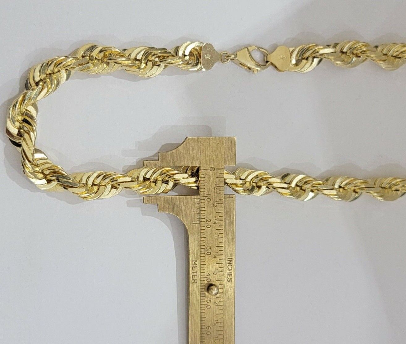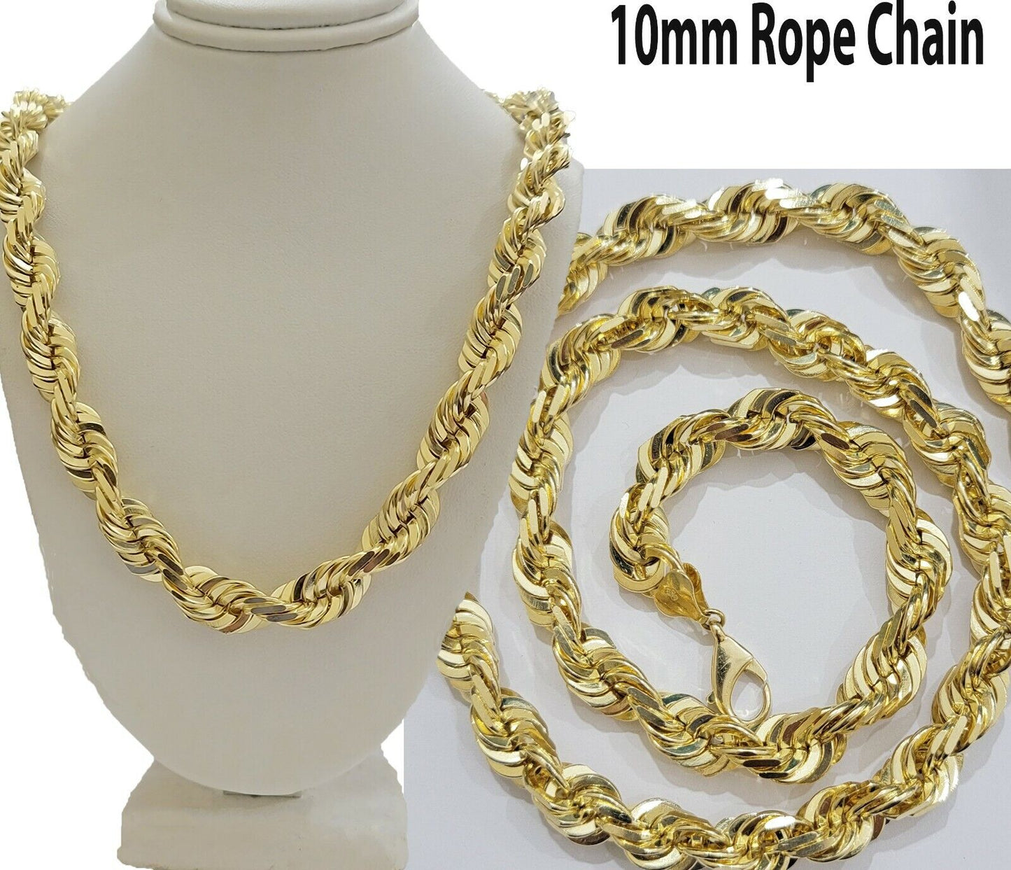 Solid (heavy ) Real 10 k Yellow Gold Rope Men's chain. The Width of the necklace is 10 MM (approx.) and Length 22 Inches with clasp. The Clasp is lobster. The chain can be worn with the pendants and it is very steady. The necklace is 100% guaranteed 10k yellow gold and have been professionally tested and stamped 10k for purity authenticity. The chain is Strong and steady because of its thickness and weight. We guarantee the purity of the gold to be 10k, and the chains are NOT GOLD PLATED, NOT FILLED.