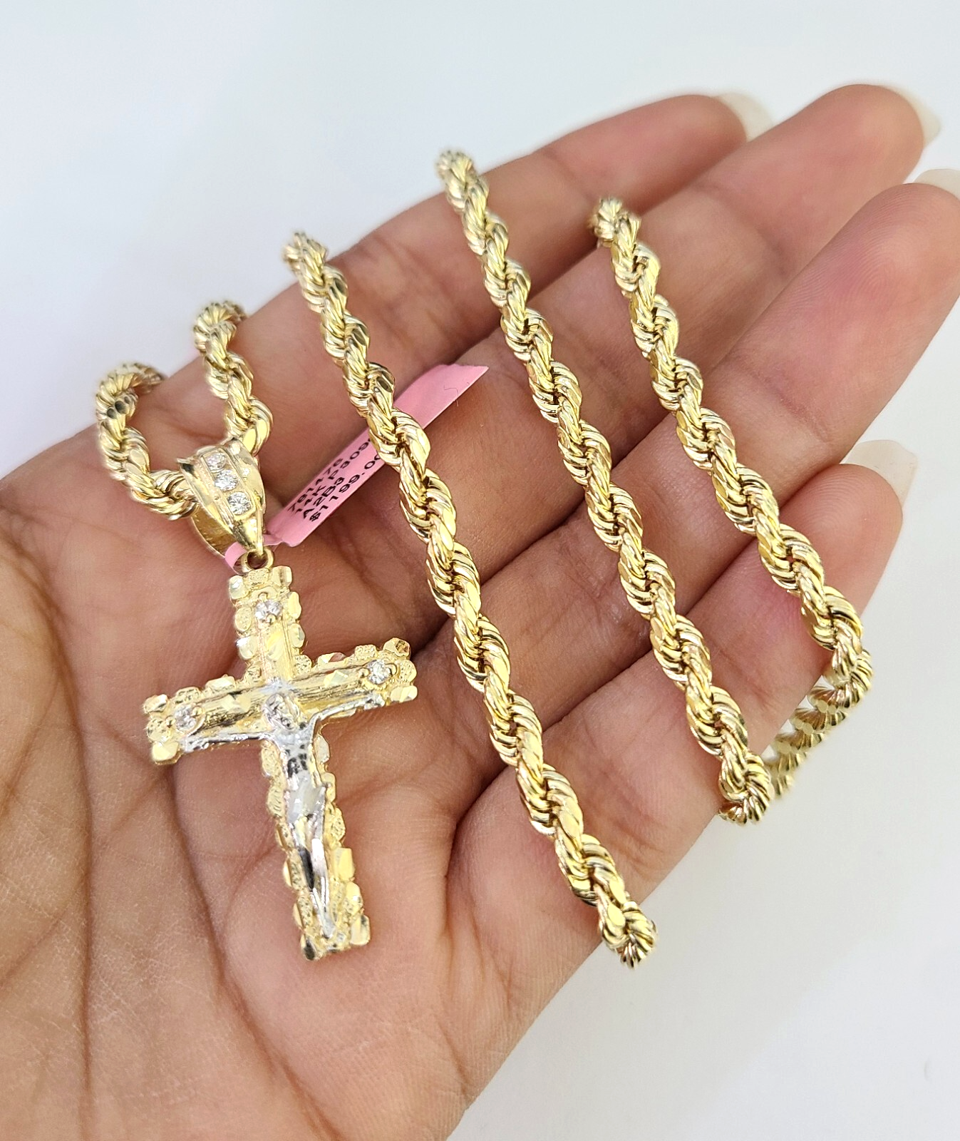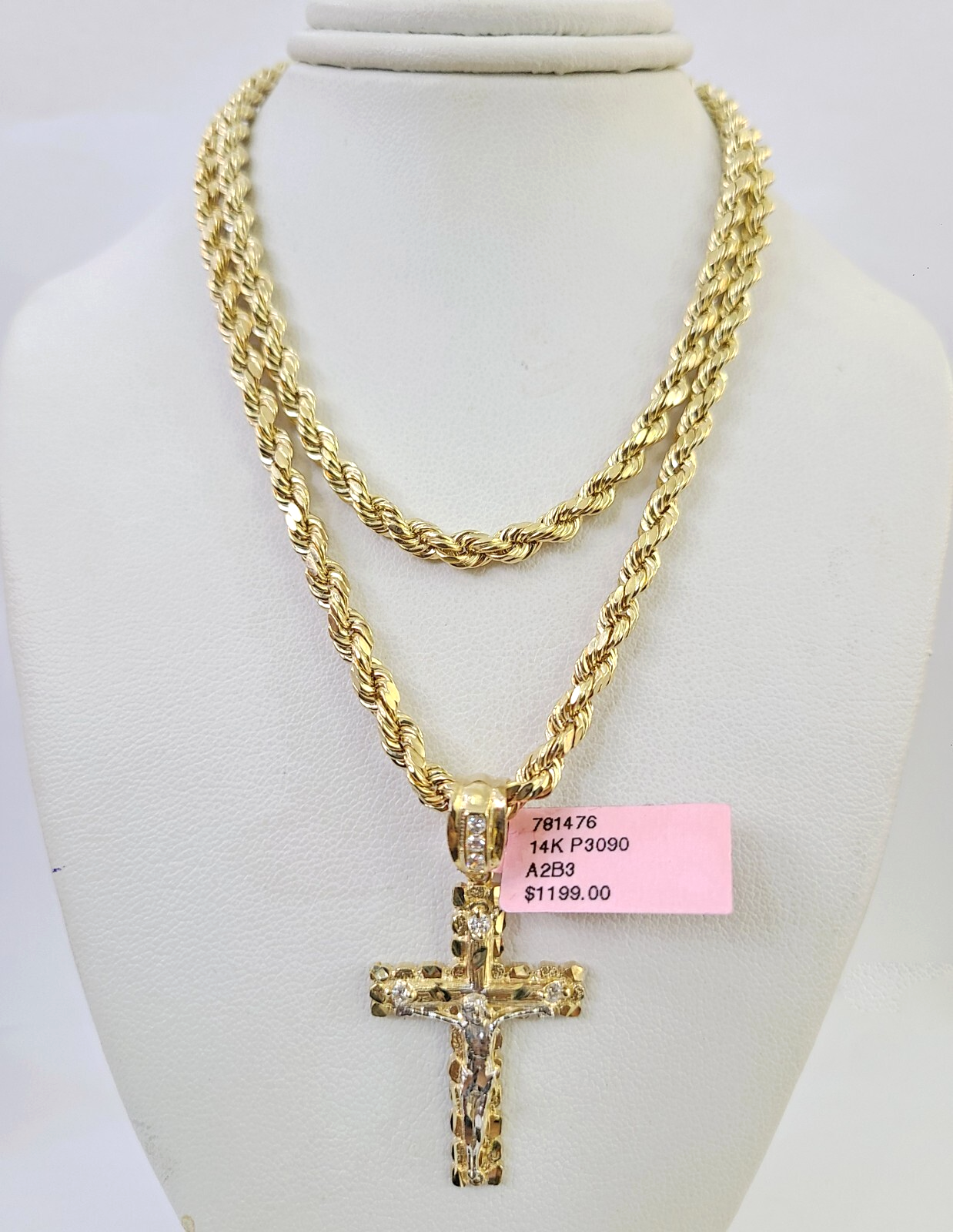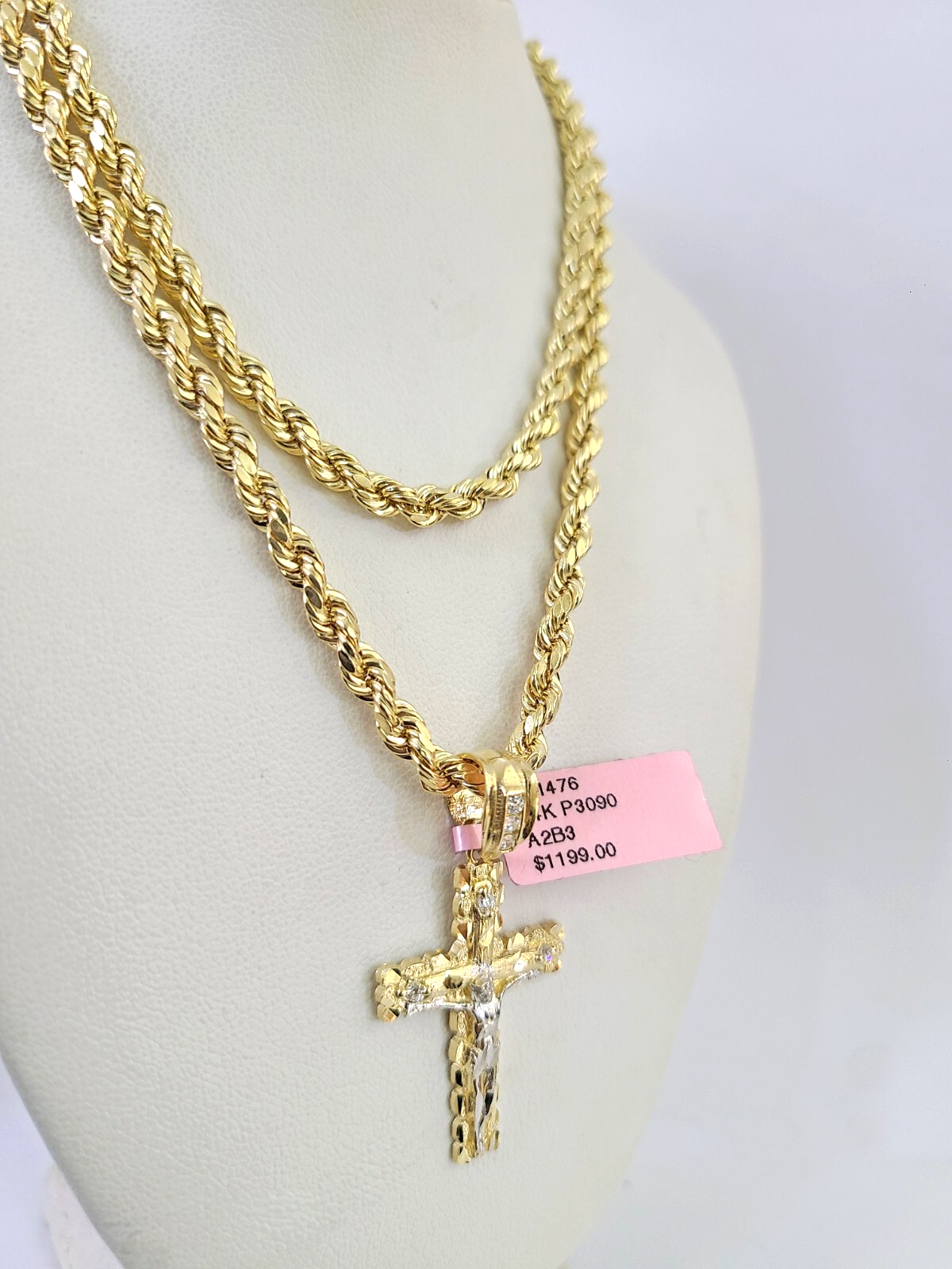 Genuine 14k Yellow Gold Rope Chain 4mm With Nugget Cross design. The Various length of the Chain are 20"-30" with Jesus Cross Charm. The pendants are unique in design and considered durable too. If you are not happy with the way it looks or feels, we do offer 30 - Days FREE Return shipping. Contact us for more information.