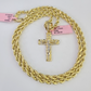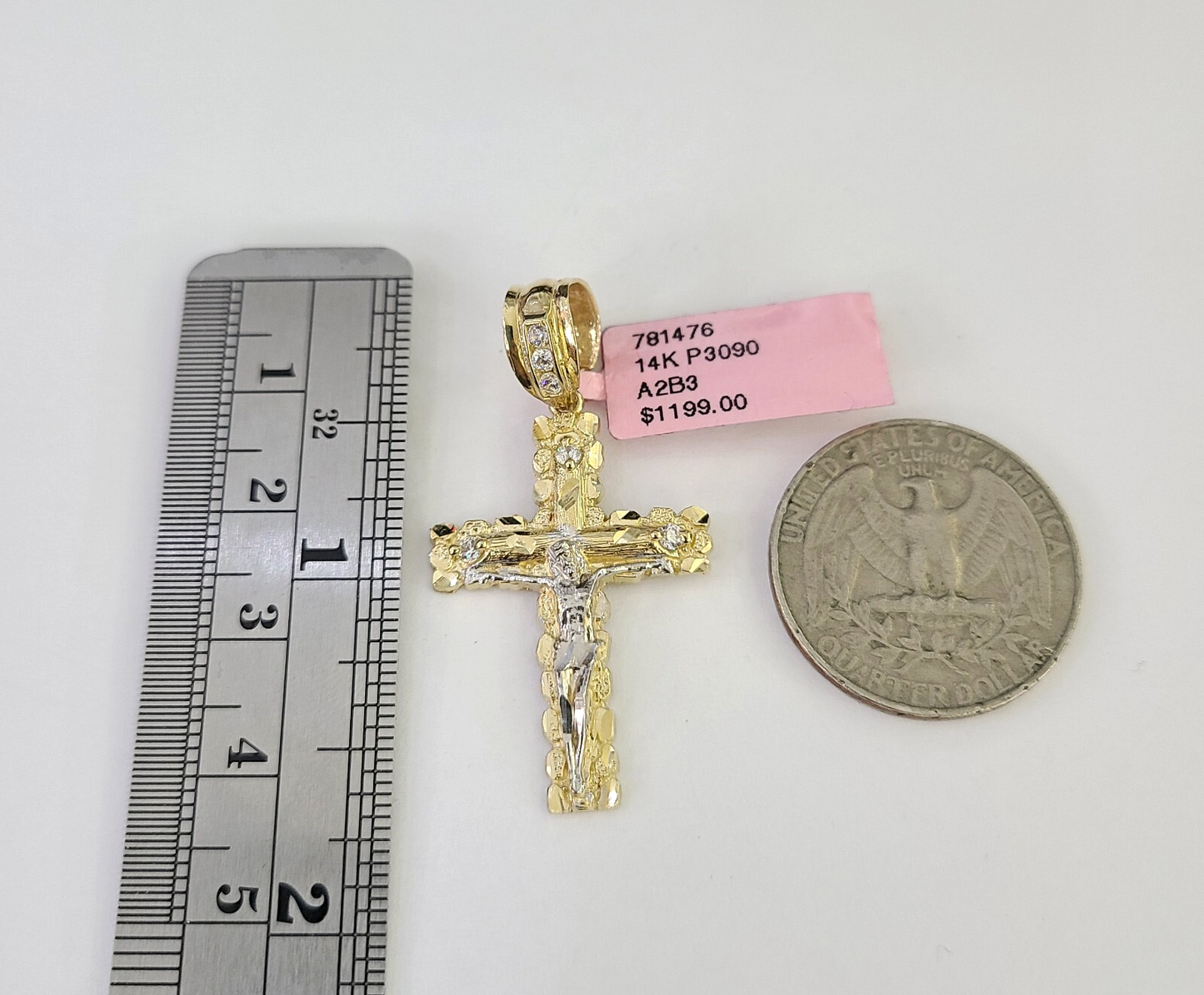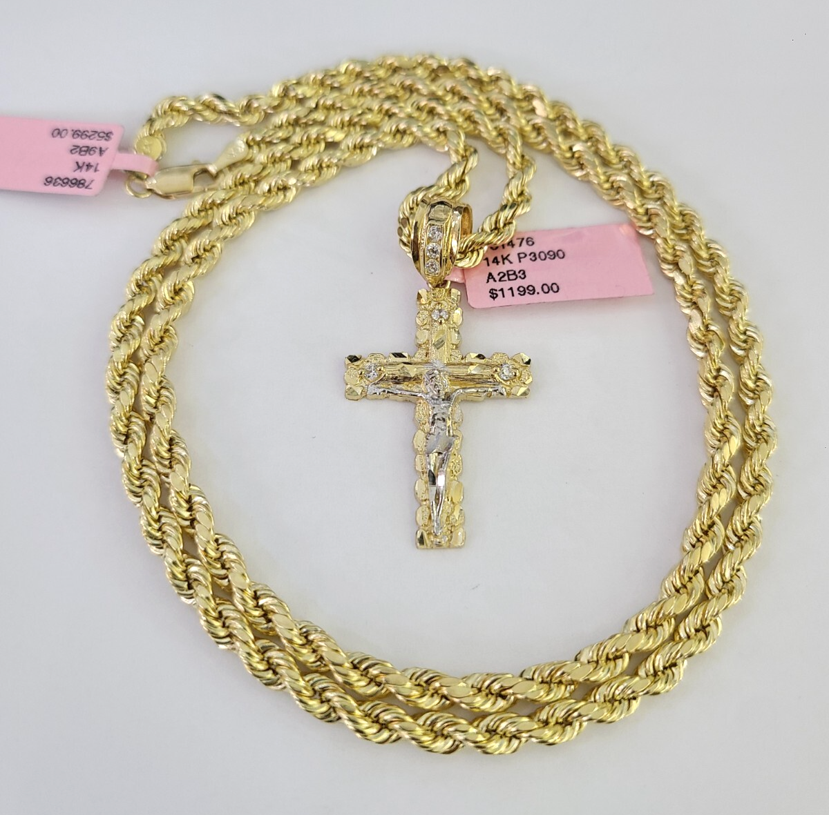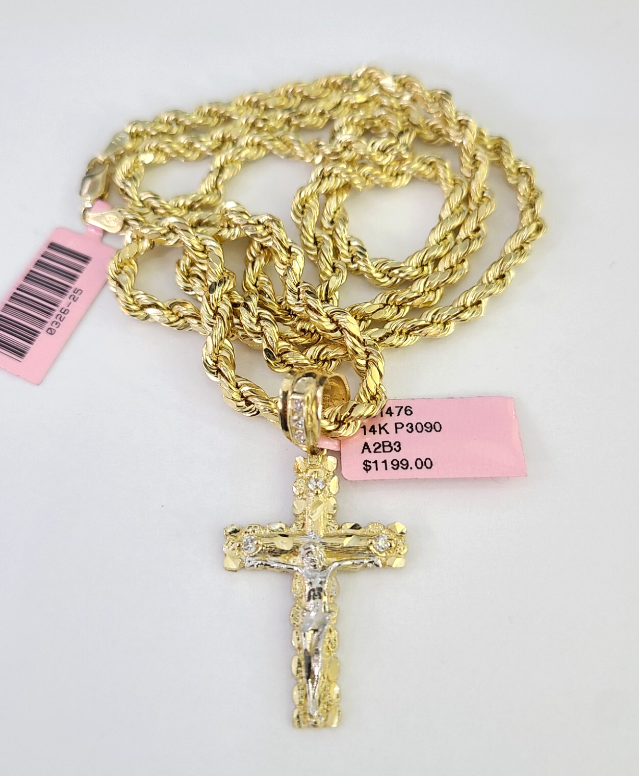 Genuine 14k Yellow Gold Rope Chain 4mm With Nugget Cross design. The Various length of the Chain are 20"-30" with Jesus Cross Charm. The pendants are unique in design and considered durable too. If you are not happy with the way it looks or feels, we do offer 30 - Days FREE Return shipping. Contact us for more information.