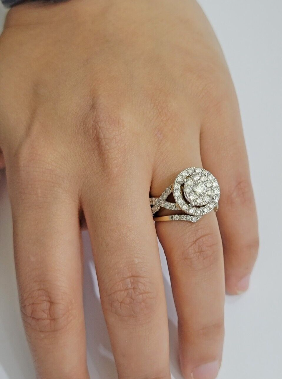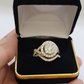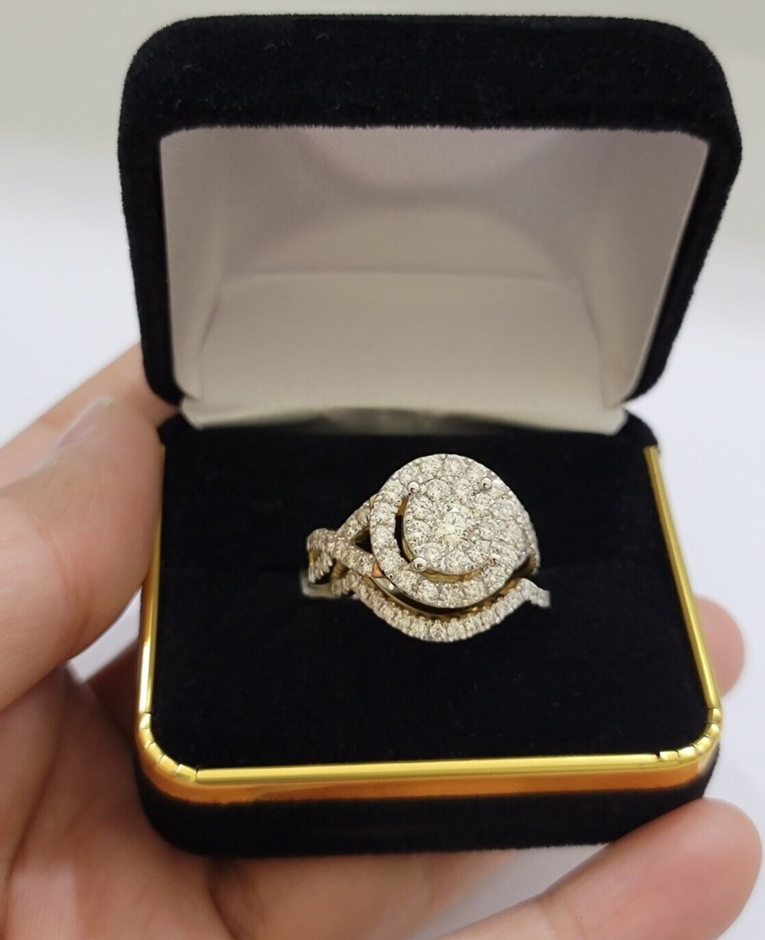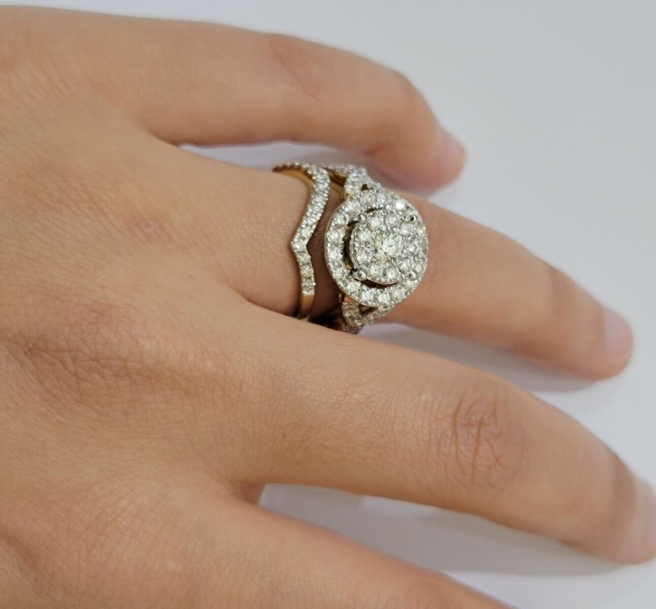 Real 14 K Yellow gold and Real 2 Ct Diamond Ring AND Band set for Ladies. It has a Ring with two bands on side. It has Round, Very Good Quality Diamonds I1-I2. The Diamonds are Excellent Cut. It flaunts Extra ordinary Bridal Set design ring. It comes with standard size 7/8, and the ring is sizable. Sizing the ring will cost you extra $29.99 on your demand.