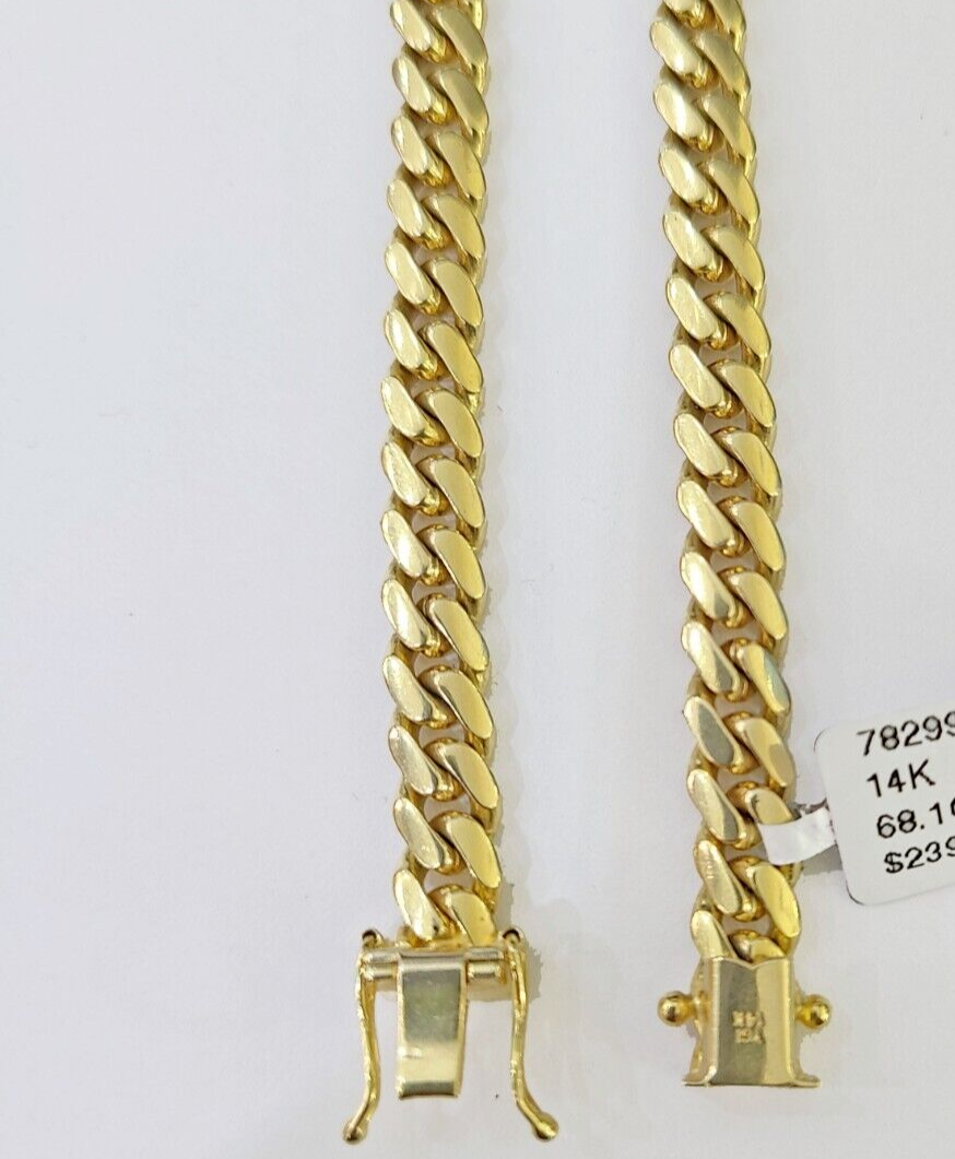 Solid 14 KT Yellow Gold ( Real , Not plated , Not filled ) Miami Cuban Cuban Link chain. The Width of the necklace is 6 MM in Length 26 Inches. The Clasp is Box Lock. The chain is considered durable because is is Heavy Solid with approximately 68-70 grams (approx.) . If you are not happy with the way it looks or feels, we do offer