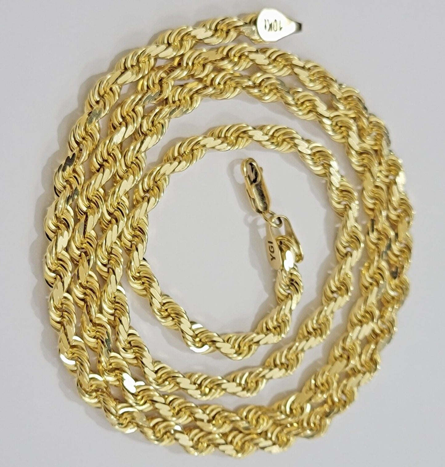 Solid (heavy ) Real 10 k Yellow Gold Rope Men's chain Necklace diamond cuts. The Width of the necklace is 6 MM (approx.) and Length 20 Inch. The Clasp is lobster. The chain can be worn with the pendants and it is very steady . If you are not happy with the way it looks or feels, we do offer FREE Return shipping. Contact us for more information.