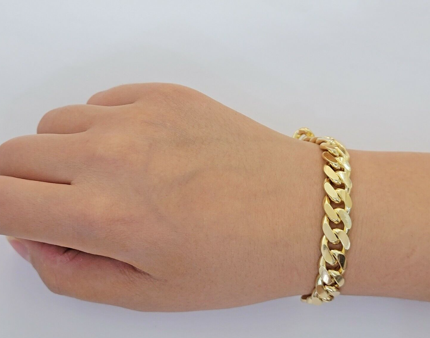 SOLID 10 K Yellow Gold ( Real , Not plated , Not filled ) Miami Cuban-Link Bracelet For Men's. The Width of the Bracelet is 11 mm (approx.) and 9 Inch Long . The Clasp is Box Lock which is strong and safe lock for the bracelet. The bracelet is beautiful designed with Cuban-Link style. If you are not happy with the way it looks or feels, we do offer free return. Buyers need to make sure that the return item has to be in its original sent/ brand new condition with original tag attached. Violation in return policy might result in negative consequence.