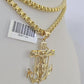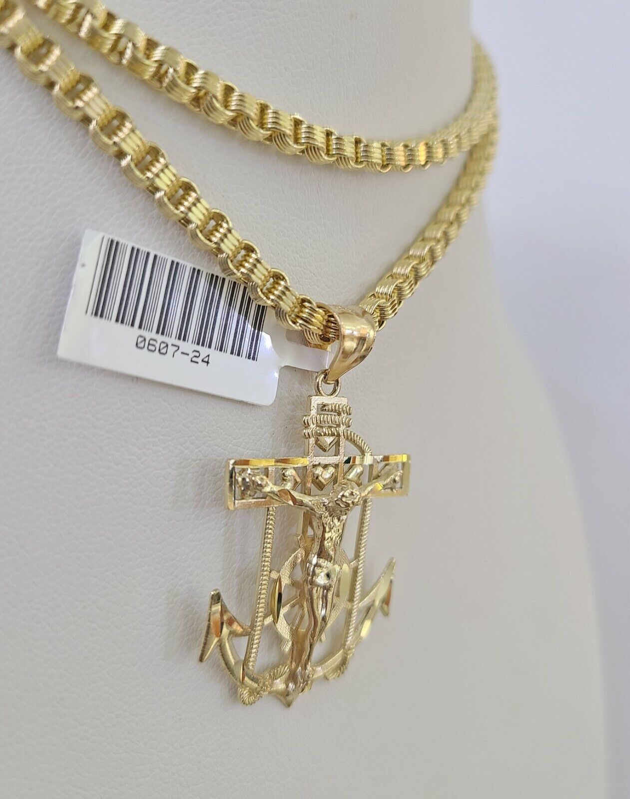 Real 10k Gold Box Byzantine Necklace Jesus Anchor Charm SET Chain 3mm 24" Inches