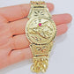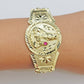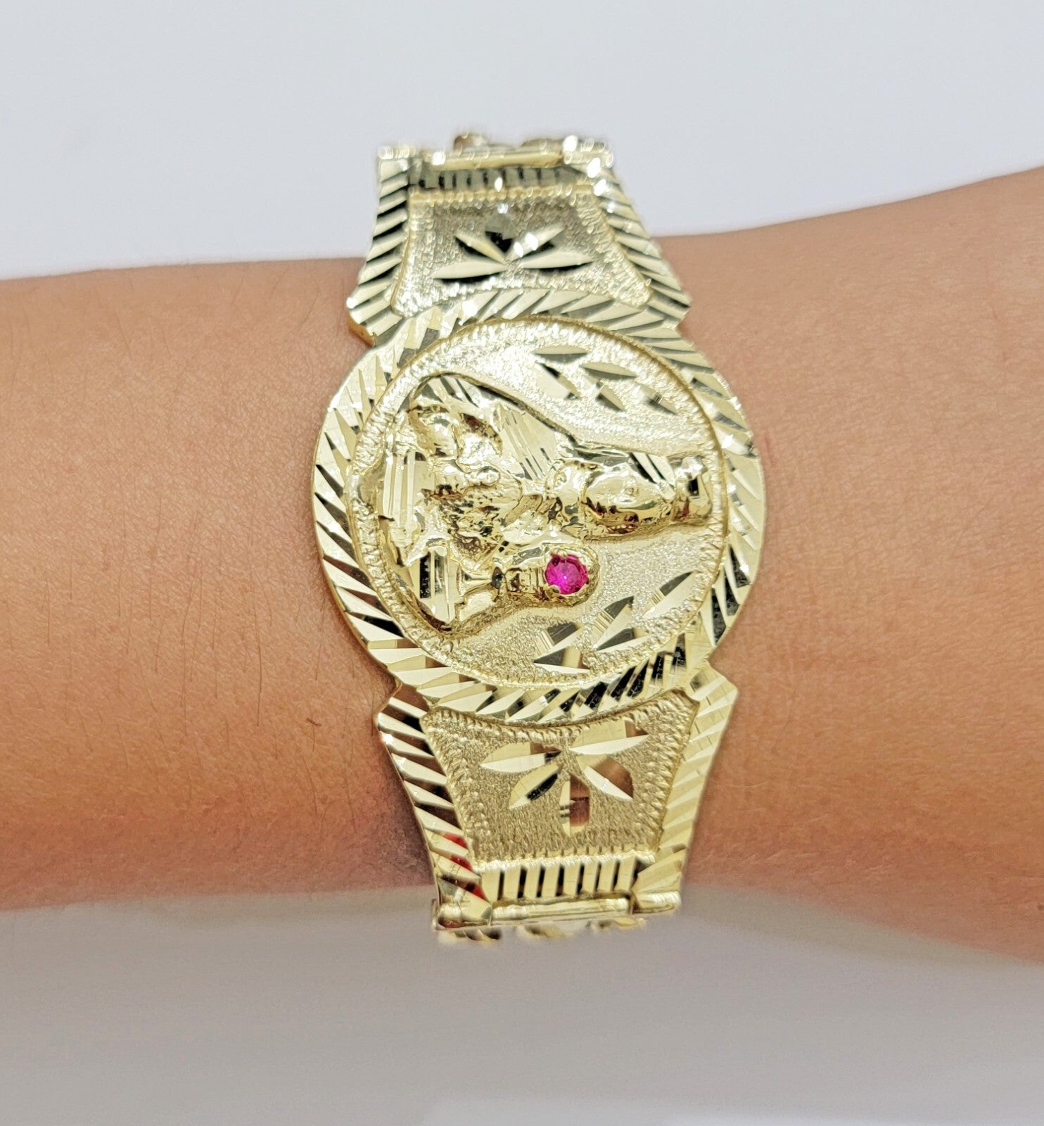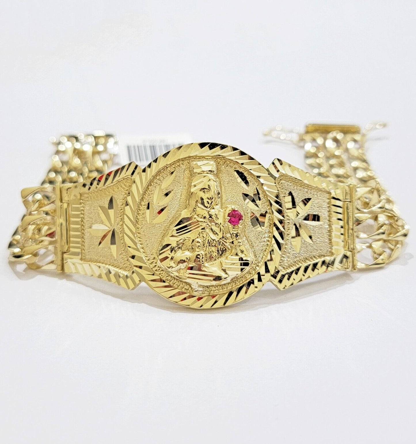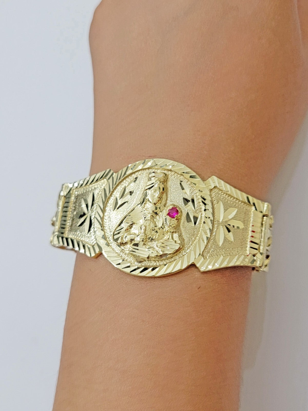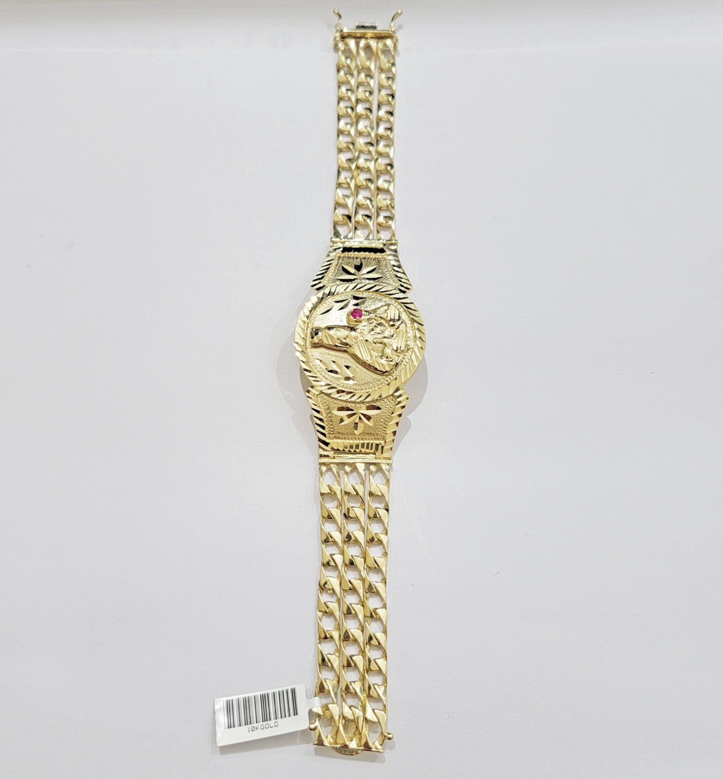 10 k Yellow Gold ( Real , Not plated , Not filled ) Bracelet, For men's . The Width of the Bracelet is 15-17 MM and 8 Inches Long. The Clasp is Box Lock. The Bracelet is considered durable. The Bracelet is 100% guaranteed 10k yellow gold and have been professionally tested and stamped 10k for purity authenticity. The Bracelet feels light weight but the main face Feels Very heavy. We guarantee the purity of the gold to be 10k, and the Bracelet are NOT GOLD PLATED, NOT FILLED. If you are not happy with the way it looks or feels, we do offer FREE Return shipping.